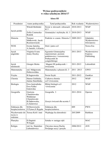 Wykaz podręczników w roku szkolnym 2016/17 klasa III Przedmiot Autor podręcznika Tytuł podręcznika Rok wydania Wydawnictwo Witold Bobiński Świat w słowach i obrazach 2010-2013 kl 3 WSiP Zofia CzarneckaRodzik Gramatyka i stylistyka. kl. 3 2010-2013 WSiP Historia Tomasz Małkowski, Jacek Rześniowiecki Podróże w czasie. Historia 3 2009-2013 Gdańskie Wydawnictwo Oświatowe WOS Iwona Janicka, Dziś i jutro cz2 A.Janicki, A.Kucia Język angielski Virginia Evans Jenny Dooley Egzamin Gimnazjalny repetytorium poziom podstawowy i rozszerzony Podręcznik do j.angielskiego 2011-2013 Wydawnictwo Express Publishing Język niemiecki Giorgio Motta Magnet III podręcznik + ćwiczenia 2011-2013 Lektorklett Matematyka red. Małgorzata Dobrowolska Matematyka z plusem kl. 3 2011 -2013 GWO Fizyka B.Sagnowska Świat fizyki 2011-2012 ZamKor Chemia Hanna Gulińska, Janina Smolińska Ciekawa chemia cz3+ćwiczenia 2012 WSiP Biologia Ewa Jastrzębska Ewa PyłkaGutowska Bliżej biologii cz3 +ćwiczenia 2012 WSiP Geografia Grażyna Chmielewska Waldemar Chmielewski B.Dąbrowska, Z.Zaniewicz Geografia 3 2011-2014 Operon Edukacja dla M.Borowiecki, Edukacja dla bezpieczeństwa Z.Pytasz,E.Rygała bezpieczeństwa 009 PWN Wychowanie do Teresa Król i inni życia w rodzinie Wędrując ku dorosłości 205/2009 Rubikon Plastyka D.Stępień W.Sygut Sztuka w zasięgu ręki Religia red. ks. Stanisław Łabendowicz Chrystus mocą Ducha Świętego uczy i posyła Język polski Nowa Era Zeszyt ćwiczeń dla ucznia 3 MAC 2006/2012 AVE
