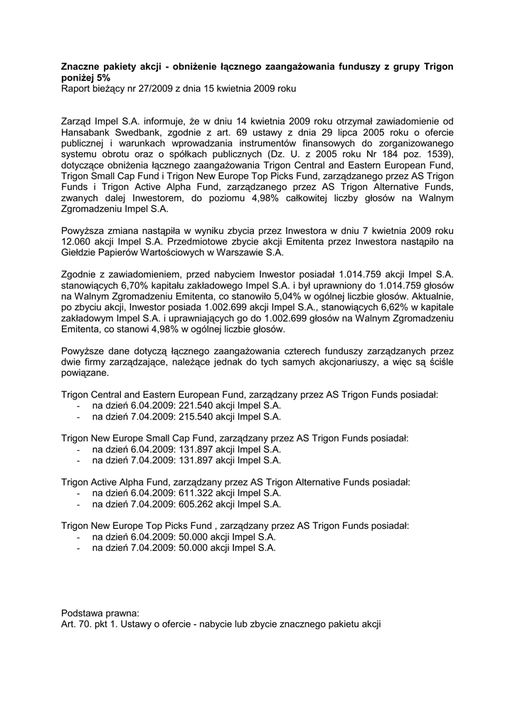Znaczne pakiety akcji - obniŜenie łącznego zaangaŜowania funduszy z grupy Trigon poniŜej 5% Raport bieŜący nr 27/2009 z dnia 15 kwietnia 2009 roku Zarząd Impel S.A. informuje, Ŝe w dniu 14 kwietnia 2009 roku otrzymał zawiadomienie od Hansabank Swedbank, zgodnie z art. 69 ustawy z dnia 29 lipca 2005 roku o ofercie publicznej i warunkach wprowadzania instrumentów finansowych do zorganizowanego systemu obrotu oraz o spółkach publicznych (Dz. U. z 2005 roku Nr 184 poz. 1539), dotyczące obniŜenia łącznego zaangaŜowania Trigon Central and Eastern European Fund, Trigon Small Cap Fund i Trigon New Europe Top Picks Fund, zarządzanego przez AS Trigon Funds i Trigon Active Alpha Fund, zarządzanego przez AS Trigon Alternative Funds, zwanych dalej Inwestorem, do poziomu 4,98% całkowitej liczby głosów na Walnym Zgromadzeniu Impel S.A. PowyŜsza zmiana nastąpiła w wyniku zbycia przez Inwestora w dniu 7 kwietnia 2009 roku 12.060 akcji Impel S.A. Przedmiotowe zbycie akcji Emitenta przez Inwestora nastąpiło na Giełdzie Papierów Wartościowych w Warszawie S.A. Zgodnie z zawiadomieniem, przed nabyciem Inwestor posiadał 1.014.759 akcji Impel S.A. stanowiących 6,70% kapitału zakładowego Impel S.A. i był uprawniony do 1.014.759 głosów na Walnym Zgromadzeniu Emitenta, co stanowiło 5,04% w ogólnej liczbie głosów. Aktualnie, po zbyciu akcji, Inwestor posiada 1.002.699 akcji Impel S.A., stanowiących 6,62% w kapitale zakładowym Impel S.A. i uprawniających go do 1.002.699 głosów na Walnym Zgromadzeniu Emitenta, co stanowi 4,98% w ogólnej liczbie głosów. PowyŜsze dane dotyczą łącznego zaangaŜowania czterech funduszy zarządzanych przez dwie firmy zarządzające, naleŜące jednak do tych samych akcjonariuszy, a więc są ściśle powiązane. Trigon Central and Eastern European Fund, zarządzany przez AS Trigon Funds posiadał: - na dzień 6.04.2009: 221.540 akcji Impel S.A. - na dzień 7.04.2009: 215.540 akcji Impel S.A. Trigon New Europe Small Cap Fund, zarządzany przez AS Trigon Funds posiadał: - na dzień 6.04.2009: 131.897 akcji Impel S.A. - na dzień 7.04.2009: 131.897 akcji Impel S.A. Trigon Active Alpha Fund, zarządzany przez AS Trigon Alternative Funds posiadał: - na dzień 6.04.2009: 611.322 akcji Impel S.A. - na dzień 7.04.2009: 605.262 akcji Impel S.A. Trigon New Europe Top Picks Fund , zarządzany przez AS Trigon Funds posiadał: - na dzień 6.04.2009: 50.000 akcji Impel S.A. - na dzień 7.04.2009: 50.000 akcji Impel S.A. Podstawa prawna: Art. 70. pkt 1. Ustawy o ofercie - nabycie lub zbycie znacznego pakietu akcji