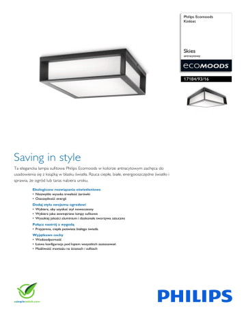 Philips Ecomoods Kinkiet Skies antracytowy 17184/93/16 Saving in style Ta elegancka lampa sufitowa Philips Ecomoods w kolorze antracytowym zachęca do usadowienia się z książką w blasku światła. Rzuca ciepłe, białe, energooszczędne światło i sprawia, że ogród lub taras nabiera uroku. Ekologiczne rozwiązania oświetleniowe • Niezwykle wysoka trwałość żarówki • Oszczędność energii Dodaj stylu swojemu ogrodowi • Wybierz, aby uzyskać styl nowoczesny • Wybierz jako zewnętrzne lampy sufitowe • Wysokiej jakości aluminium i doskonałe tworzywa sztuczne Połącz nastrój z wygodą • Przyjemna, ciepła poświata białego światła Wyjątkowe cechy • Wodoodporność • Łatwa konfiguracja pod kątem wszystkich zastosowań • Możliwość montażu na ścianach i sufitach 171849316 Kinkiet Skies antracytowy Zalety Niezwykle wysoka trwałość żarówki czas. Została wykonana z wysokiej jakości odlewanego aluminium i doskonałych tworzyw sztucznych. Wodoodporność Łatwa konfiguracja Lampa i elementy montażowe są zaprojektowane tak, by instalacja przebiegała sprawnie. Wszystkie rzeczy potrzebne do instalacji, jak klucz i śruby typu Torx, są w opakowaniu. W instrukcji znajdziesz przejrzyste wskazówki dotyczące instalacji produktu i inne ważne informacje, jak poziom wodoodporności IP. Montaż na ścianie i suficie W zestawie żarówka firmy Philips o niezwykłej trwałości — do 20 000 godzin użytkowania. Oszczędność energii Ta lampa Philips została zaprojektowana pod kątem wilgotnych miejsc i przeszła rygorystyczne testy, które potwierdziły jej odporność na wodę. Poziom IP określają dwie liczby: pierwsza to poziom ochrony przeciw kurzowi, a druga przeciw wodzie. Poziom IP44 oznacza, że jest odporna na zachlapania. To czyni z niej idealną lampę do zastosowań zewnętrznych. Ta lampa firmy Philips zużywa mniej energii niż tradycyjne źródła światła, co pozwala zmniejszyć rachunki za prąd i przyczynia się do ochrony środowiska. Tę lampę można zamontować na ścianie lub na suficie — w zależności od potrzeb. Przyjemne i ciepłe białe światło Wybierz, aby uzyskać styl nowoczesny Ta zaprojektowana w Europie lampa o unikatowym wzorze pozwala osiągnąć nowoczesny efekt na zewnątrz. Wybierz jako lampy sufitowe Dzięki tej zewnętrznej lampie sufitowej maksymalnie wykorzystasz przestrzeń. Jest idealna do oświetlania wejść lub tarasów. Najwyższej jakości materiały Ta lampa Philips została zaprojektowana specjalnie do zastosowań zewnętrznych. Jest trwała i będzie oświetlać ogród przez długi Ecomoods Outdoor to seria lamp zewnętrznych firmy Philips emitujących przyjemne, ciepłe światło o temperaturze barwowej 2700 K. Zapewniają one również doskonałą widoczność, pozwalając bezpiecznie spędzać czas pod gołym niebem i odprężyć się po ciężkim dniu ze świadomością, że Twój teren będzie bezpieczny przez całą noc. Zielone logo firmy Philips. „Zielone” produkty firmy Philips zapewniają niższe zużycie energii i mniejszą emisję dwutlenku węgla. Jak? Oferują one znacznie lepsze rozwiązania środowiskowe w jednym lub kilku obszarach ekologicznych firmy Philips: wydajności energetycznej, opakowaniu, wykorzystaniu niebezpiecznych substancji, wadze, recyklingu i wyrzucaniu zużytych produktów oraz trwałości. 171849316 Kinkiet Skies antracytowy Dane techniczne Stylistyka i wykończenie • Materiał: syntetyk, aluminium • Kolor: antracytowy Dodatkowe funkcje/akcesoria w zestawie • Odporność na warunki pogodowe • Doskonale nadaje się do instalacji na ścianie i suficie Wymiary i waga produktu • • • • Wysokość: 8,1 cm Długość: 26 cm Szerokość: 26 cm Waga netto: 1,000 kg Serwis • Gwarancja: 2 lata Dane techniczne • • • • • • • • • • • Wbudowane źródło światła LED: NIE • Klasa energetyczna dołączonego źródła światła: A • Oprawa jest zgodna ze źródłami światła klasy: A+ do E • Współczynnik IP: IP44, ochrona przed przedmiotami powyżej 1 mm, ochrona przed rozchlapaną wodą • Klasa ochronności: II — podwójna izolacja • Źródło światła odpowiadające tradycyjnej żarówce o mocy: 65 W • Moc strumienia świetlnego dołączonego źródła światła w lumenach: 810 lm Zasilanie sieciowe: Przedział 220–240 V, 50–60 Hz Technologia źródła światła: fluorescencyjne, 230 V Liczba źródeł światła: 2 Trzonek: E27 Moc źródła światła w zestawie: 14 W Maksymalna moc wymiennego źródła światła: 14 W Barwa światła: ciepła biel Maksymalna trwałość źródła światła: 10 000 godz. Oprawa z możliwością przyciemniania: Nie LED: Nie Wymiary i waga opakowania • • • • Wysokość: 27,9 cm Długość: 27,4 cm Szerokość: 9,5 cm Waga: 1,240 kg Różne • Opracowano z myślą o: Ogród i patio • Styl: Nowoczesne • Typ: Kinkiet • Data wydania 2015-09-14 © 2015 Koninklijke Philips N.V. Wszelkie prawa zastrzeżone. Wersja: 2.0.1 Dane techniczne mogą ulec zmianie bez powiadomienia. Znaki towarowe są własnością Koninklijke Philips N.V. lub własnością odpowiednich firm. 12 NC: 9150 021 47302 EAN: 87 18291 44435 0 www.philips.com