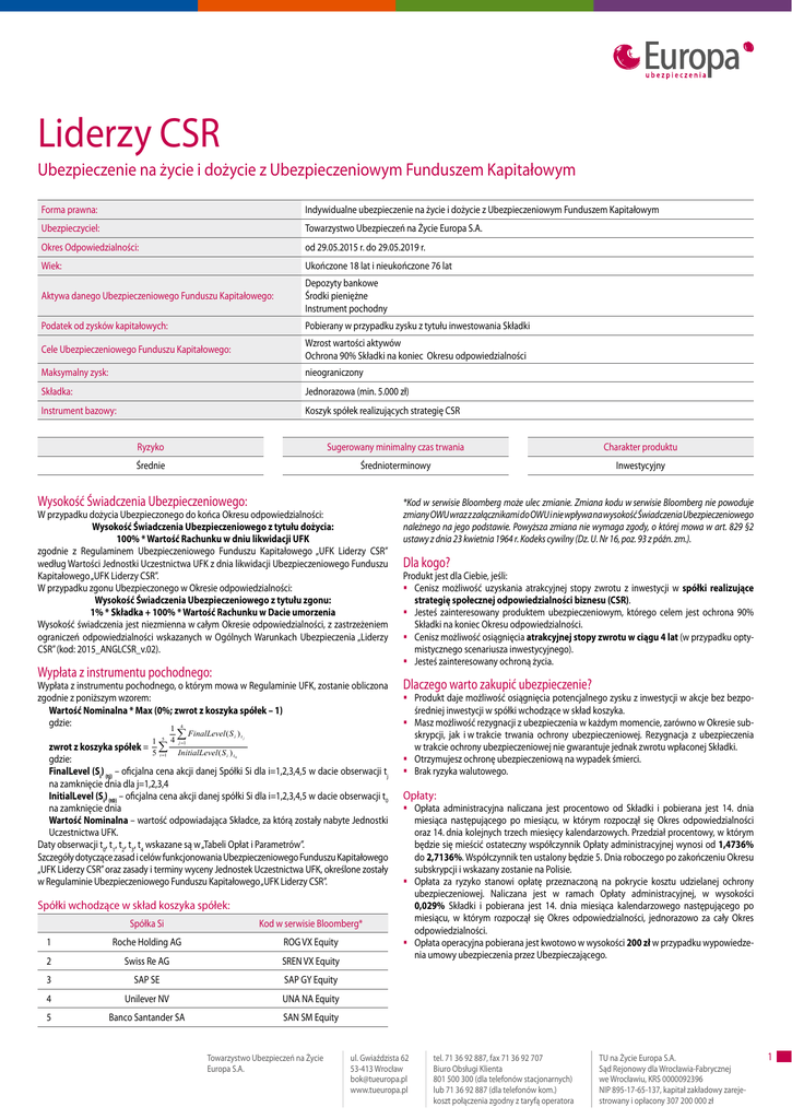 Liderzy CSR Ubezpieczenie na życie i dożycie z Ubezpieczeniowym Funduszem Kapitałowym Forma prawna: Indywidualne ubezpieczenie na życie i dożycie z Ubezpieczeniowym Funduszem Kapitałowym Ubezpieczyciel: Towarzystwo Ubezpieczeń na Życie Europa S.A. Okres Odpowiedzialności: od 29.05.2015 r. do 29.05.2019 r. Wiek: Ukończone 18 lat i nieukończone 76 lat Aktywa danego Ubezpieczeniowego Funduszu Kapitałowego: Depozyty bankowe Środki pieniężne Instrument pochodny Podatek od zysków kapitałowych: Pobierany w przypadku zysku z tytułu inwestowania Składki Cele Ubezpieczeniowego Funduszu Kapitałowego: Wzrost wartości aktywów Ochrona 90% Składki na koniec Okresu odpowiedzialności Maksymalny zysk: nieograniczony Składka: Jednorazowa (min. 5.000 zł) Instrument bazowy: Koszyk spółek realizujących strategię CSR Ryzyko Sugerowany minimalny czas trwania Charakter produktu Średnie Średnioterminowy Inwestycyjny Wysokość Świadczenia Ubezpieczeniowego: W przypadku dożycia Ubezpieczonego do końca Okresu odpowiedzialności: Wysokość Świadczenia Ubezpieczeniowego z tytułu dożycia: 100% * Wartość Rachunku w dniu likwidacji UFK zgodnie z Regulaminem Ubezpieczeniowego Funduszu Kapitałowego „UFK Liderzy CSR” według Wartości Jednostki Uczestnictwa UFK z dnia likwidacji Ubezpieczeniowego Funduszu Kapitałowego „UFK Liderzy CSR”. W przypadku zgonu Ubezpieczonego w Okresie odpowiedzialności: Wysokość Świadczenia Ubezpieczeniowego z tytułu zgonu: 1% * Składka + 100% * Wartość Rachunku w Dacie umorzenia Wysokość świadczenia jest niezmienna w całym Okresie odpowiedzialności, z zastrzeżeniem ograniczeń odpowiedzialności wskazanych w Ogólnych Warunkach Ubezpieczenia „Liderzy CSR” (kod: 2015_ANGLCSR_v.02). Wypłata z instrumentu pochodnego: Wypłata z instrumentu pochodnego, o którym mowa w Regulaminie UFK, zostanie obliczona zgodnie z poniższym wzorem: Wartość Nominalna * Max (0%; zwrot z koszyka spółek – 1) gdzie: 1 4 1 5 4 ∑ FinalLevel (S i )t j zwrot z koszyka spółek = 5 ∑ InitialLevel ( S ) i =1 i t gdzie: FinalLevel (Si) (tj) – oficjalna cena akcji danej Spółki Si dla i=1,2,3,4,5 w dacie obserwacji tj na zamknięcie dnia dla j=1,2,3,4 InitialLevel (Si) (t0) – oficjalna cena akcji danej spółki Si dla i=1,2,3,4,5 w dacie obserwacji t0 na zamknięcie dnia Wartość Nominalna – wartość odpowiadająca Składce, za którą zostały nabyte Jednostki Uczestnictwa UFK. Daty obserwacji t0, t1, t2, t3, t4 wskazane są w „Tabeli Opłat i Parametrów”. Szczegóły dotyczące zasad i celów funkcjonowania Ubezpieczeniowego Funduszu Kapitałowego „UFK Liderzy CSR” oraz zasady i terminy wyceny Jednostek Uczestnictwa UFK, określone zostały w Regulaminie Ubezpieczeniowego Funduszu Kapitałowego „UFK Liderzy CSR”. j =1 0 Spółki wchodzące w skład koszyka spółek: Spółka Si Kod w serwisie Bloomberg* 1 Roche Holding AG ROG VX Equity 2 Swiss Re AG SREN VX Equity 3 SAP SE SAP GY Equity 4 Unilever NV UNA NA Equity 5 Banco Santander SA SAN SM Equity Towarzystwo Ubezpieczeń na Życie Europa S.A. *Kod w serwisie Bloomberg może ulec zmianie. Zmiana kodu w serwisie Bloomberg nie powoduje zmiany OWU wraz z załącznikami do OWU i nie wpływa na wysokość Świadczenia Ubezpieczeniowego należnego na jego podstawie. Powyższa zmiana nie wymaga zgody, o której mowa w art. 829 §2 ustawy z dnia 23 kwietnia 1964 r. Kodeks cywilny (Dz. U. Nr 16, poz. 93 z późn. zm.). Dla kogo? Produkt jest dla Ciebie, jeśli: Cenisz możliwość uzyskania atrakcyjnej stopy zwrotu z inwestycji w spółki realizujące strategię społecznej odpowiedzialności biznesu (CSR). Jesteś zainteresowany produktem ubezpieczeniowym, którego celem jest ochrona 90% Składki na koniec Okresu odpowiedzialności. Cenisz możliwość osiągnięcia atrakcyjnej stopy zwrotu w ciągu 4 lat (w przypadku optymistycznego scenariusza inwestycyjnego). Jesteś zainteresowany ochroną życia. Dlaczego warto zakupić ubezpieczenie? Produkt daje możliwość osiągnięcia potencjalnego zysku z inwestycji w akcje bez bezpośredniej inwestycji w spółki wchodzące w skład koszyka. Masz możliwość rezygnacji z ubezpieczenia w każdym momencie, zarówno w Okresie subskrypcji, jak i w trakcie trwania ochrony ubezpieczeniowej. Rezygnacja z ubezpieczenia w trakcie ochrony ubezpieczeniowej nie gwarantuje jednak zwrotu wpłaconej Składki. Otrzymujesz ochronę ubezpieczeniową na wypadek śmierci. Brak ryzyka walutowego. Opłaty: Opłata administracyjna naliczana jest procentowo od Składki i pobierana jest 14. dnia miesiąca następującego po miesiącu, w którym rozpoczął się Okres odpowiedzialności oraz 14. dnia kolejnych trzech miesięcy kalendarzowych. Przedział procentowy, w którym będzie się mieścić ostateczny współczynnik Opłaty administracyjnej wynosi od 1,4736% do 2,7136%. Współczynnik ten ustalony będzie 5. Dnia roboczego po zakończeniu Okresu subskrypcji i wskazany zostanie na Polisie. Opłata za ryzyko stanowi opłatę przeznaczoną na pokrycie kosztu udzielanej ochrony ubezpieczeniowej. Naliczana jest w ramach Opłaty administracyjnej, w wysokości 0,029% Składki i pobierana jest 14. dnia miesiąca kalendarzowego następującego po miesiącu, w którym rozpoczął się Okres odpowiedzialności, jednorazowo za cały Okres odpowiedzialności. Opłata operacyjna pobierana jest kwotowo w wysokości 200 zł w przypadku wypowiedzenia umowy ubezpieczenia przez Ubezpieczającego. ul. Gwiaździsta 62 53-413 Wrocław [email protected] www.tueuropa.pl tel. 71 36 92 887, fax 71 36 92 707 Biuro Obsługi Klienta 801 500 300 (dla telefonów stacjonarnych) lub 71 36 92 887 (dla telefonów kom.) koszt połączenia zgodny z taryfą operatora TU na Życie Europa S.A. Sąd Rejonowy dla Wrocławia-Fabrycznej we Wrocławiu, KRS 0000092396 NIP 895-17-65-137, kapitał zakładowy zarejestrowany i opłacony 307 200 000 zł 1 Ryzyka jakie musisz wziąć po uwagę: Inwestycj