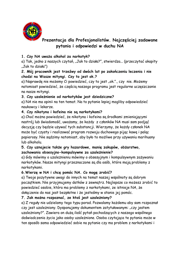 Prezentacja dla Profesjonalistów. Najczęściej zadawane pytania i odpowiedzi w duchu NA 1. Czy NA uważa alkohol za narkotyk? a) Tak, jedno z naszych czytań, „Jak to działa?”, stwierdza... (przeczytać akapity „Jak to działa”) 2. Mój pracownik jest trzeźwy od dwóch lat po zakończeniu leczenia i nie chodzi na Wasze mityngi. Czy to jest ok.? a) Naprawdę nie możemy Ci powiedzieć, czy to jest „ok.”., czy nie. Możemy natomiast powiedzieć, że częścią naszego programu jest regularne uczęszczanie na nasze mityngi. 3. Czy uzależnienie od narkotyków jest dziedziczne? a) NA nie ma opinii na ten temat. Na to pytanie lepiej mogliby odpowiedzieć naukowcy i lekarze. 4. Czy nikotyna i kofeina nie są narkotykami? a) Choć można powiedzieć, że nikotyna i kofeina są środkami zmieniającymi nastrój lub świadomość, uważamy, że każdy z członków NA musi sam podjąć decyzję czy będzie używać tych substancji. Wierzymy, że każdy członek NA może być czysty i realizować program rozwoju duchowego pijąc kawę i paląc papierosy. Nie sądzimy natomiast, aby było to możliwe przy używaniu marihuany lub alkoholu. 5. Czy uznajecie także gry hazardowe, manię zakupów, obżarstwo, zachowania obsesyjno-kompulsywne za uzależnienie? a) Gdy mówimy o uzależnieniu mówimy o obsesyjnym i kompulsywnym zażywaniu narkotyków. Nasze mityngi przeznaczone są dla osób, które mają problemy z narkotykami. 6.Wierzę w NA i chcę pomóc NA. Co mogę zrobić? a) Twoje pozytywne uwagi do innych na temat naszej wspólnoty są dobrym początkiem. Nie przyjmujemy datków z zewnątrz. Najlepsze co możesz zrobić to powiedzieć osobie, która ma problemy z narkotykami, ze istnieje NA, że dołączenie do nas jest bezpłatne i że jesteśmy w stanie jej pomóc. 7. Jak można rozpoznać, ze ktoś jest uzależniony? a) Z reguły nie udzielamy tego typu porad. Pozwalamy każdemu aby sam rozpoznał czy jest uzależniony. Dysponujemy dokumentem zatytułowanym: „czy jestem uzależniony?”. Zawiera on dużą ilość pytań pochodzących z naszego wspólnego doświadczenia życia jako osoby uzależnione. Osoba czytająca te pytania może w ten sposób sama odpowiedzieć sobie na pytanie czy ma problem z narkotykami i czy może być uzależniona. Zapraszamy Cię do przeczytania tego dokumentu, który może dać Ci odpowiedź na Twoje pytanie. 8. Jak rozpoznać, że ktoś jest pod wpływem narkotyków? a) Nie udzielamy tego typu porad. Lekarze lub profesjonaliści mogą odpowiedzieć na to pytanie lepiej niż my. 9. Jaka jest różnica pomiędzy używaniem a nadużywaniem narkotyków? a) Na jest wspólnota mężczyzn i kobiet dla których narkotyki stały się dużym problemem. Nie mamy opinii na temat tego, czy ktoś jest okazjonalnym, czy „towarzyskim” użytkownikiem narkotyków. Każdy powinien sam o tym zadecydować i przyjdzie chwila, gdy odpowiedź na to pytanie stanie się oczywista. 10.Jak mogę spowodować, żeby ktoś przestał używać narkotyków? a) Z naszych osobistych doświadczeń wynika , iż nie można powstrzymać uzależnionego od ich używania. Uzależniony przestanie je używać jedynie wtedy, gdy tego zapragnie i poszuka pomocy. Jeżeli znasz kogoś kto używa narkotyki możesz ewentualnie dać mu któreś z naszych wydawnictw, terminarz naszych spotkań i na tym poprzestać. NA nie robi tak zwanych interwencji narkotykowych. Nie udzielamy także porad członkom rodzin, przyjaciołom ani pracodawcom na temat tego jak postępować z uzależnionymi. 11. Co mam zrobić, jeśli znajdę narkotyki w domu, albo w pracy? a) Nie udzielimy ci porady prawnej w tym temacie. Jest to sprawa twojego sumienia jako członka rodziny i członka społeczeństwa. 12.Znam kogoś kto jest uzależniony, (ale nie widzi, nie słyszy, lub jest upośledzony w inny sposób) i odmawia chodzenia na Wasze mityngi. Co mogę dla niego zrobić? a) W zależności od tego czy chodzi o osobę niesłyszącą, niewidzącą itp. Możemy odpowiedzieć w następujący sposób: „Posiadamy specjalne materiały dla takich osób (taśmy audio z naszymi Tekstami Podstawowymi i braille’owskie wydania naszych tekstów) lub (mamy spotkania dla inwalidów, które odbywają się w miejscu xxx)” Uzależnionemu zawsze jest trudno pojawić się na mityngu NA z powodu uczucia wyobcowania i wstydu. Jest tak w szczególności w sytuacji, gdy osoba ma fizyczne utrudniania w przyjęciu naszego posłania. ...Możesz nie dysponować w tej chwili odpowiedziami na daną sytuację. Powiedz wtedy osobie pytającej, iż komitet poszuka tej informacji i da jej znać. 13.Czy sprawdzacie obecność na mityngach? Czy mogę u was sprawdzić czy mój (przyjaciel, mąż pracownik...) faktycznie chodzi na wasze mityngi? a)Nie. NA nie sprawdza obecności na mityngach. Tym nie mniej, jako gest kurtuazji wobec osób uczęszczających na nasze mityngi otwarte z powodów prawnych i dla pacjentów leczących się ambulatoryjnie, niektóre z naszych grup dopuszczają do tego aby sekretarz mityngu podpisywał formularz obecności dostarczony przez zainteresowanego. Jednak nie wszystkie grupy godzą się na to. Niektóre robią to bez żadnych ograniczeń. Mówiąc ogólnie, nie sprawdzamy obecności żadnego z uczestników i nie przydzielamy żadnych ról związanych z członkostwem. (Do we maintain any type of membership roles.) 14.Jaka jest różnica między NA, a ośrodkami leczenia uzależnień? NA a psychoterapią? a) Narcotics Anonymous jest organizacją typu non-profit i nie pobiera żadnych składek od swoich członków. Nie dysponujemy personelem medycznym, ani zawodowymi terapeutami do leczenia lub doradzania naszym członkom. Nie prezentujemy siebie uzależnionemu, który przychodzi do nas w poszukiwaniu pomocy jako profesjonaliści. Ofiarujemy im siebie jako uzależnieni, tacy sami jak oni, lecz którzy nauczyli się jak przestać zażywać narkotyki, lub stracili do nich chęć i znaleźli nowy sposób na życie. Co do 