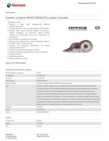 Warszawa 2017-03-04 Karta produktu: Korektor w taśmie OFFICE PRODUCTS, myszka, 5mmx8m Korektor w taśmie Wygodny w użyciu dzięki ergonomicznej obudowie dostosowanej do dłoni Transparentny kolor umożliwia śledzenie zużycia taśmy Wysokiej jakości taśma korekcyjna odporna na zerwanie z idealnie przylegająca do powierzchni papieru warstwa korektora, po której można pisać bezpośrednio po zastosowaniu Do stosowania na wszystkich typach papieru Nie pozostawia śladów i cieni na kserokopiach i faksach Do użytku w domu, szkole oraz biurze Przyjazny dla środowiska, nietoksyczny, nie zawiera rozpuszczalników Pakowany indywidualnie w torebkę z zawieszką Na każdym korektorze symbol produktu, marka oraz kod EAN Długość taśmy: 8m Szerokość taśmy: 5mm Zbiorczo pakowany po 24 szt. Cena 2,13 PLN brutto Podstawowe parametry produktu Numer produktu w systemie 30570 Nr dostawcy 17101821-99 Nr Celcen 17-02241-6 Kod kreskowy 5901503680728 Nazwa produktu Korektor w taśmie OFFICE PRODUCTS, myszka, 5mmx8m Opis Korektor w taśmie; wygodny w użyciu dzięki ergonomicznej obudowie dostosowanej do dłoni; transparentny kolor umożliwia śledzenie zużycia taśmy; wysokiej jakości taśma korekcyjna odporna na zerwanie z idealnie przylegająca do powierzchni papieru warstwa korektora, po której można pisać bezpośrednio po zastosowaniu; do stosowania na wszystkich typach papieru; nie pozostawia śladów i cieni na kserokopiach i faksach; do użytku w domu, szkole oraz biurze; przyjazny dla środowiska, nietoksyczny, nie zawiera rozpuszczalników; pakowany indywidualnie w torebkę z zawieszką; na każdym korektorze symbol produktu, marka oraz kod EAN; długość taśmy: 8m; szerokość taśmy: 5mm; zbiorczo pakowany po 24 szt. Kategoria Korektory Klasa Ekonomiczne Marka OFFICE PRODUCTS Cecha W ofercie od 2016-07 Rodzaj Zawieszka Typ Myszka EBIUROWE 1 Sierpnia 39/26 02-134 Warszawa NIP: 5222725611 REGON: 362214769 Warszawa 2017-03-04 Karta katalogowa produktu cd. Korektor w taśmie OFFICE PRODUCTS, myszka, 5mmx8m Produkt Korektor w taśmie Wymiary Rozmiar 5/8mm/m Wspólny słownik zamówień CPV 30192910-3 Folia lub taśma korekcyjna Certyfikaty Nowy produkt w ofercie Standard Hit Standard Kolor Kolor Biały Pozostałe zdjęcia produktu Serdecznie zapraszamy do współpracy EBIUROWE zespół. EBIUROWE 1 Sierpnia 39/26 02-134 Warszawa NIP: 5222725611 REGON: 362214769