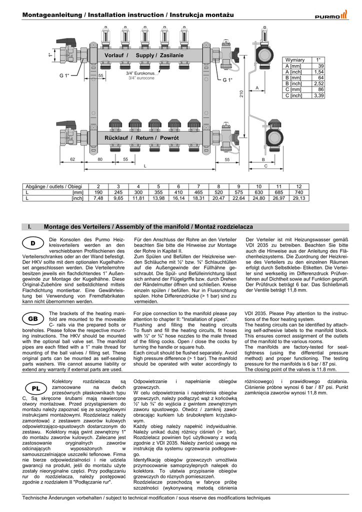 1“ Ø Montageanleitung / Installation instruction / Instrukcja montażu Vorlauf / G 1“ Supply / Zasilanie 3/4” Eurokonus 3/4” eurocone 55 Wymiary A [mm] A [inch] B [mm] B [inch] C [mm] C [inch] G 1“ 210 A 1“ 39 1,54 64 2,52 86 3,39 Rücklauf / Return / Powrót 62 80 55 55 B C L Abgänge / outlets / Obiegi L [mm] L [inch] I. 2 190 7,48 3 245 9,65 4 300 11,81 5 355 13,98 6 410 16,14 7 465 18,31 8 520 20,47 9 575 22,64 10 630 24,80 11 685 26,97 12 740 29,13 Montage des Verteilers / Assembly of the manifold / Montaż rozdzielacza Die Konsolen des Purmo Heizkreisverteilers werden an den verschiebbaren Profilschienen des Verteilerschrankes oder an der Wand befestigt. Der HKV sollte mit dem optionalen Kugelhahnset angeschlossen werden. Die Verteilerrohre besitzen jeweils ein flachdichtendes 1” Außengewinde zur Montage der Kugelhähne. Diese Original-Zubehöre sind selbstdichtend mittels Flachdichtung montierbar. Eine Gewährleistung bei Verwendung von Fremdfabrikaten kann nicht übernommen werden. Für den Anschluss der Rohre an den Verteiler beachten Sie bitte die Hinweise zur Montage der Rohre in Kapitel II. Zum Spülen und Befüllen der Heizkreise werden Schläuche mit ½“ bzw. ¾“ Schlauchtüllen auf die Außengewinde der Füllhähne geschraubt. Die Spül- und Befülleinrichtung lässt sich anhand der Flügelgriffe bzw. durch Drehen der Rändelmutter öffnen und schließen. Kreise einzeln spülen / befüllen. Nur in Flussrichtung spülen. Hohe Differenzdrücke (> 1 bar) sind zu vermeiden. Der Verteiler ist mit Heizungswasser gemäß VDI 2035 zu betreiben. Beachten Sie bitte auch die Hinweise aus der Anleitung des Flächenheizsystems. Die Zuordnung der Heizkreise des Verteilers zu den einzelnen Räumen erfolgt durch Selbstklebe- Etiketten. Die Verteiler sind werkseitig im Differenzdruck Prüfverfahren auf Dichtheit sowie auf Funktion geprüft. Der Prüfdruck beträgt 6 bar. Das Schließmaß der Ventile beträgt 11,8 mm. The brackets of the heating manifold are mounted to the moveable C- rails via the prepared bolts or boreholes. Please follow the respective mounting instructions. The HKV should be mounted with the optional ball valve set. The manifold pipes are each fitted with a 1” male thread for mounting of the ball valves / filling set. These original parts can be mounted as self-sealing parts washers. We cannot assume liability or extend any warranty if external parts are used. For pipe connection to the manifold please pay attention to chapter II: "Installation of pipes". Flushing and filling the heating circuits To flush and fill the heating circuits, fit hoses with ½“ or ¾” hose nozzles to the male thread of the filling cocks. Open / close the cocks by turning the handle or square hub. Each circuit should be flushed separately. Avoid high pressure difference (> 1 bar). The manifold should be operated with water accordingly to VDI 2035. Please Pay attention to the instructions of the floor heating system. The heating circuits can be identified by attaching self-adhesive labels to the manifold block. This ensures correct assignment of the outlets of the manifold to the various rooms. The manifolds are factory-tested for sealtightness (using the differential pressure method) and proper functioning. The testing pressure for the manifolds is 6 bar / 87 psi. The closing point of the valves is 11.8 mm. Kolektory rozdzielacza są zamocowane na dwóch przesównych płaskownikach typu C, Są skręcone śrubami mają nawiercone otwory montażowe. Przed przystąpieniem do montażu należy zapoznać się ze szcegółowymi instrukcjami montażowymi. Rozdzielacz należy zamontować z zestawem zaworów kulowych odpowietrzająco-spustowych dostarczonym do zestawu. Kolektory mają gwint zewnętrzny 1" do montażu zaworów kulowych. Zalecane jest zastosowanie oryginalnych zaworów odcinających wyposażonych w samouszczelniające uszczelki teflonowe. Firma nie bierze odpowiedzialności i nie udziela gwarancji na produkt, jeśli do montażu użyte zostały nieoryginalne części. Przy podłączaniu rur do rozdzielacza, należy postępować zgodnie z rozdziałem II "Podłączanie rur". Odpowietrzanie i napełnianie obiegów grzewczych. W celu odpowietrzenia i napełnienia obiegów grzewczych, należy podłączyć wąż z końcówką ½“ lub ¾” do wyjścia z gwintem zewnętrznym zaworu spustowego. Otwórz / zamknij zawór obracając kurkiem lub śrubokrętem krzyżakowym. Każdy obieg należy napełnić indywidualnie. Należy unikać dużej różnicy ciśnień (> bar). Rozdzielacz powinien być użytkowany z wodą zgodnie z VDI 2035. Należy zwrócić uwagę na instrukcję dla systemu ogrzewania podłogowego. Identyfikację obiegów grzewczych umożliwia przymocowanie samoprzylepnych nalepek do kolektora. To ułatwia przypisanie obiegów grzewczych do róznych pomieszczeń. Rozdzielacze przechodzą w fabryce próbę szczelności (wykonywaną metodą ciśnienia różnicowego) i prawidłowego działania. Ciśnienie próbne wynosi 6 bar / 87 psi. Punkt zamknięcia zaworów wynosi 11,8 mm. D GB PL Technische Änderungen vorbehalten / subject to technical modification / sous réserve des modifications techniques Montageanleitung / Installation instruction / Instrukcja montażu II. Montage der Rohre / Installation of pipes / Podłączanie rur: D Kunststoffrohr rechtwinklig abschneiden und entgraten / kalibrieren. Klemmringmutter über das Rohr schieben. GB Cut off the plastic tube at a right angle and debur / calibrate. Push the sleeve nut over the tube. PL Przetnij rurę pod kątem prostym i skalibruj uciętą końcówkę. Załóż nakrętkę złączki na rurę. D Klemmring auf das Rohr schieben und Schlauchtülle/ Stützhülse einstecken. GB PL D Das vormontierte Rohr in die Verschraubung hineinstecken. Insert the pre-assembled pipe into the screw connection. PL Końcówkę rury z założonymi elementami złączki włóż w otwór króćca przyłączeniowego rozdzielacza. D Kle