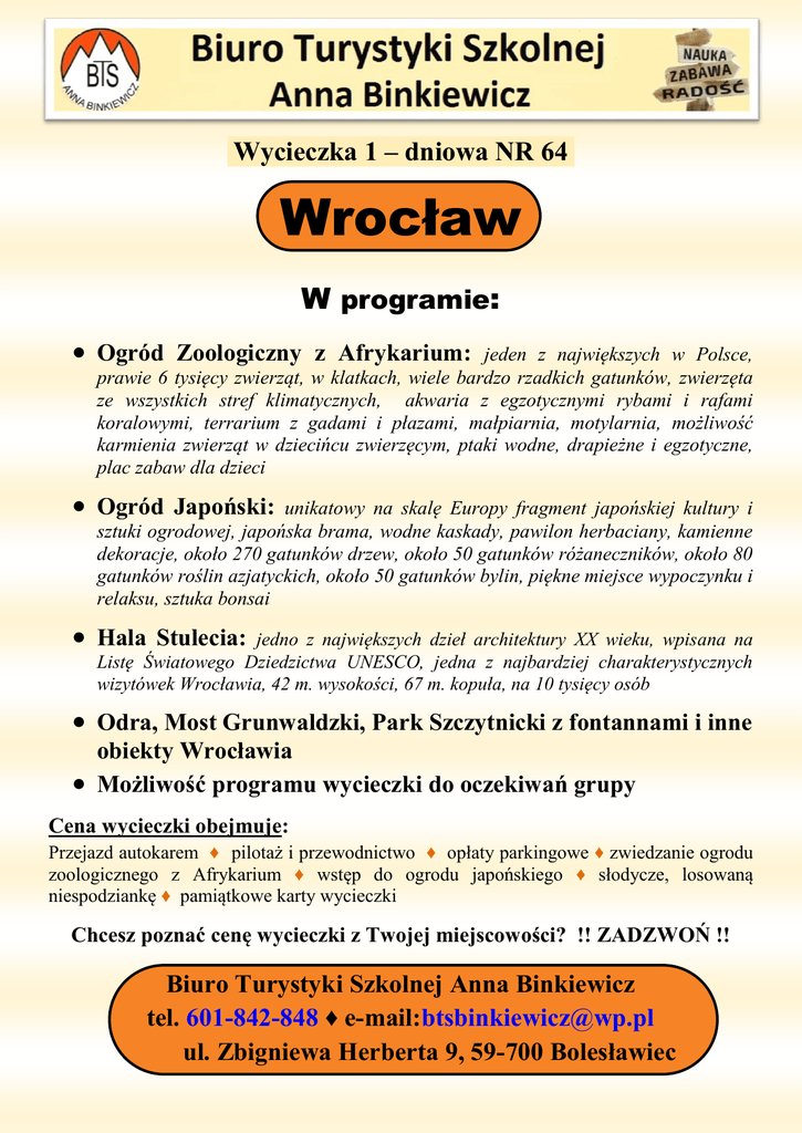Wycieczka 1 – dniowa NR 64 Wrocław W programie: Ogród Zoologiczny z Afrykarium: jeden z największych w Polsce, prawie 6 tysięcy zwierząt, w klatkach, wiele bardzo rzadkich gatunków, zwierzęta ze wszystkich stref klimatycznych, akwaria z egzotycznymi rybami i rafami koralowymi, terrarium z gadami i płazami, małpiarnia, motylarnia, możliwość karmienia zwierząt w dziecińcu zwierzęcym, ptaki wodne, drapieżne i egzotyczne, plac zabaw dla dzieci Ogród Japoński: unikatowy na skalę Europy fragment japońskiej kultury i sztuki ogrodowej, japońska brama, wodne kaskady, pawilon herbaciany, kamienne dekoracje, około 270 gatunków drzew, około 50 gatunków różaneczników, około 80 gatunków roślin azjatyckich, około 50 gatunków bylin, piękne miejsce wypoczynku i relaksu, sztuka bonsai Hala Stulecia: jedno z największych dzieł architektury XX wieku, wpisana na Listę Światowego Dziedzictwa UNESCO, jedna z najbardziej charakterystycznych wizytówek Wrocławia, 42 m. wysokości, 67 m. kopuła, na 10 tysięcy osób Odra, Most Grunwaldzki, Park Szczytnicki z fontannami i inne obiekty Wrocławia Możliwość programu wycieczki do oczekiwań grupy Cena wycieczki obejmuje: Przejazd autokarem ♦ pilotaż i przewodnictwo ♦ opłaty parkingowe ♦ zwiedzanie ogrodu zoologicznego z Afrykarium ♦ wstęp do ogrodu japońskiego ♦ słodycze, losowaną niespodziankę ♦ pamiątkowe karty wycieczki Chcesz poznać cenę wycieczki z Twojej miejscowości? !! ZADZWOŃ !! Biuro Turystyki Szkolnej Anna Binkiewicz tel. 601-842-848 ♦ e-mail:[email protected] ul. Zbigniewa Herberta 9, 59-700 Bolesławiec