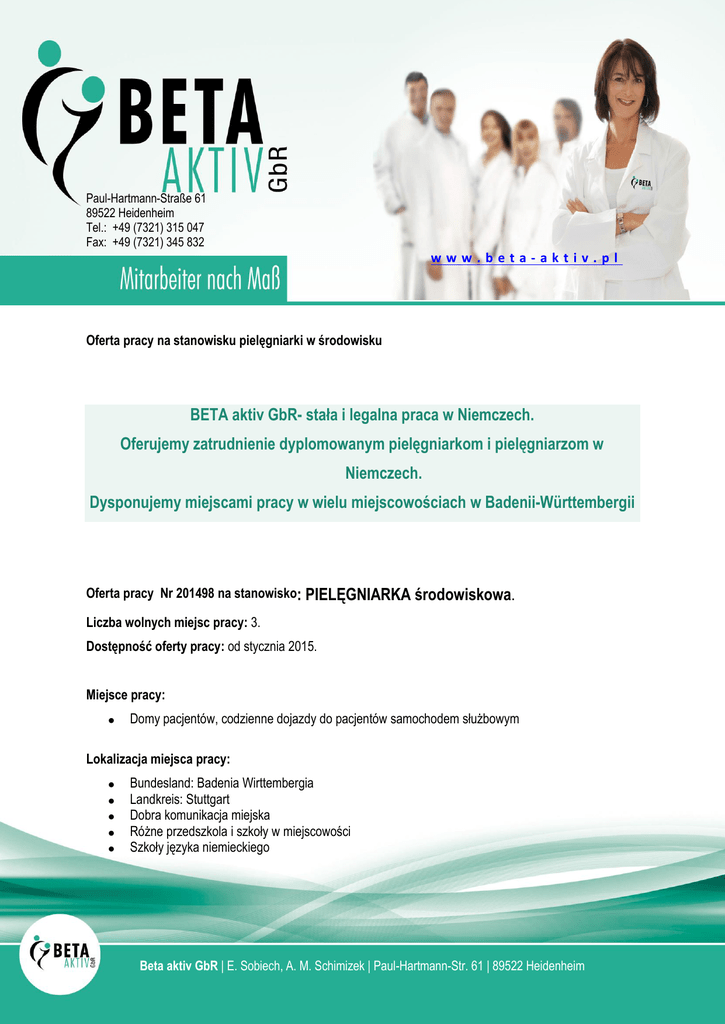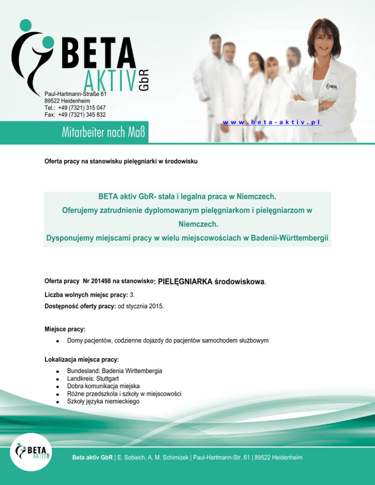 Paul-Hartmann-Straße 61 89522 Heidenheim Tel.: +49 (7321) 315 047 Fax: +49 (7321) 345 832 www.beta-aktiv.pl Oferta pracy na stanowisku pielęgniarki w środowisku BETA aktiv GbR- stała i legalna praca w Niemczech. Oferujemy zatrudnienie dyplomowanym pielęgniarkom i pielęgniarzom w Niemczech. Dysponujemy miejscami pracy w wielu miejscowościach w Badenii-Württembergii Oferta pracy Nr 201498 na stanowisko: PIELĘGNIARKA środowiskowa. Liczba wolnych miejsc pracy: 3. Dostępność oferty pracy: od stycznia 2015. Miejsce pracy: Domy pacjentów, codzienne dojazdy do pacjentów samochodem służbowym Lokalizacja miejsca pracy: Bundesland: Badenia Wirttembergia Landkreis: Stuttgart Dobra komunikacja miejska Różne przedszkola i szkoły w miejscowości Szkoły języka niemieckiego Beta aktiv GbR | E. Sobiech, A. M. Schimizek | Paul-Hartmann-Str. 61 | 89522 Heidenheim Oferujemy: wynagrodzenie 1.800 Euro brutto przed nostryfikacją + dodatki za pracę w niedziele i święta 2.400 Euro brutto po nostryfikacji + dodatki jak wyzej polskojęzyczną obsługę podczas procesów rejestracyjnych w Niemczech przeprowadzamy proces nostryfikacji dyplomu zatrudnienie -100% etatu, ok. 170 godzin w miesiącu zakwaterowanie w mieszkaniu pracowniczym samodzielnym lub w pokoju we wspólnocie mieszkaniowej, którą zamieszkują tylko pielęgniarki pomoc w szukaniu mieszkania docelowego umowę o pracę na niemieckich warunkach, zawieraną bezpośrednio z niemieckim pracodawcą. Wymagania: wykształcenie kierunkowe: pielęgniarka dyplomowana (lub licencjat/magister) samodzielność i odpowiedzialność związana z wykonywaniem zawodu pielęgniarskiego gotowość do wyjazdu za granicę na minimum rok znajomość języka niemieckiego: poziom A2 prawo jazdy kategorii B oraz gotowość do jazdy samochodem służbowym w małym i dużym mieście ________________________________________________________________________________ Jak z sukcesem i bez ryzyka podjąć się tej pracy? Skontaktuj się z naszym przedstawicielem w Polsce pod numer 505 123 391. Po pozytywnym przejściu pierwszej rozmowy kwalifikacyjnej: wypełnij otrzymany formularz. W ciągu 5 dni roboczych zgłosimy się do Ciebie telefonicznie. Zaprosimy Cię na 2 dni próbnej pracy u Twojego przyszłego pracodawcy. Podpiszesz umowę o pracę bezpośrednio z niemieckim pracodawcą. ________________________________________________________________________________________________ Prosimy o przesłanie wstępnej aplikacji na adres: [email protected] Zapraszamy do kontaktu telefonicznego na numer 0048 505 123 391 Erreichen Sie zusammen mit uns schnell und effektiv Ihre Ziele. Bądźmy partnerami. Przyłącz się do grupy pielęgniarek, które skorzystały już z naszej oferty pracy Beta aktiv GbR | E. Sobiech, A. M. Schimizek | Paul-Hartmann-Str. 61 | 89522 Heidenheim