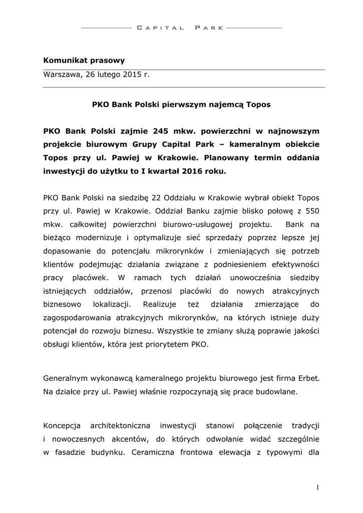 Komunikat prasowy Warszawa, 26 lutego 2015 r. INFORMACJA PRASOWA PKO Bank Polski pierwszym najemcą Topos PKO Bank Polski zajmie 245 mkw. powierzchni w najnowszym projekcie biurowym Grupy Capital Park – kameralnym obiekcie Topos przy ul. Pawiej w Krakowie. Planowany termin oddania inwestycji do użytku to I kwartał 2016 roku. PKO Bank Polski na siedzibę 22 Oddziału w Krakowie wybrał obiekt Topos przy ul. Pawiej w Krakowie. Oddział Banku zajmie blisko połowę z 550 mkw. całkowitej powierzchni biurowo-usługowej projektu. Bank na bieżąco modernizuje i optymalizuje sieć sprzedaży poprzez lepsze jej dopasowanie do potencjału mikrorynków i zmieniających się potrzeb klientów podejmując działania związane z podniesieniem efektywności pracy placówek. W ramach tych istniejących oddziałów, przenosi biznesowo lokalizacji. Realizuje działań placówki też unowocześnia do nowych działania siedziby atrakcyjnych zmierzające do zagospodarowania atrakcyjnych mikrorynków, na których istnieje duży potencjał do rozwoju biznesu. Wszystkie te zmiany służą poprawie jakości obsługi klientów, która jest priorytetem PKO. Generalnym wykonawcą kameralnego projektu biurowego jest firma Erbet. Na działce przy ul. Pawiej właśnie rozpoczynają się prace budowlane. Koncepcja architektoniczna inwestycji stanowi połączenie tradycji i nowoczesnych akcentów, do których odwołanie widać szczególnie w fasadzie budynku. Ceramiczna frontowa elewacja z typowymi dla 1 krakowskiej architektury motywami łączy rozwiązaniami szklano-stalowymi. Nowa się zabudowa z nowoczesnymi połączona będzie z istniejącym średniowiecznym murem, który przenika do wnętrza budynku sprawiając wrażenie, że jest on częścią tej kompozycji. Projekt Topos został pozytywnie zaopiniowany przez Wojewódzkiego Konserwatora Zabytków. Topos to doskonałe miejsce na biuro w bezpośrednim sąsiedztwie Galerii Krakowskiej i Dworca Kraków Główny. Atutem inwestycji jest również łatwy dojazd komunikacją miejską - 11 linii tramwajowych i 6 linii autobusowych z przystankami w bezpośrednim sąsiedztwie budynku. Autorami projektu są krakowskie pracownie DDD Architekci i MZ Studio. Dodatkowe informacje: Inwestor Grupa Capital Park jest doświadczonym i aktywnym inwestorem i deweloperem działającym na rynku nieruchomości w Polsce od ponad dziesięciu lat, specjalizującym się w wyszukiwaniu i wykorzystywaniu okazji rynkowych (ang. opportunistic investor). Głównym przedmiotem działalności Grupy jest nabywanie nieruchomości ze znacznym potencjałem budowy wartości, np. poprzez zmianę warunków zagospodarowania przestrzennego lub uzyskanie pozwolenia na budowę, budowę nowych lub przebudowę istniejących obiektów, lub poprawę zarządzania istniejącymi budynkami. Capital Park osiąga dochody z najmu oraz ze sprzedaży nieruchomości lub produktów inwestycyjnych opartych na nieruchomościach. Grupa aktywnie poszukuje możliwości zakupu nowych projektów nieruchomościowych oraz nowych źródeł dochodów i wzrostu wartości w obszarach rynku charakteryzujących się dużym potencjałem rozwoju. Od rozpoczęcia działalności w 2003 roku Grupa przeprowadziła ok. 100 transakcji inwestycyjnych i zarządza portfelem nieruchomości obejmującym 76 projektów o łącznej powierzchni wynajmu brutto ok. 250 tys. mkw., zlokalizowanych w 39 miastach. Spośród tych projektów 39 nieruchomości handlowych typu high-street znajduje się w strukturze nowo utworzonego, innowacyjnego na polskim rynku Real Estate Income Assets FIZ AN, którym Grupa aktywnie zarządza i w którym posiada 15-proc. udział. 2 Biuro prasowe Capital Park Magda Runowska tel. 0 48 22 642 24 16, + 48 609 716 113 email: [email protected] 3