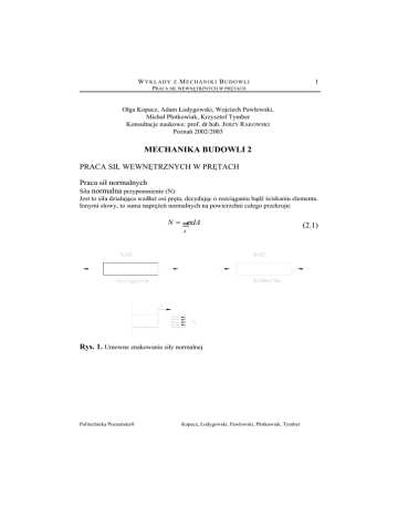 WYKŁADY Z MECHANIKI BUDOWLI 1 PRACA SIŁ WEWNĘTRZNYCH W PRĘTACH Olga Kopacz, Adam Łodygowski, Wojciech Pawłowski, Michał Płotkowiak, Krzysztof Tymber Konsultacje naukowe: prof. dr hab. JERZY RAKOWSKI Poznań 2002/2003 MECHANIKA BUDOWLI 2 PRACA SIŁ WEWNĘTRZNYCH W PRĘTACH Praca sił normalnych Siła normalna przypomnienie (N): Jest to siła działająca wzdłuż osi pręta, decydując o rozciąganiu bądź ściskaniu elementu. Innymi słowy, to suma naprężeń normalnych na powierzchni całego przekroju: N = ∫ σdA A Rys. 1. Umowne znakowanie siły normalnej Politechnika Poznańska® Kopacz, Łodygowski, Pawłowski, Płotkowiak, Tymber (2.1) WYKŁADY Z MECHANIKI BUDOWLI 2 PRACA SIŁ WEWNĘTRZNYCH W PRĘTACH Korzystając ze wzoru (2.1) i prawa Hooke’a można napisać zależności dla wycinaka pręta o długości ds: ds Rys. 2. Przyrost długości pręta N = ∫ σ N dA = σ N ⋅ A A σ ∆u ∆ N εN = = ↔ εN = N = u ds E E⋅A 1 1 N dL N = ⋅ N ⋅ ∆ = ⋅ N ⋅ ds 2 2 E⋅A Gdzie E- moduł Younga A- pole powirzchni przekroju Całkowita praca siły normalnej w pręcie o długości l: l LN = 1 N2 ds 2 ∫0 E ⋅ A (2.2) 1 N2 ds 2 E⋅A (2.3) Element pracy siły normalnej: dL N = Politechnika Poznańska® Kopacz, Łodygowski, Pawłowski, Płotkowiak, Tymber WYKŁADY Z MECHANIKI BUDOWLI 3 PRACA SIŁ WEWNĘTRZNYCH W PRĘTACH Praca momentów zginających Moment zginający przypomnienie: Def M = ∫ σ ( z ) ⋅ zdA (2.4) A Jest to para sił równo oddalonych od siebie, których wynikiem działania jest ściskanie części włókien i rozćiąganie pozostałych.: M>0 rozciąganie dolnych włókien M<0 rozciąganie górnych włókien Rys. 3. Umowne znakowanie momentó zginających W przekroju występują naprężenia stałe (od siły normalnej) i zmienne (od momentu zginającego) stałe naprężenia normalne zmienne naprężenia od momentu Rys. 4. Naprężenia stałe i zmienne Politechnika Poznańska® Kopacz, Łodygowski, Pawłowski, Płotkowiak, Tymber WYKŁADY Z MECHANIKI BUDOWLI 4 PRACA SIŁ WEWNĘTRZNYCH W PRĘTACH h d z h h g Naprężenia występujące od momentu zginającego decydują o ściskaniu części włókien i rozciąganiu pozostałej części: σz = σ Rys. 5. Naprężenia zmienne od momentu zginającego Górna rzędna naprężenia od momentu σg Górna rzędna naprężenia od momentu σd Korzystając ze wzoru (2.4) i zależności geometrycznych (twierdzenie Talesa) otrzymujemy: σz z z = →σ = σd σ d hd hd σd 2 σ ⋅ z dA = d I y h hd A d M = ∫ σ z zdA = ∫ A Wobec tego: Politechnika Poznańska® σd σ = hd z M σ = ⋅z Iy Kopacz, Łodygowski, Pawłowski, Płotkowiak, Tymber (2.5) (2.6) (2.7) WYKŁADY Z MECHANIKI BUDOWLI 5 PRACA SIŁ WEWNĘTRZNYCH W PRĘTACH Biegun chwilowego obrotu z promień krzywizny dx=ds ∆ na wysokości z 2 Rys. 6. Nieskończenie mały element, poddany momentowi zginającemu ρ- promień krzywizny, dϕ - połowa kąta zawartego między promieniami krzywizny, 2 ds ds ρ= → dϕ = (2.8) dϕ ρ Przyrost długości ds jest symetryczny względem promienia krzywizny, dlatego przyrośt po jednej stronie wynosi: ∆ dϕ = 2z 2 ∆ = zdϕ ∆ dϕ = z (2.9) Przyrost ds jest odkształceniem liniowym, dlatego korzystając z prawa Hooke’a można zapisać relacje między przyrostem włókna a naprężeniami. Politechnika Poznańska® Kopacz, Łodygowski, Pawłowski, Płotkowiak, Tymber WYKŁADY Z MECHANIKI BUDOWLI 6 PRACA SIŁ WEWNĘTRZNYCH W PRĘTACH ∆ = εz ds σ ∆ ε (z) = z = E ds σz ∆= ds E (2.10) Podstawiając wzór na naprężenie (2.7) i na kąt obrotu (2.9) otrzymujemy: ∆= M ⋅z ds E⋅Iy ∆ z M dϕ = ds E⋅Iy dϕ = (2.11) Wykorzystując wzór (2.11) i prawo Hooke’a otrzymujemy relację między krzywizną (χ) a momentem: dϕ 1 M = =χ= ds ρ E⋅Iy (2.12) χ- to odwrotność promienia krzywizny. Element pracy momentu zginającego, który działa na obrocie wynosi: dLM = 1 1 1 M2 M ⋅ Mdϕ = ⋅ M ⋅ ds = ds 2 2 2 E⋅Iy E ⋅Iy (2.13) Całkowita praca momentu w pręcie o długości l: l LM = Politechnika Poznańska® 1 M2 ds 2 ∫0 E ⋅ I y (2.14) Kopacz, Łodygowski, Pawłowski, Płotkowiak, Tymber WYKŁADY Z MECHANIKI BUDOWLI 7 PRACA SIŁ WEWNĘTRZNYCH W PRĘTACH Praca sił poprzecznych Siła poprzeczna przypomnienie Siła poprzeczna jest sumą wszystkich naprężeń stycznych w przekroju Indeks pierwszy określa płaszczyznę na jakiej działa siła Indeks drugi określa kierunek dodatniej osi naprężeń stycznych Txz = ∫ τ xz dA A τ xz = (2.15) Txz ⋅ S y ( z ) I y ⋅ b( z ) W powyższym siła działa na płaszczyźnie x o kierunku z. System znakowania siły poprzecznej T>0 kręci odciętą częścią w prawo T<0 kręci odciętą częścią w lewo Rys. 7. System znakowania siły poprzecznej Politechnika Poznańska® Kopacz, Łodygowski, Pawłowski, Płotkowiak, Tymber WYKŁADY Z MECHANIKI BUDOWLI 8 h d PRACA SIŁ WEWNĘTRZNYCH W PRĘTACH b(z) Rys. 8. Rysunek poglądowy działania siły poprzecznej Wynikiem działania sił stycznych jest deformacja przedstawiona na rysunku (w zdecydowanej przesadzie) γ xz ds Rys. 9. Rezultaty działania siły poprzecznej na elemencie: a) γ- kąt odkształcenia postaciowego, b) ∆- wynik działania sił stycznych ∆t = γ xz ds γ xz = τ xz G (2.16) We wzorze (2.16) G jest modułem odkształcenia postaciowego Kirchhoffa. Politechnika Poznańska® Kopacz, Łodygowski, Pawłowski, Płotkowiak, Tymber WYKŁADY Z MECHANIKI BUDOWLI 9 PRACA SIŁ WEWNĘTRZNYCH W PRĘTACH G= E 2 ⋅ (1 + ν ) (2.17 E- moduł Younga, ν- współczynnik Poissona Równanie pracy jest przedstawione wyłącznie dla poletka dA, w którym występują elementy siły poprzecznej. Jeżeli chciałoby się otrzymać całkowitą pracę, należałoby zsumować wszystkie poletka dA- czyli scałkować. dT = τdA 1 dLT = dT∆ T 2 (2.18) Przyrost pracy elementu siły poprzecznej przypadającej na poletko dA leżące na włóknie b(z) dla elementarnego wycinka pręta o długości ds. 1 d 3 LT = τ xz d