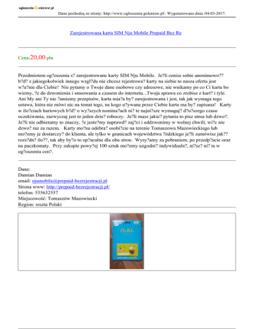 Dane pochodzą ze strony: http://www.ogloszenia-goleniow.pl/. Wygenerowano dnia: 04-03-2017. Zarejestrowana karta SIM Nju Mobile Prepaid Bez Re Cena:20,00 pln Przedmiotem og?oszenia s? zarejestrowane karty SIM Nju Mobile. Je?li cenisz sobie anonimowo?? b?d? z jakiegokolwiek innego wzgl?du nie chcesz rejestrowa? karty na siebie to nasza oferta jest w?a?nie dla Ciebie! Nie pytamy o Twoje dane osobowe czy adresowe, nie wnikamy po co Ci karta bo wiemy, ?e do dzwonienia i smsowania a czasem do internetu...Twoja sprawa co zrobisz z kart? i tyle. Ani My ani Ty nie ?amiemy przepisów, karta mia?a by? zarejestrowana i jest, tak jak wymaga tego ustawa, która nie mówi nic na temat tego, na kogo u?ywana przez Ciebie karta ma by? zapisana! Karty w ilo?ciach hurtowych b?d? o wy?szych nomina?ach ni? te najni?sze wymagaj? d?u?szego czasu oczekiwania, zazwyczaj jest to jeden dzie? roboczy. Je?li masz jakie? pytania to pisz smsa lub dzwo?. Je?li nie odbieramy to znaczy, ?e jeste?my naprawd? zaj?ci i oddzwonimy w wolnej chwili, wi?c nie dzwo? raz za razem. Karty mo?na odebra? osobi?cie na terenie Tomaszowa Mazowieckiego lub mo?emy je dostarczy? do klienta, ale tylko w granicach województwa ?ódzkiego je?li zamówisz jak?? rozs?dn? ilo??, tak aby by?o to op?acalne dla obu stron. Wysy?amy za pobraniem, po przedp?acie oraz na paczkomaty. Przy zakupie powy?ej 100 sztuk mo?emy uzgodni? indywidualn?, ni?sz? ni? ta w og?oszeniu cen?. Dane: Damian Damian email: [email protected] Strona www: http://prepaid-bezrejestracji.pl/ telefon: 535632557 Miejscowość: Tomaszów Mazowiecki Region: reszta Polski