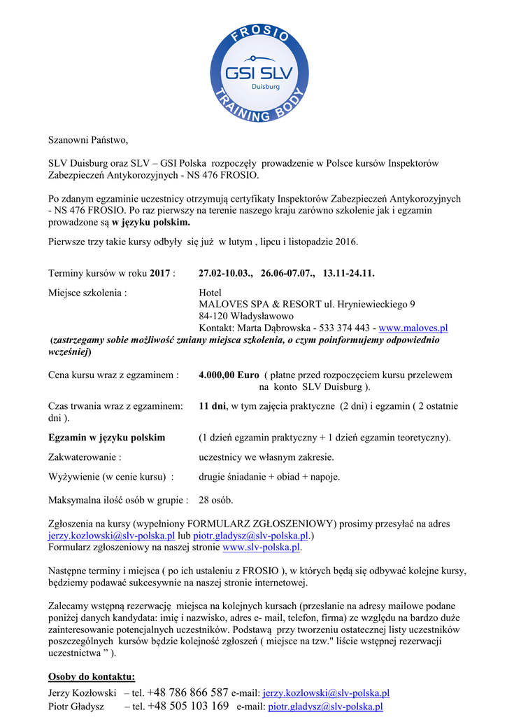 Szanowni Państwo, SLV Duisburg oraz SLV – GSI Polska rozpoczęły prowadzenie w Polsce kursów Inspektorów Zabezpieczeń Antykorozyjnych - NS 476 FROSIO. Po zdanym egzaminie uczestnicy otrzymują certyfikaty Inspektorów Zabezpieczeń Antykorozyjnych - NS 476 FROSIO. Po raz pierwszy na terenie naszego kraju zarówno szkolenie jak i egzamin prowadzone są w języku polskim. Pierwsze trzy takie kursy odbyły się już w lutym , lipcu i listopadzie 2016. Terminy kursów w roku 2017 : 27.02-10.03., 26.06-07.07., 13.11-24.11. Miejsce szkolenia : Hotel MALOVES SPA & RESORT ul. Hryniewieckiego 9 84-120 Władysławowo Kontakt: Marta Dąbrowska - 533 374 443 - www.maloves.pl (zastrzegamy sobie możliwość zmiany miejsca szkolenia, o czym poinformujemy odpowiednio wcześniej) Cena kursu wraz z egzaminem : 4.000,00 Euro ( płatne przed rozpoczęciem kursu przelewem na konto SLV Duisburg ). Czas trwania wraz z egzaminem: dni ). 11 dni, w tym zajęcia praktyczne (2 dni) i egzamin ( 2 ostatnie Egzamin w języku polskim (1 dzień egzamin praktyczny + 1 dzień egzamin teoretyczny). Zakwaterowanie : uczestnicy we własnym zakresie. Wyżywienie (w cenie kursu) : drugie śniadanie + obiad + napoje. Maksymalna ilość osób w grupie : 28 osób. Zgłoszenia na kursy (wypełniony FORMULARZ ZGŁOSZENIOWY) prosimy przesyłać na adres [email protected] lub [email protected].) Formularz zgłoszeniowy na naszej stronie www.slv-polska.pl. Następne terminy i miejsca ( po ich ustaleniu z FROSIO ), w których będą się odbywać kolejne kursy, będziemy podawać sukcesywnie na naszej stronie internetowej. Zalecamy wstępną rezerwację miejsca na kolejnych kursach (przesłanie na adresy mailowe podane poniżej danych kandydata: imię i nazwisko, adres e- mail, telefon, firma) ze względu na bardzo duże zainteresowanie potencjalnych uczestników. Podstawą przy tworzeniu ostatecznej listy uczestników poszczególnych kursów będzie kolejność zgłoszeń ( miejsce na tzw." liście wstępnej rezerwacji uczestnictwa ” ). Osoby do kontaktu: Jerzy Kozłowski – tel. +48 786 866 587 e-mail: [email protected] Piotr Gładysz – tel. +48 505 103 169 e-mail: [email protected]
