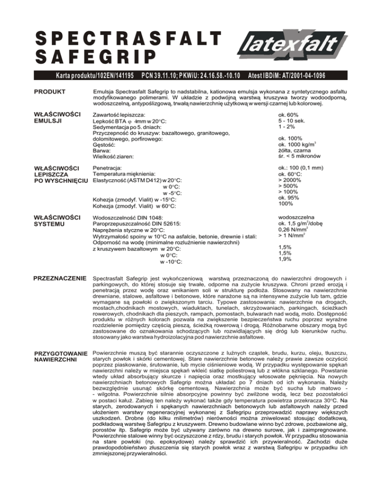 S P E C T R A S FA LT SAFEGRIP Karta produktu/102EN/141195 PCN 39.11.10; PKWiU: 24.16.58.-10.10 Atest IBDiM: AT/2001-04-1096 PRODUKT Emulsja Spectrasfalt Safegrip to nadstabilna, kationowa emulsja wykonana z syntetycznego asfaltu modyfikowanego polimerami. W uk³adzie z podwójn¹ warstw¹ kruszywa tworzy wodoodporn¹, wodoszczeln¹, antypoœlizgow¹, trwa³¹ nawierzchniê u¿ytkow¹ w wersji czarnej lub kolorowej. W£AŒCIWOŒCI EMULSJI Zawartoœæ lepiszcza: Lepkoœæ BTA j 4mm w 20°C: Sedymentacja po 5. dniach: Przyczepnoœæ do kruszyw: bazaltowego, granitowego, dolomitowego, porfirowego: Gêstoœæ: Barwa: Wielkoœæ ziaren: Penetracja: W£AŒCIWOŒCI Temperatura miêknienia: LEPISZCZA PO WYSCHNIÊCIU Elastycznoœæ (ASTM D412) w 20°C: w 0°C: w -5°C: Kohezja (zmodyf. Vialit) w -15°C: Kohezja (zmodyf. Vialit) w 60°C: W£AŒCIWOŒCI SYSTEMU Wodoszczelnoœæ DIN 1048: Paroprzepuszczalnoœæ DIN 52615: Naprê¿enia styczne w 20°C: Wytrzyma³oœæ spoiny w 10°C na asfalcie, betonie, drewnie i stali: Odpornoœæ na wodê (minimalne rozluŸnienie nawierzchni) z kruszywem bazaltowym w 20°C: w 0°C: w -10°C: ok. 60% 5 - 10 sek. 1 - 2% ok. 100% ok. 1000 kg/m3 ¿ó³ta, czarna œr. < 5 mikronów ok.: 100 (0,1 mm) ok. 60°C: > 2000% > 500% > 100% ok. 95% 100% wodoszczelna ok. 1,5 g/m2/dobê 0,26 N/mm2 > 1 N/mm2 1,5% 1,5% 1,9% PRZEZNACZENIE Spectrasfalt Safegrip jest wykoñczeniow¹ warstw¹ przeznaczon¹ do nawierzchni drogowych i parkingowych, do której stosuje siê trwa³e, odporne na zu¿ycie kruszywa. Chroni przed erozj¹ i penetracj¹ przez wodê oraz wnikaniem soli w strukturê pod³o¿a. Stosowany na nawierzchnie drewniane, stalowe, asfaltowe i betonowe, które nara¿one s¹ na intensywne zu¿ycie lub tam, gdzie wymagane s¹ pow³oki o zwiêkszonym tarciu. Typowe zastosowania: nawierzchnie na drogach, mostach,chodnikach mostowych, wiaduktach, tunelach, skrzy¿owaniach, parkingach, œcie¿kach rowerowych, chodnikach dla pieszych, rampach, pomostach, bulwarach nad wod¹, molo. Dostêpnoœæ produktu w ró¿nych kolorach pozwala na zwiêkszenie bezpieczeñstwa ruchu poprzez wyraŸne rozdzielenie pomiêdzy czêœci¹ piesz¹, œcie¿k¹ rowerow¹ i drog¹. Ró¿nobarwne obszary mog¹ byæ zastosowane do oznakowania schodz¹cych lub rozwidlaj¹cych siê dróg lub kierunków ruchu. stosowany jako warstwa hydroizolacyjna pod nawierzchnie asfaltowe. PRZYGOTOWANIE Powierzchnie musz¹ byæ starannie oczyszczone z luŸnych cz¹stek, brudu, kurzu, oleju, t³uszczu, starych pow³ok i skórki cementowej. Stare nawierzchnie betonowe nale¿y prawie zawsze oczyœciæ NAWIERZCHNI poprzez piaskowanie, œrutowanie, lub mycie ciœnieniowe wod¹. W przypadku wystêpowanie spêkañ nawierzchni nale¿y w miejsca spêkañ wkleiæ siatkê poliestrow¹ lub z w³ókna szklanego. Powstanie wtedy uk³ad absorbuj¹cy skurcze i napiêcia oraz mostkuj¹cy w³osowate pêkniêcia. Na nowych nawierzchniach betonowych Safegrip mo¿na uk³adaæ po 7 dniach od ich wykonania. Nale¿y bezwzglêdnie usun¹æ skórkê cementow¹. Nawierzchnia mo¿e byæ sucha lub matowo - wilgotna. Powierzchnie silnie absorpcyjne powinny byæ zwil¿one wod¹, lecz bez pozosta³oœci w postaci ka³u¿. Zabieg ten nale¿y wykonaæ tak¿e gdy temperatura powietrza przekracza 30°C. Na starych, zerodowanych i spêkanych nawierzchniach betonowych lub asfaltowych nale¿y przed u³o¿eniem warstwy regeneracyjnej wykonanej z Safegripu przeprowadziæ naprawy wiêkszych uszkodzeñ. Drobne (do kilku milimetrów) nierównoœci mo¿na zniwelowaæ stosuj¹c dodatkow¹, podk³adow¹ warstwê Safegripu z kruszywem. Drewno budowlane winno byæ zdrowe, pozbawione alg, porostów itp. Safegrip mo¿e byæ u¿ywany zarówno na drewno surowe, jak i zaimpregnowane. Powierzchnie stalowe winny byæ oczyszczone z rdzy, brudu i starych pow³ok. W przypadku stosowania na stare pow³oki (np. epoksydowe) nale¿y sprawdziæ ich przywieralnoœæ. Zachodzi du¿e prawdopodobieñstwo z³uszczenia siê starych pow³ok wraz z warstw¹ Safegripu w przypadku ich zmniejszonej przywieralnoœci. PRZYGOTOWANIE EMULSJI KOLOROWEJ Do emulsji transparentnej oznaczonej na etykiecie nazw¹ Safegrip Color nale¿y dodaæ pastê pigmentow¹. W tym celu nale¿y otworzyæ beczkê, zdj¹æ dekiel, odwin¹æ foliê i zawartoœæ wymieszaæ przy pomocy mieszad³a wolnoobrotowego przez okres 10 minut siêgaj¹c mieszad³em do dna beczki. Nale¿y przy tym zachowaæ ostro¿noœæ, gdy¿ ca³a beczka jest wyœcie³ana pojemnikiem foliowym. Do beczki nale¿y wlaæ odpowiedni pigment (1 kg pigmentu na 25 kg emulsji) i przy pomocy mieszad³a ca³oœæ wymieszaæ a¿ do osi¹gniêcia jednolitej barwy. APLIKACJA Na oczyszczon¹ nawierzchniê na³o¿yæ przy pomocy szczotki lub wa³ka malarskiego warstwê emulsji Safegrip w iloœci 0,8 - 1,5 kg/m2(zu¿ycie emulsji zale¿ne od wielkoœci u¿ytego kruszywa), a nastêpnie rozsypaæ warstwê przemytego t³ucznia odpowiedniego rodzaju na mokr¹ emulsjê w iloœci ok. 8 kg/m2. Nastêpnie: - lekko zwalcowaæ powierzchniê walcem typu ogrodowego, - po ca³kowitym zwi¹zaniu emulsji i utwardzeniu warstwy t³ucznia usun¹æ jego nadmiar, - na³o¿yæ kolejn¹ warstwê emulsji Safegrip w iloœci ok. 0,8 - 1,5 kg/m2, upewniaj¹c siê, ¿e emulsja zosta³a rozprowadzona dok³adnie i równomiernie, - na wilgotn¹ emulsjê na³o¿yæ przemyty t³uczeñ odpowiedniego rodzaju w iloœci ok. 12 kg/m2, - ca³oœæ dok³adnie zwalcowaæ, - po ca³kowitym utwardzeniu nawierzchni usun¹æ zbêdny t³uczeñ. Aby zapewniæ estetykê wykonania linie rozgraniczaj¹ce nale¿y odci¹æ taœmami maskuj¹cymi, które po zakoñczeniu prac nale¿y usun¹æ. Emulsji Safegrip nie wolno nak³adaæ przy pomocy pomp ani rozpylaczy normalnie wykorzystywanych przy budowie dróg. Emulsja mog³aby zatkaæ pompê, trwale j¹ uszkadzaj¹c. DOBÓR WIELKOŒCI T£UCZNIA Warstwa dolna (mm) 2 - 4 (5) 2-6 4 - 6 (8) 8 - 12 Warstwa nawierzchniowa (mm) 1-3 1 -4 lub 2 - 4 (5) 2 -5 (6) 4 -8 Zastosowanie k