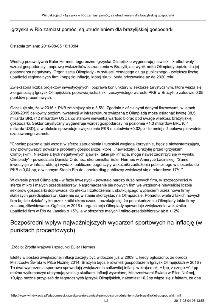 Windykacja.pl - Igrzyska w Rio zamiast pomóc, są utrudnieniem dla brazylijskiej gospodarki Igrzyska w Rio zamiast pomóc, są utrudnieniem dla brazylijskiej gospodarki Ostatnia zmiana: 2016-08-05 16:10:04 Według przewidywań Euler Hermes, tegoroczne Igrzyska Olimpijskie wygenerują niewielki i krótkotrwały wzrost gospodarczy i poprawę wskaźników zatrudnienia w Brazylii, ale wynik netto Olimpiady będzie dla jej gospodarza negatywny. Organizacja Olimpiady - w sytuacji rosnącego długu publicznego - zwiększy liczbę upadłości regionalnych firm i napędzi inflację, której skutki będą odczuwalne aż do 2020 roku. Zwiększona liczba projektów inwestycyjnych i poprawa koniunktury w sektorze turystycznym, które wiążą się z organizacją Igrzysk Olimpijskich, poprawią wskaźniki rzeczywistego wzrostu PKB w Brazylii o zaledwie 0,05 punktów procentowych. Oczekuje się, że w 2016 r. PKB zmniejszy się o 3,5%. Zgodnie z oficjalnymi danymi liczbowymi, w latach 2009-2015 całkowity poziom inwestycji w infrastrukturę związaną z Olimpiadą może osiągnąć kwotę 38,5 miliarda BRL (12 miliardów USD), co stanowi niewielką wartość biorąc pod uwagę wielkość brazylijskiej gospodarki. Sektor turystyczny wygeneruje wzrost gospodarczy na poziomie +1,3 miliardów BRL (0,4 miliarda USD), a w efekcie spowoduje zwiększenie PKB o zaledwie +0.02pp - to mniej niż połowa pierwotnie szacowanego wzrostu. "Chociaż pozornie taki wzrost w sferze zatrudnienia i turystyki wygląda korzystnie, będzie niewystarczający, aby zrównoważyć poważne problemy gospodarcze, które nawiedziły Brazylię przed Igrzyskami Olimpijskimi. Niektóre z tych negatywnych zjawisk, takie jak inflacja, mogą nawet zaostrzyć się w wyniku Olimpiady" - powiedziała Daniela Ordonez, ekonomistka Euler Hermes w Ameryce Łacińskiej. "Same inwestycje w infrastrukturę i wydatki publiczne pogorszyły wskaźniki zadłużenia publicznego w stosunku do PKB o 0,04 pp, a w samym Stanie Rio de Janeiro dług publiczny zwiększył się o rekordowe 17%." W okresie przed Olimpiadą - w fazie inwestycji - powstało bardzo dużo nowych firm, w szczególności w sferze mikro i małych przedsiębiorstw. Nagromadzenie się nowych firm we względnie niewielkiej liczbie sektorów gospodarki doprowadzi do efektu zatłoczenia , skutkującego wyparciem przez nowe firmy słabszych przedsiębiorstw, które nie są w stanie skorzystać na Olimpiadzie. Ponadto, wiele z takich nowych firm będzie działać tylko przez krótki okres czasu i oczekuje się, że po zakończeniu Olimpiady takie firmy zostaną zlikwidowane. Ogólnie, w 2016 r. organizacja Olimpiady spowoduje zwiększenie wskaźnika upadłości firm w Rio de Janeiro o +5%, a w obszarze małych i mikro-przedsiębiorstw aż o +12%. Bezpośredni wpływ najważniejszych wydarzeń sportowych na inflację (w punktach procentowych) Źródło: Źródła krajowe i szacunki Euler Hermes Efekty w postaci zwiększonej inflacji zaczęły być widoczne już w 2009 r., kiedy ogłoszono, że oprócz Mistrzostw Świata w Piłce Nożnej 2014, Brazylia będzie również gospodarzem Igrzysk Olimpijskich w 2016 r. Te dwa wydarzenia sportowe spowodują zwiększenie całkowitej inflacji w kraju o ok. +1pp, z czego +0,4pp można wytłumaczyć utrzymującymi się skutkami inflacji wywołanej Mistrzostwami Świata w Piłce Nożnej, +0,4pp można przypisać do tegorocznych Igrzysk Olimpijskich, natomiast +0,2pp wiąże się z faktem, że oba http://www.windykacja.pl/wiadomosci,igrzyska-w-rio-zamiast-pomoc-sa-utrudnieniem-dla-brazylijskiej-gospodarki.html 1/2 2017-03-04 08:43:58 Windykacja.pl - Igrzyska w Rio zamiast pomóc, są utrudnieniem dla brazylijskiej gospodarki te wydarzenia zorganizowano w tak krótkim odstępie czasu. "Niestety, w obecnej sytuacji Brazylia jako gospodarz Igrzysk nie jest w stanie wykorzystać potencjalnego, pozytywnego efektu Olimpiady na gospodarkę," powiedziała Ordonez. "Zamiast pozytywnych skutków, z uwagi na krótki odstęp czasu pomiędzy Mistrzostwami Świata w Piłce Nożnej i Igrzyskami Olimpijskimi, skutki dla gospodarki były zdecydowanie negatywne. Biorąc pod uwagę wszystkie aktualne problemy, które przeżywa brazylijska gospodarka, takie dodatkowe pobudzenie i dramat w postaci Olimpiady były zdecydowanie niepotrzebne." Uwaga dotycząca stwierdzeń wybiegających w przyszłość: Stwierdzenia zawarte w niniejszym dokumencie mogą zawierać stwierdzenia dotyczące przyszłych oczekiwań oraz innego rodzaju stwierdzenia wybiegające w przyszłość, oparte na aktualnych opiniach i założeniach kierownictwa firmy, obejmujących znane i nieznane czynniki ryzyka oraz niepewności, które mogą powodować osiągnięcie rzeczywistych wyników, rezultatów lub zdarzeń mogących istotnie odbiegać od tych wyrażonych lub dorozumianych w takich stwierdzeniach. Obok stwierdzeń wybiegających w przyszłość, co wynika z ich kontekstu, wyrazy może , będzie , powinno , oczekuje , planuje , zamierza , przewiduje , uważa , szacuje , prognozuje , potencjalny lub kontynuuje oraz podobne wyrażenia oznaczają stwierdzenia wybiegające w przyszłość. Rzeczywiste wyniki, rezultaty lub zdarzenia mogą w istotnym zakresie odbiegać od przewidywanych w takich stwierdzeniach, między innymi z powodu: (i) ogólnych warunków ekonomicznych, w tym w szczególności warunków ekonomicznych w kluczowych sektorach działalności Grupy Euler Hermes oraz na kluczowych dla niej rynkach, (ii) wyników osiąganych na rynkach finansowych, w tym na rynkach rozwijających się, również ze względu na niestabilność i płynność rynku oraz zdarzenia związane z kredytami, (iii) częstotliwości oraz zakresu zdarzeń objętych ochroną ubezpieczeniową, w tym zdarzeń powodowanych przez klęski żywiołowe oraz wiążących się ze wzrostem wydatków na likwidację szkód, (iv) poziomu powtarzalności zdarzeń, (v) zakresu niespłacanych kredytów, (vi) poziomu stóp procentowych, (vi