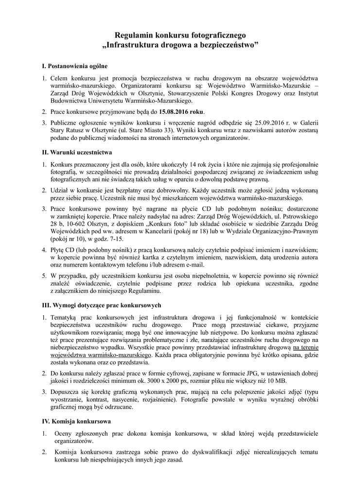 Regulamin konkursu fotograficznego „Infrastruktura drogowa a bezpieczeństwo” I. Postanowienia ogólne 1. Celem konkursu jest promocja bezpieczeństwa w ruchu drogowym na obszarze województwa warmińsko-mazurskiego. Organizatorami konkursu są: Województwo Warmińsko-Mazurskie – Zarząd Dróg Wojewódzkich w Olsztynie, Stowarzyszenie Polski Kongres Drogowy oraz Instytut Budownictwa Uniwersytetu Warmińsko-Mazurskiego. 2. Prace konkursowe przyjmowane będą do 15.08.2016 roku. 3. Publiczne ogłoszenie wyników konkursu i wręczenie nagród odbędzie się 25.09.2016 r. w Galerii Stary Ratusz w Olsztynie (ul. Stare Miasto 33). Wyniki konkursu wraz z nazwiskami autorów zostaną podane do publicznej wiadomości na stronach internetowych organizatorów. II. Warunki uczestnictwa 1. Konkurs przeznaczony jest dla osób, które ukończyły 14 rok życia i które nie zajmują się profesjonalnie fotografią, w szczególności nie prowadzą działalności gospodarczej związanej ze świadczeniem usług fotograficznych ani nie świadczą takich usług w oparciu o dowolną podstawę prawną. 2. Udział w konkursie jest bezpłatny oraz dobrowolny. Każdy uczestnik może zgłosić jedną wykonaną przez siebie pracę. Uczestnik nie musi być mieszkańcem województwa warmińsko-mazurskiego. 3. Prace konkursowe powinny być nagrane na płycie CD lub podobnym nośniku; dostarczone w zamkniętej kopercie. Prace należy nadsyłać na adres: Zarząd Dróg Wojewódzkich, ul. Pstrowskiego 28 b, 10-602 Olsztyn, z dopiskiem „Konkurs foto” lub składać osobiście w siedzibie Zarządu Dróg Wojewódzkich pod ww. adresem w Kancelarii (pokój nr 18) lub w Wydziale Organizacyjno-Prawnym (pokój nr 10), w godz. 7-15. 4. Płytę CD (lub podobny nośnik) z pracą konkursową należy czytelnie podpisać imieniem i nazwiskiem; w kopercie powinna być również kartka z czytelnym imieniem, nazwiskiem, datą urodzenia autora oraz numerem kontaktowym telefonu i/lub adresem e-mail. 5. W przypadku, gdy uczestnikiem konkursu jest osoba niepełnoletnia, w kopercie powinno się również znaleźć oświadczenie, czytelnie podpisane przez rodzica lub opiekuna uczestnika, zgodne z załącznikiem do niniejszego Regulaminu. III. Wymogi dotyczące prac konkursowych 1. Tematyką prac konkursowych jest infrastruktura drogowa i jej funkcjonalność w kontekście bezpieczeństwa uczestników ruchu drogowego. Prace mogą przestawiać ciekawe, przyjazne użytkownikom rozwiązania; mogą być one innowacyjne lub nietypowe. Do konkursu można zgłaszać też prace prezentujące rozwiązania problematyczne i złe, narażające uczestników ruchu drogowego na niebezpieczeństwo wypadku. Wszystkie prace powinny przedstawiać infrastrukturę drogową na terenie województwa warmińsko-mazurskiego. Każda praca obligatoryjnie powinna być krótko opisana, gdzie została wykonana oraz co przedstawia. 2. Do konkursu należy zgłaszać prace w formie cyfrowej, zapisane w formacie JPG, w ustawieniach dobrej jakości i rozdzielczości minimum ok. 3000 x 2000 px, rozmiar pliku nie większy niż 10 MB. 3. Dopuszcza się korektę graficzną wykonanych prac, mającą na celu polepszenie jakości zdjęć (typu wyostrzanie, kontrast, nasycenie, rozjaśnienie). Fotografie powstałe w wyniku wyraźnej obróbki graficznej mogą być odrzucane. IV. Komisja konkursowa 1. Oceny zgłoszonych prac dokona komisja konkursowa, w skład której wejdą przedstawiciele organizatorów. 2. Komisja konkursowa zastrzega sobie prawo do dyskwalifikacji zdjęć nierealizujących tematu konkursu lub niespełniających innych jego zasad. 3. Decyzje komisji konkursowej są ostateczne i nie podlegają weryfikacji. V. Kryteria oceny 1. Komisja konkursowa będzie oceniać prace pod kątem zbieżności z tematyką i założeniami konkursu oraz walorów artystycznych i estetycznych. 2. Z udziału w konkursie mogą zostać wykluczone prace niespełniające kryteriów formalnych konkursu (słaba jakość zdjęć, zbyt mała rozdzielczość, brak opisu lokalizacji lub danych autora itp.) oraz zdjęcia, na których znajdują się dodatkowe znaki i grafiki (daty, znaki wodne, podpisy, ramki). VI. Nagrody 1. Organizatorzy uhonorują nagrodami zdobywców I, II i III miejsca oraz zastrzegają sobie prawo do przyznania 3 wyróżnień. 2. Nagrodą będzie również wystawa prac zwycięskich, wyróżnionych oraz innych prac konkursowych wybranych przez organizatorów, prezentowana w Galerii Stary Ratusz w Olsztynie. 3. Laureaci zostaną powiadomieni o werdykcie komisji konkursowej drogą e-mailową lub telefoniczną i zaproszeni na ceremonię publicznego ogłoszenia wyników. VII Postanowienia końcowe 1. Uczestnik konkursu, z chwilą zgłoszenia pracy do konkursu, oświadcza, że: wyraża zgodę na przetwarzanie jego danych osobowych zgodnie z ustawą o ochronie danych osobowych z dnia 29 sierpnia 1997 r. (Dz.U. z 2015 poz. 2135 z późn. zm.) w zakresie i celu niezbędnym dla przeprowadzenia konkursu z jego udziałem; zgoda jest dobrowolna, jest jednak niezbędna dla udziału w konkursie, akceptuje niniejszy Regulamin, jest autorem zdjęć oraz posiada zgodę osób biorących udział przy ich powstawaniu na uczestnictwo w konkursie oraz publikację; odpowiedzialność za wszelkie roszczenia osób trzecich, które mogłyby w związku z wykonanym zdjęciem zostać skierowane do organizatorów konkursu, przyjmuje na siebie uczestnik konkursu, udziela organizatorom konkursu nieodpłatnej licencji niewyłącznej, uprawniającej organizatorów do korzystania ze zgłoszonych zdjęć przez czas nieoznaczony oraz bez ograniczeń terytorialnych na wszystkich polach eksploatacji, a w szczególności obejmującej uprawnienie do: - utrwalania, - zwielokrotnienia wszelkimi technikami, w tym przede wszystkim techniką drukarską, - wprowadzenia do obrotu w kraju i za granicą, - wprowadzenia do pamięci komputera - publikacji na stronach internetowych i w innych materiałach organizatorów. autor