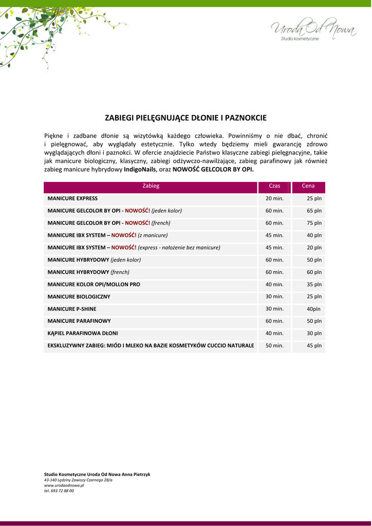 ZABIEGI PIELĘGNUJĄCE DŁONIE I PAZNOKCIE Piękne i zadbane dłonie są wizytówką każdego człowieka. Powinniśmy o nie dbać, chronić i pielęgnować, aby wyglądały estetycznie. Tylko wtedy będziemy mieli gwarancję zdrowo wyglądających dłoni i paznokci. W ofercie znajdziecie Państwo klasyczne zabiegi pielęgnacyjne, takie jak manicure biologiczny, klasyczny, zabiegi odżywczo-nawilżające, zabieg parafinowy jak również zabieg manicure hybrydowy IndigoNails, oraz NOWOŚĆ GELCOLOR BY OPI. Zabieg Czas Cena MANICURE EXPRESS 20 min. 25 pln MANICURE GELCOLOR BY OPI - NOWOŚĆ! (jeden kolor) 60 min. 65 pln MANICURE GELCOLOR BY OPI - NOWOŚĆ! (french) 60 min. 75 pln MANICURE IBX SYSTEM – NOWOŚĆ! (z manicure) 45 min. 40 pln MANICURE IBX SYSTEM – NOWOŚĆ! (express - nałożenie bez manicure) 45 min. 20 pln MANICURE HYBRYDOWY (jeden kolor) 60 min. 50 pln MANICURE HYBRYDOWY (french) 60 min. 60 pln MANICURE KOLOR OPI/MOLLON PRO 40 min. 35 pln MANICURE BIOLOGICZNY 30 min. 25 pln MANICURE P-SHINE 30 min. 40pln MANICURE PARAFINOWY 60 min. 50 pln KĄPIEL PARAFINOWA DŁONI 40 min. 30 pln EKSKLUZYWNY ZABIEG: MIÓD I MLEKO NA BAZIE KOSMETYKÓW CUCCIO NATURALE 50 min. 45 pln Studio Kosmetyczne Uroda Od Nowa Anna Pietrzyk 43-140 Lędziny Zawiszy Czarnego 28/a www.urodaodnowa.pl tel. 693 72 88 00