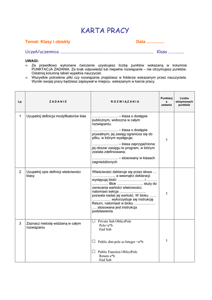 KARTA PRACY Temat: Klasy i obiekty Data ............... Uczeń/uczennica ........................................................................................ Klasa ............... UWAGI: • Za prawidłowo wykonane ćwiczenie uzyskujesz liczbę punktów wskazaną w kolumnie PUNKTACJA ZADANIA. Za brak odpowiedzi lub niepełne rozwiązanie – nie otrzymujesz punktów. Ostatnią kolumnę tabeli wypełnia nauczyciel. • Wszystkie potrzebne pliki czy rozwiązania znajdziesz w folderze wskazanym przez nauczyciela. Wyniki swojej pracy będziesz zapisywał w miejscu wskazanym w karcie pracy. Lp. 1 ZADANI E Uzupełnij definicja modyfikatorów klas ROZW IĄZANIA Punktacj a zadania …………………. – klasa o dostępie publicznym, widoczna w całym rozwiązaniu; …………………. – klasa o dostępie prywatnym; jej zasięg ogranicza się do pliku, w którym występuje; 1 …………………. – klasa zaprzyjaźniona; jej obszar zasięgu to program, w którym została zdefiniowana; …………………. – stosowany w klasach zagnieżdżonych 2 3 Uzupełnij opis definicji właściwości klasy Zaznacz metodę widzianą w całym rozwiązaniu Właściwości deklaruje się przez słowo … ………………., a wewnątrz deklaracji występują bloki: …………………. i ……… ………….. Blok …………………. służy do zwracania wartości właściwości, natomiast sekcja …………………. pozwala nadać jej wartość. W bloku …… ……………. wykorzystuje się instrukcję Return, natomiast w bloku ……………… …. stosowana jest instrukcja podstawienia. 1 Private Sub ObliczPole Pole=a*b End Sub Public dim pole as Integer =a*b Public Function ObliczPole Return a*b End Sub 1 Liczba otrzymanych punktów 4 Zadeklaruj i zainicjuj obiekt o nazwie lekcja klasy Szkoła …………………………………………… …………………………………………… …………………………………………… …………………………………………… 2 …………………………………………… Metody …………………………………………… …………………………………………… Uwagi: ............................................................................................................... Razem ............................................................................................................... Zasady oceniania: 2 pkt. 3 pkt. 4 pkt. 5 pkt. – – – – dop dst db bdb Stopie ń