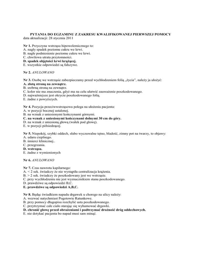 PYTANIA DO EGZAMINU Z ZAKRESU KWALIFIKOWANEJ PIERWSZEJ POMOCY data aktualizacji: 28 stycznia 2011 Nr 1. Przyczyna wstrząsu hipowolemicznego to: A. nagły spadek poziomu cukru we krwi. B. nagłe podniesienie poziomu cukru we krwi. C. chwilowa utrata przytomności. D. spadek objętości krwi krążącej. E. wszystkie odpowiedzi są fałszywe. Nr 2. ANULOWANO Nr 3. Osobę we wstrząsie zabezpieczamy przed wychłodzeniem folią „życia”, należy ja ułożyć: A. złotą stroną na zewnątrz. B. srebrną stroną na zewnątrz. C. kolor nie ma znaczenia, gdyż ma na celu ułatwić zauważenie poszkodowanego. D. najważniejsze jest okrycie poszkodowanego folią. E. żadne z powyższych. Nr 4. Pozycja przeciwwstrząsowa polega na ułożeniu pacjenta: A. w pozycji bocznej ustalonej. B. na wznak z uniesionymi kończynami górnymi. C. na wznak z uniesionymi kończynami dolnymi 30 cm do góry. D. na wznak z uniesioną głową (wałek pod głowę). E. w pozycji półsiedzącej. Nr 5. Niepokój, szybki oddech, słabo wyczuwalne tętno, bladość, zimny pot na twarzy, to objawy: A. udaru cieplnego. B. śmierci klinicznej.. C. przegrzania. D. wstrząsu. E. żadne z wymienionych Nr 6. ANULOWANO Nr 7. Czas nawrotu kapilarnego: A. < 2 sek. świadczy że nie wystąpiła centralizacja krążenia. B. > 2 sek. świadczy że poszkodowany jest we wstrząsie. C. przy wychłodzeniu nie jest wyznacznikiem stanu poszkodowanego. D. prawdziwe są odpowiedzi B,C. E. prawdziwe są odpowiedzi A,B,C. Nr 8. Będąc świadkiem napadu drgawek u chorego na ulicy należy: A. wezwać natychmiast Pogotowie Ratunkowe. B. przy pomocy długopisu rozchylić usta poszkodowanego. C. przytrzymać całe ciało starając się wyhamować drgawki. D. chronić głowę przed obrażeniami i podtrzymać drożność dróg oddechowych. E. nie dotykać pacjenta bo napad musi sam minąć. Nr 9. Wskaż zdanie nieprawdziwe dotyczące ataku padaczki: A. jest utratą przytomności z niepamięcią wsteczną. B. najczęściej dochodzi do zagryzienia języka i należy włożyć patyk między zęby, by nie było krwawienia (nawet podczas drgawek należy próbować). C. często bezwiednie następuje oddanie moczu. D. dochodzi do urazów głowy podczas drgawek. E. drgawki, prężenia, obejmują całe ciało. Nr 10. Drgawki mogą występować przy: A. urazie mózgowo-czaszkowym. B. zatruciu, niedotlenieniu. C. wysokiej temperaturze ciała, szczególnie u dzieci. D. odwodnieniu, udarze cieplnym. E. wszystkie odpowiedzi są prawdziwe. Nr 11. Cukrzyca to stan gdy w organizmie jest: A. zmniejszona ilość glukozy we krwi. B. zwiększone stężenie glukozy we krwi. C. uczulenie na cukier. D. duże spożycie cukru (ciastka, cukierki). E. zaburzenie wchłaniania cukru w żołądku. Nr 12. Śpiączka cukrzycowa to stan: A. gdy w organizmie jest znaczny niedobór insuliny. B. występują zaburzenia świadomości aż do jej utraty. C. gdy doszło do przedawkowania insuliny. D. prawidłowe są odpowiedzi A,B. E. prawidłowe są odpowiedzi A,B,C. Nr 13. U osoby, która jest nieprzytomna, śpiączkę cukrzycową rozpoznasz na podstawie: A. obecności cukierków w kieszeni, bo to chroni przed „niedocukrzeniem”. B. poczujesz zapach acetonu w wydychanym powietrzu. C. skóra i język są suche. D. prawidłowe są odpowiedzi A,B,C. E prawidłowe są odpowiedzi B,C. Nr 14. Hipoglikemia to stan: A. w którym może dojść do utraty przytomności. B. charakteryzujący się niskim poziomem glukozy we krwi (znacznie poniżej normy). C. charakteryzujący się objawami podobnymi jak we wstrząsie. D. w którym jak najszybciej podasz insulinę. E. prawidłowe są odpowiedzi A,B,C. Nr 15. Prawdziwe stwierdzenie to: A. śpiączka cukrzycowa to stan w którym jest znacznie podwyższone stężenie glukozy we krwi. B. w śpiączce cukrzycowej wyczuwalny jest zapach acetonu z ust chorego. C. hipoglikemia to stan bezpośredniego zagrożenia życia. D. w hipoglikemii pojawiają się objawy podobne, jak we wstrząsie. E. wszystkie odpowiedzi są prawdziwe. Nr 16. Na przystanku autobusowym leży na brzuchu mężczyzna w wieku ok. 55 lat: A. zapewne jest pijany i wzywasz policję. B. układasz go w pozycji bocznej ustalonej, wzywasz policję. C. układasz go na wznak i sprawdzasz oznaki życia. D. wsiadasz do autobusu bo nadjechał ten na który czekałeś. E. pytasz czy jest w pobliżu lekarz. Nr 17. W autobusie siedzi mężczyzna, skarżący się na ból piekący w kl. piersiowej, jest blady i spocony, oddycha szybko, Twoje działanie będzie polegało na: A. natychmiast wyprowadzisz go z autobusu i zaprowadzisz na postój taksówek by pojechał do szpitala. B. nie pozwolisz mu wstać, rozepniesz koszulę, zapytasz czy leczy się na serce, wezwiesz pomoc, rozważysz ułożenie w pozycji przeciwwstrząsowej. C. podasz mu preparat aspiryny jeśli go posiada i zażywa stale. D. prawdziwe są odpowiedzi A,C. E. prawdziwe są odpowiedzi B,C. Nr 18. U osoby, która uskarżała się na ból w kl. piersiowej doszło w Twojej obecności do utraty przytomności i osunięcia na podłogę: A. układasz osobę w pozycji bocznej ustalonej z utrzymaniem drożności dróg oddechowych i wzywasz pomoc. B. układasz osobę na wznak z nogami uniesionymi około 30cm do góry i wzywasz pomoc. C. sprawdzasz czy w kieszeni poszkodowany nie ma leków na serce by je podać. D. udrażniasz drogi oddechowe i sprawdzasz obecność oddechu, podejmujesz masaż serca jeśli jest brak oddechu. E. po stwierdzeniu braku oddechu prowadzisz oddech zastępczy. Nr 19. Brak oddechu u nieprzytomnego stanowi podstawę do podjęcia reanimacji w schemacie: A. 2 wdechy, 15 uciśnięć kl. piersiowej. B. 2 wdechy, 30 uciśnięć kl. piersiowej. C. 15 uciśnięć kl. Piersiowej, 2 wdechy. D. 30 uciśnięć kl. piersiowej, 2 wdechy. E. wszystkie odpowiedzi są prawdziwe. Nr 20. Do często spotykanych objawów zawału m. sercowego należą: A. piekący ból w kl. piersiowej. B. drętwienie lewej kończyny górnej. C. uczucie lęku i