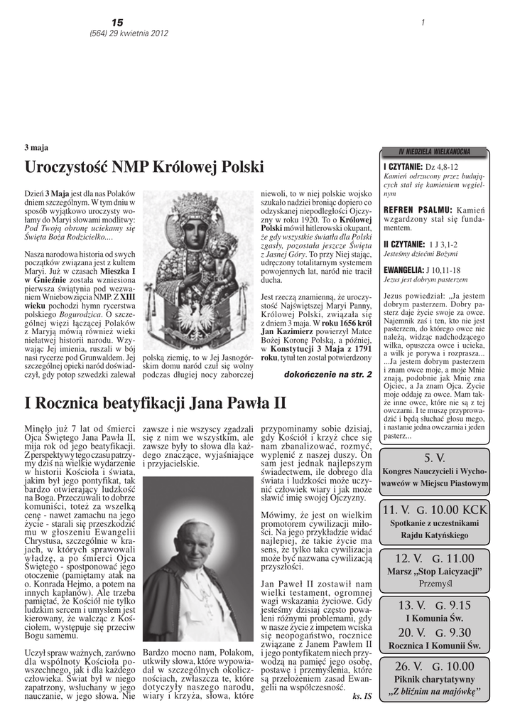 15 1 (564) 29 kwietnia 2012 3 maja IV NIEDZIELA WIELKANOCNA Uroczystość NMP Królowej Polski I CZYTANIE: Dz 4,8-12 Dzień 3 Maja jest dla nas Polaków dniem szczególnym. W tym dniu w sposób wyjątkowo uroczysty wołamy do Maryi słowami modlitwy: Pod Twoją obronę uciekamy się Święta Boża Rodzicielko.... REFREN PSALMU: Kamień wzgardzony stał się fundamentem. Nasza narodowa historia od swych początków związana jest z kultem Maryi. Już w czasach Mieszka I w Gnieźnie została wzniesiona pierwsza świątynia pod wezwaniem Wniebowzięcia NMP. Z XIII wieku pochodzi hymn rycerstwa polskiego Bogurodzica. O szczególnej więzi łączącej Polaków z Maryją mówią również wieki niełatwej historii narodu. Wzywając Jej imienia, ruszali w bój nasi rycerze pod Grunwaldem. Jej polską ziemię, to w Jej Jasnogórszczególnej opieki naród doświad- skim domu naród czuł się wolny czył, gdy potop szwedzki zalewał podczas długiej nocy zaborczej niewoli, to w niej polskie wojsko szukało nadziei broniąc dopiero co odzyskanej niepodległości Ojczyzny w roku 1920. To o Królowej Polski mówił hitlerowski okupant, że gdy wszystkie światła dla Polski zgasły, pozostała jeszcze Święta z Jasnej Góry. To przy Niej stając, udręczony totalitarnym systemem powojennych lat, naród nie tracił ducha. Jest rzeczą znamienną, że uroczystość Najświętszej Maryi Panny, Królowej Polski, związała się z dniem 3 maja. W roku 1656 król Jan Kazimierz powierzył Matce Bożej Koronę Polską, a później, w Konstytucji 3 Maja z 1791 roku, tytuł ten został potwierdzony dokończenie na str. 2 I Rocznica beatyfikacji Jana Pawła II Minęło już 7 lat od śmierci Ojca Świętego Jana Pawła II, mija rok od jego beatyfikacji. Z perspektywy tego czasu patrzymy dziś na wielkie wydarzenie w historii Kościoła i świata, jakim był jego pontyfikat, tak bardzo otwierający ludzkość na Boga. Przeczuwali to dobrze komuniści, toteż za wszelką cenę - nawet zamachu na jego życie - starali się przeszkodzić mu w głoszeniu Ewangelii Chrystusa, szczególnie w krajach, w których sprawowali władzę, a po śmierci Ojca Świętego - spostponować jego otoczenie (pamiętamy atak na o. Konrada Hejmo, a potem na innych kapłanów). Ale trzeba pamiętać, że Kościół nie tylko ludzkim sercem i umysłem jest kierowany, że walcząc z Kościołem, występuje się przeciw Bogu samemu. zawsze i nie wszyscy zgadzali się z nim we wszystkim, ale zawsze były to słowa dla każdego znaczące, wyjaśniające i przyjacielskie. Uczył spraw ważnych, zarówno dla wspólnoty Kościoła powszechnego, jak i dla każdego człowieka. Świat był w niego zapatrzony, wsłuchany w jego nauczanie, w jego słowa. Nie Bardzo mocno nam, Polakom, utkwiły słowa, które wypowiadał w szczególnych okolicznościach, zwłaszcza te, które dotyczyły naszego narodu, wiary i krzyża, słowa, które Kamień odrzucony przez budujących stał się kamieniem węgielnym II CZYTANIE: 1 J 3,1-2 Jesteśmy dziećmi Bożymi EWANGELIA: J 10,11-18 Jezus jest dobrym pasterzem Jezus powiedział: „Ja jestem dobrym pasterzem. Dobry pasterz daje życie swoje za owce. Najemnik zaś i ten, kto nie jest pasterzem, do którego owce nie należą, widząc nadchodzącego wilka, opuszcza owce i ucieka, a wilk je porywa i rozprasza... ...Ja jestem dobrym pasterzem i znam owce moje, a moje Mnie znają, podobnie jak Mnie zna Ojciec, a Ja znam Ojca. Życie moje oddaję za owce. Mam także inne owce, które nie są z tej owczarni. I te muszę przyprowadzić i będą słuchać głosu mego, i nastanie jedna owczarnia i jeden pasterz... przypominamy sobie dzisiaj, gdy Kościół i krzyż chce się nam zbanalizować, rozmyć, wyplenić z naszej duszy. On 5. V. sam jest jednak najlepszym świadectwem, ile dobrego dla Kongres Nauczycieli i Wychoświata i ludzkości może uczy- wawców w Miejscu Piastowym nić człowiek wiary i jak może sławić imię swojej Ojczyzny. Mówimy, że jest on wielkim promotorem cywilizacji miłości. Na jego przykładzie widać najlepiej, że takie życie ma sens, że tylko taka cywilizacja może być nazwana cywilizacją przyszłości. Jan Paweł II zostawił nam wielki testament, ogromnej wagi wskazania życiowe. Gdy jesteśmy dzisiaj często powaleni różnymi problemami, gdy w nasze życie z impetem wciska się neopogaństwo, rocznice związane z Janem Pawłem II i jego pontyfikatem niech przywodzą na pamięć jego osobę, postawę i przemyślenia, które są przełożeniem zasad Ewangelii na współczesność. ks. IS 11. V. g. 10.00 KCK Spotkanie z uczestnikami Rajdu Katyńskiego 12. V. g. 11.00 Marsz „Stop Laicyzacji” Przemyśl 13. V. g. 9.15 I Komunia Św. 20. V. g. 9.30 Rocznica I Komunii Św. 26. V. g. 10.00 Piknik charytatywny „Z bliźnim na majówkę” Chrystus Królem 29 kwietnia - 5 maja Tydzień Modlitw o Powołania wzrastania w miłości i służbie Jezusowi Chrystusowi - Głowie, Pasterzowi i Oblubieńcowi Kościoła, w miłości, która zawsze jest odpowiedzią na wyprzedzającą, wolną i darmo daną miłość Boga w Chrystusie” (Pastores dabo vobis, 25). Każde specyficzne powołanie rodzi się z inicjatywy Boga i jest dziełem miłości Boga. To On czyni „pierwszy krok” i to nie ze względu na szczególną dobroć odkrytą w nas, lecz ze względu na obecność swojej miłości „rozlanej w sercach naszych przez Ducha Świętego” (Rz 5,5)... Orędzie Benedykta XVI na 49 Światowy Dzień Modlitw o Powołania /fragmenty/ Drodzy Bracia i Siostry! Czterdziesty dziewiąty Światowy Dzień Modlitw o Powołania, który będzie obchodzony 29 kwietnia 2012 roku, w czwartą Niedzielę Wielkanocną, to zaproszenie do refleksji na temat: Powołania darem miłości Boga. Źródłem każdego doskonałego daru jest Bóg-Miłość. Bóg jest miłością: „kto trwa w miłości, ten trwa w Bogu, a Bóg trwa w nim (1 J 4, 16). Pismo Święte opowiada historię tego pierwotnego związku między Bogi