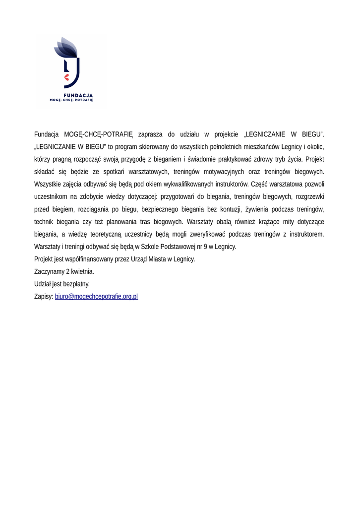 Fundacja MOGĘ-CHCĘ-POTRAFIĘ zaprasza do udziału w projekcie „LEGNICZANIE W BIEGU”. „LEGNICZANIE W BIEGU” to program skierowany do wszystkich pełnoletnich mieszkańców Legnicy i okolic, którzy pragną rozpocząć swoją przygodę z bieganiem i świadomie praktykować zdrowy tryb życia. Projekt składać się będzie ze spotkań warsztatowych, treningów motywacyjnych oraz treningów biegowych. Wszystkie zajęcia odbywać się będą pod okiem wykwalifikowanych instruktorów. Część warsztatowa pozwoli uczestnikom na zdobycie wiedzy dotyczącej: przygotowań do biegania, treningów biegowych, rozgrzewki przed biegiem, rozciągania po biegu, bezpiecznego biegania bez kontuzji, żywienia podczas treningów, technik biegania czy też planowania tras biegowych. Warsztaty obalą również krążące mity dotyczące biegania, a wiedzę teoretyczną uczestnicy będą mogli zweryfikować podczas treningów z instruktorem. Warsztaty i treningi odbywać się będą w Szkole Podstawowej nr 9 w Legnicy. Projekt jest współfinansowany przez Urząd Miasta w Legnicy. Zaczynamy 2 kwietnia. Udział jest bezpłatny. Zapisy: [email protected]