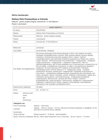 Oferty inwestycyjne Zielony Park Przemysłowy w Cierznie Debrzno - gmina miejsko-wiejska, Cierznie 64, 77-310 Debrzno Powiat: człuchowski DANE OBIEKTU ID oferty: 2012/IiP165 Nazwa: Zielony Park Przemysłowy w Cierznie Miejscowość: Debrzno - gmina miejsko-wiejska Powiat: człuchowski Adres: Cierznie 64, 77-310 Debrzno Właściciel: samorząd Typ działki: przemysłowa, usługowa Na terenie Zielonego Parku Przemysłowego w 2011 roku oddano do użytku Inkubator Przedsiębiorczości Cierznie, który stanowi lokalne centrum obsługi inwestora. Przeznaczony jest pod wynajem mikro, małym i średnim przedsiębiorstwom pod wieloraką działalność gospodarczą. Składa się z dwóch części: biurowo - administracyjnej oraz produkcyjno – magazynowo – usługowej. Część produkcyjno – magazynowo – usługowa o powierzchni: 740 m2, jednokondygnacyjna. Jest to hala składająca się z 8 pomieszczeń o powierzchni ok. 83 m2 każde, z możliwością ich łączenia, w części z samodzielnymi wjazdami i wejściami. W chwili obecnej w IPC znajduje się 6 podmiotów. Inkubator Typ działki uszczegółowienie: Przedsiębiorczości Cierznie oferuje m. in. następujące usługi: - wynajem powierzchni biurowej, produkcyjno- magazynowo- usługowej na korzystnych warunkach; - profesjonalna obsługa biurowa (wewnętrzna sieć internetowa, fax, ksero, komputer, skaner, drukarka, rzutnik, projektor multimedialny, laptop itp.); możliwość skorzystania z sali konferencyjnej; - profesjonalne doradztwo organizacyjne, ekonomiczne i prawne dla mikro, małych i średnich przedsiębiorców, usługi doradcze i informacyjne, współpraca z organizacjami krajowymi i zagranicznymi (sektor rządowy, samorządowy i pozarządowy) zajmującymi się rozwojem przedsiębiorczości. Powierzchnia całkowita: 45.26ha Cena: 20 – 21 PLN / m² Media: elektryczność woda gaz kanalizacja Odległość od: Portu morskiego: Gdańsk – 136 kmkm Lotniska: Gdańsk – 136 km, Poznań – 131 km. Nieczynne lotnisko wojskowe w odległości 11 km od Cierzni na terenie Gminy Lipkakm Autostrady: - Drogi krajowej: Droga krajowa E – 22 Berlin – Kaliningradkm Stacji / bocznicy kolejowej: Bińcze- 14km,Lipka Krajeńska 15 km, Człuchów – 16 km, Czarne – 17 kmkm 1 Dane kontaktowe: Anna Rajzer [email protected] tel. 58 32 33 180 Istnieje możliwość powiększenia terenu o 4ha lasu użyczonego Miastu i Gminie Debrzno przez Nadleśnictwo Człuchów dla celów rekreacyjno - edukacyjnych Do 45,26 ha terenu przylega teren o obszarze 9,87 ha i jest objęty statusem Podstrefy „Debrzno” Słupskiej Specjalnej Strefy Ekonomicznej Ostatnia aktualizacja: czerwiec 2016 Galeria zdjęć: 2
