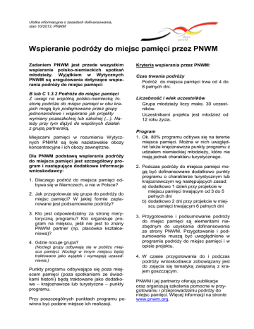 Ulotka informacyjna o zasadach dofinansowania, stan 10/2013, PNWM Wspieranie podróży do miejsc pamięci przez PNWM Zadaniem PNWM jest przede wszystkim wspieranie polsko-niemieckich spotkań młodzieży. Wyjątkiem w Wytycznych PNWM są uregulowania dotyczące wspierania podróży do miejsc pamięci: B lub C 1.3.2 Podróże do miejsc pamięci Z uwagi na wspólną polsko-niemiecką historię podróże do miejsc pamięci w obu krajach mogą być podejmowane przez grupy jednonarodowe i wspierane jak projekty wymiany pozaszkolnej lub szkolnej (...). Należy przy tym dążyć do wspólnych działań z grupą partnerską. Miejscami pamięci w rozumieniu Wytycznych PNWM są byłe nazistowskie obozy koncentracyjne i ich obozy zewnętrzne. Dla PNWM podstawą wspierania podróży do miejsca pamięci jest szczegółowy program i następujące dodatkowe informacje wnioskodawcy: 1. Dlaczego podróż do miejsca pamięci odbywa się w Niemczech, a nie w Polsce? 2. Jak przygotowuje się grupa do podróży do miejsc pamięci? W jakiej formie zaplanowane jest podsumowanie podróży? 3. Kto jest odpowiedzialny za stronę merytoryczną programu? Kto organizuje program na miejscu, jeśli nie jest to znany PNWM partner (np. placówka kształceniowa)? 4. Gdzie nocuje grupa? (Noclegi grupy odbywają się w pobliżu miejsca pamięci. Noclegi w innym miejscu będą traktowane jako wyjątek i wymagają uzasadnienia.) Punkty programu odbywające się poza miejscem pamięci (poza spotkaniami ze świadkami historii) będą traktowane jako dodatkowe – krajoznawcze lub turystyczne – punkty programu. Przy poszczególnych punktach programu powinno być podane miejsce ich realizacji. Kryteria wspierania przez PNWM: Czas trwania podróży Podróż do miejsca pamięci trwa od 4 do 8 pełnych dni. Liczebność i wiek uczestników Grupa młodzieży liczy maks. 30 uczestników. Uczestnikami projektu jest młodzież od 12 roku życia. Program 1. Ok. 80% programu odbywa się na terenie miejsca pamięci. Można w nich uwzględnić także krajoznawcze punkty programu z udziałem niemieckiej młodzieży, które nie mają jednak charakteru turystycznego. 2. Podczas podróży do miejsca pamięci mogą być dofinansowane dodatkowo punkty programu o charakterze turystycznym lub krajoznawczym wg następujących zasad: a) dodatkowo 1 dzień przy projekcie w miejscu pamięci trwającym od 3 do 5 pełnych dni b) dodatkowo 2 dni przy projekcie w miejscu pamięci trwającym 6 pełnych dni 3. Przygotowanie i podsumowanie podróży do miejsc pamięci są elementami niezbędnym do uzyskania dofinansowania ze strony PNWM. Przygotowanie i podsumowanie muszą być uwzględnione w programie podróży do miejsc pamięci i w opisie projektu. 4. W czasie przygotowania do i podczas podróży wnioskodawca zobowiązany jest do zajęcia się tematyką związaną z krajem goszczącym. PNWM i jej partnerzy oferują publikacje oraz organizują szkolenia pomocne w przygotowaniu i przeprowadzaniu podróży do miejsc pamięci. Więcej informacji na stronie www.pnwm.org.