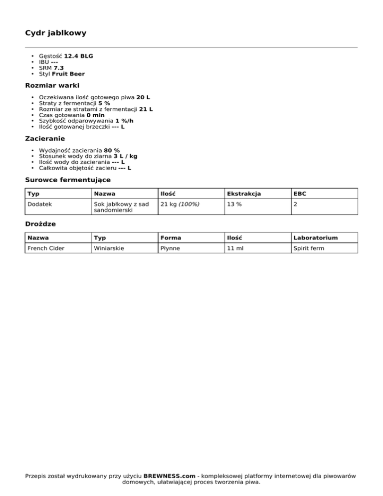 Cydr jablkowy • • • • Gęstość 12.4 BLG IBU --SRM 7.3 Styl Fruit Beer Rozmiar warki • • • • • • Oczekiwana ilość gotowego piwa 20 L Straty z fermentacji 5 % Rozmiar ze stratami z fermentacji 21 L Czas gotowania 0 min Szybkość odparowywania 1 %/h Ilość gotowanej brzeczki --- L Zacieranie • • • • Wydajność zacierania 80 % Stosunek wody do ziarna 3 L / kg Ilość wody do zacierania --- L Całkowita objętość zacieru --- L Surowce fermentujące Typ Nazwa Ilość Ekstrakcja EBC Dodatek Sok jabłkowy z sad sandomierski 21 kg (100%) 13 % 2 Nazwa Typ Forma Ilość Laboratorium French Cider Winiarskie Płynne 11 ml Spirit ferm Drożdze Przepis został wydrukowany przy użyciu BREWNESS.com - kompleksowej platformy internetowej dla piwowarów domowych, ułatwiającej proces tworzenia piwa.