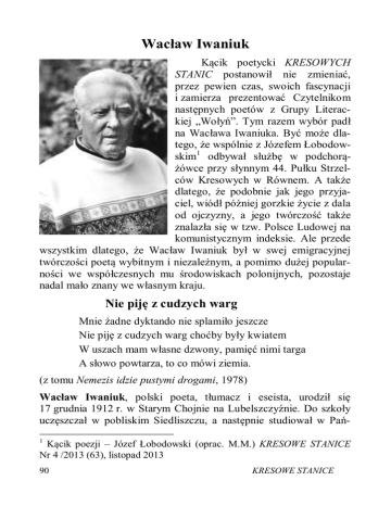 Wacław Iwaniuk Kącik poetycki KRESOWYCH STANIC postanowił nie zmieniać, przez pewien czas, swoich fascynacji i zamierza prezentować Czytelnikom następnych poetów z Grupy Literackiej „Wołyń”. Tym razem wybór padł na Wacława Iwaniuka. Być może dlatego, że wspólnie z Józefem Łobodowskim1 odbywał służbę w podchorążówce przy słynnym 44. Pułku Strzelców Kresowych w Równem. A także dlatego, że podobnie jak jego przyjaciel, wiódł później gorzkie życie z dala od ojczyzny, a jego twórczość także znalazła się w tzw. Polsce Ludowej na komunistycznym indeksie. Ale przede wszystkim dlatego, że Wacław Iwaniuk był w swej emigracyjnej twórczości poetą wybitnym i niezależnym, a pomimo dużej popularności we współczesnych mu środowiskach polonijnych, pozostaje nadal mało znany we własnym kraju. Nie piję z cudzych warg Mnie żadne dyktando nie splamiło jeszcze Nie piję z cudzych warg choćby były kwiatem W uszach mam własne dzwony, pamięć nimi targa A słowo powtarza, to co mówi ziemia. (z tomu Nemezis idzie pustymi drogami, 1978) Wacław Iwaniuk, polski poeta, tłumacz i eseista, urodził się 17 grudnia 1912 r. w Starym Chojnie na Lubelszczyźnie. Do szkoły uczęszczał w pobliskim Siedliszczu, a następnie studiował w Pań1 Kącik poezji – Józef Łobodowski (oprac. M.M.) KRESOWE STANICE Nr 4 /2013 (63), listopad 2013 90 KRESOWE STANICE stwowym Seminarium Nauczycielskim w Chełmie. Był uczniem wybitnego polonisty, poety i założyciela chełmskiej „Kameny” Kazimierza Andrzeja Jaworskiego. W tych latach poznał też Józefa Czechowicza i jego utwory. Osoby te wywarły decydujący wpływ na jego zainteresowanie literaturą i poezją. Pierwsze próby poetyckie Iwaniuka miały miejsce w seminaryjnym kółku literackim, co było częstym zjawiskiem w ówczesnych czasach. Po ukończeniu seminarium i służbie wojskowej w szkole podchorążych w Równem na Wołyniu, studiował w latach 1936-1938 w Warszawie na wydziale prawno-ekonomicznym Wolnej Wszechnicy Polskiej. Sporadycznie mieszkał w warszawskim gnieździe poetyckim, lubelsko-chełmskowołyńskiej cyganerii, wraz z Domińskim, Łobodowskim, Michalskim, Mrozowskim, Piętakiem i innymi „cyganami”, w sublokatorskim pokoju na Dobrej 9. Pokój ten, podobnie jak jego właścicielka, słynna w okolicy z wielu zalet, praczka Rozalia Sawicka oraz jego mieszkańcy, przeszli do historii w wielu utworach literackich2, również w wierszach Iwaniuka, Łobodowskiego i Piętaka. 2 M.in. Wacław Mrozowski, Cyganeria, Wydawnictwo Lubelskie 1963. W kilku źródłach napotkano na błędne informacje podające, że tajemnice pokoju przy ulicy Dobrej 9 opisał Zbigniew Uniłowski w popularnej powieści Wspólny pokój, na podstawie której powstał w końcu lat 50. XX w. obyczajowy film o tym samym tytule. Tymczasem oba te dzieła przedstawiały stałych i przygodnych sublokatorów pokoju w kamienicy przy Nowowiniarskiej 2, przygarniętych do mieszkania swojej matki przez Stanisława Ryszarda Dobrowolskiego, jednego z poetów warszawskiej „Kwadrygi”. Stanowili oni w większości barwne środowisko literackie Warszawy tworzące towarzyskie, poetyckie konfraternie „Kwadrygę” i „Skamandrytów” oraz okupujące godzinami stoliki w słynnej kawiarni „Ziemiańskiej”. W swojej książce Wacław Mrozowski wspomina: „Dziś zastanawiam się, dlaczego kontakty nasze, pomimo pokrewieństw literackich i społecznych, nas, mieszkańców „wspólnego pokoju” na Dobrej, z innymi mieszkańcami, jakże podobnego „wspólnego pokoju” na Nowowiniarskiej, były zupełnie luźne. Byli przecież tylko o parę lat starsi, a jeśli chodzi o dorobek pisarski, niewątpliwie ważki, swym ciężarem nie przewyższał naszego. Pozostanie to tajemnicą tamtych czasów.” KRESOWE STANICE 91 W 1936 roku Czesław Janczarski opublikował poemat Pełnia czerwca Wacława Iwaniuka w formie pierwszego tomiku Biblioteki Grupy Literackiej „Wołyń”. Dwa lata później (1938) ukazał się zbiór wierszy Dzień apokaliptyczny wydany nakładem Ferdynanda Hoesicka, jako Arkusz Poetycki nr 5. W okresie warszawskim Iwaniuk pozostawał w kontakcie ze znanym lubelskim poetą Józefem Czechowiczem, którego poznał jeszcze w Chełmie i którego uznawał za światopoglądowego i poetyckiego mentora. Swoje utwory literackie, wiersze, prozę oraz teksty krytyczne drukował w wielu znanych pismach tego czasu m.in. w Kamenie, Miesięczniku Literatury i Sztuki, Kulturze, Okolicy poetów, Zwierciadle, a nawet w Płomyku i Płomyczku. I podobnie, jak to było w przypadku milionów Polek i Polaków, istotny wpływ na życie Poety wywarła wojna. Napaść Niemiec na Polskę w 1939 r. zastała Wacława Iwaniuka w Argentynie, gdzie przebywał jako stypendysta Funduszu Kultury Narodowej i Ministerstwa Spraw Zagranicznych na praktyce konsularnej w Poselstwie Rzeczypospolitej w Buenos Aires. Bardzo szybko powrócił do Europy i zgłosił się, jako ochotnik do Armii Polskiej we Francji. W Samodzielnej Brygadzie Strzelców Podhalańskich walczył z Niemcami pod Narwikiem. Aresztowany w Hiszpanii podczas próby przedostania się do Anglii przetrzymywany był przez 2,5 roku w znanym, ze straszliwych warunków jakie w nim panowały, obozie koncentracyjnym w Miranda de Ebro. Po zwolnieniu z obozu (w wyniku tajnych porozumień aliantów z hiszpańskim rządem) w marcu 1943 r. przez Portugalię i Gibraltar dotarł do Anglii i przeszedł wraz z Pierwszą Dywizją Pancerną gen. Maczka jej pełny szlak bojowy – przez Francję, Belgię i Holandię – do Niemiec. Za walki pod Falaise został odznaczony Krzyżem Walecznych. W końcu 1948 r. wyemigrował do Kanady i przez pewien czas pracował jako robotnik w rzeźni w Toronto, a później, aż do wcześniejszej emerytury (w 1975 roku), jako urzędnik w Ministerstwie Sprawiedliwości prowincji Ontario i tłumacz sądowy. W polskim środowisku emigracyjnym w Kanadzie Wacław Iwaniuk brał czy