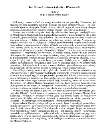 Jan Styczeń – Nowe książki o Warszawie „Stolica” nr 44 z października 1956 r. Miłośnicy „varsavianów” nie mogą uskarżać się na posuchę. Warszawa, jej przeszłość i czas dzisiejszy ciekawi i pociąga nie tylko czytających, ale – co jeszcze ważniejsze – piszących. Każdy miesiąc niemal przynosi jakąś nową niespodziankę, a wśród powodzi druków znaleźć można i prawdziwą rodzynkę. Mamy taką właśnie rodzynkę. Jest nią pełna uroku, dowcipu i erudycji książka Władysława Zambrzyckiego, poprzedzona, zanim w prasie pojawiły się o niej wzmianki, głuchą wieścią między ludem. Ja tam się na tym nie znam – mówiąc słowami autora – i tylko zapisuję, co ludzie na mieście mówią. A mówią, że książka wywodzi się z najlepszej tradycji gawędziarskiej owych dworkowych opowiadaczy z osiemnastego wieku, których tak serdecznie wspominał Mickiewicz; mówią także, że jest to rzadki rodzaj utworu pisanego prozą, który wprost domaga się głośnego czytania. „Pamiętnik Filipka” – tak się nazywa ta piękna książeczka – rozpoczyna się wstępem, w którym autor, robiąc do nas perskie oko, zapewnia z powagą, że to, co przeczytamy dalej, jest znalezionym przez niego pamiętnikiem warszawskiego gawrosza z początku ubiegłego stulecia. I stawiając kropkę nad i, aby zabawa była tym lepsza, dodaje jeszcze: „Wybraliśmy ustępy najważniejsze, powiązane jako tako w logiczną całość. Po gruntownej przeróbce, niektóre słowa i zwroty, a nawet dłuższe opowiadania pozostawiamy bez poprawek, aby zachować próbki ówczesnego języka warszawskiego”. Żartobliwy podstęp autora nie chybił celu. Przed kilku dniami znalazłem się w towarzystwie, w którym znany publicysta warszawski wystąpił z zarzutem pod adresem Zambrzyckiego, iż nie poprzedził pamiętnika Filipka rzeczowym wstępem i informacją o znalezieniu tego wartościowego utworu. Ba, nie pierwsza to i nie ostatnia ofiara tego rodzaju mistyfikacji literackiej, która od czasu Macphersona i jego „Pieśni Osjana” ma długą tradycję. Toć i nasz Jan Potocki swym „Rękopisem znalezionym w Saragossie” wprowadził w błąd wielu współczesnych, prezentując w przedmowie swój utwór jako znalezisko hiszpańskie. Wcale się więc nie zdziwię, gdy ten i ów czytelnik uwierzy w autentyzm „Pamiętnika Filipka”. Bo też autor dziś po trosze zapomnianej świetnej „Naszej Pani Radosnej”, wydanej w dwudziestoleciu (czyż nie byłoby warto jej wznowić?) urzeka nas nie tylko wdziękiem, świeżością pomysłów, prostotą, pogodą, lecz i dobrym – w całym tego słowa znaczeniu – rzemiosłem pisarskim. Opowiadanie Zambrzyckiego oddaje w sposób żywy i, co więcej, prawdziwy, klimat obyczajowy i społeczność warszawską z czasów, kiedy miasto nasze było przez krótki czas stolicą Prus Południowych. Autor czerpał z bogactwa ówczesnych pamiętników, listów i innych źródeł, ale – jak zręczny jubiler – z surowego materiału wytopił istne cacko. I tylko niekiedy możemy odkryć sekrety jego warsztatu, jak w tym na przykład przypadku, gdy mówi, że olej lniany jest szkodliwy i kołtun wywołuje. Aha – myślimy, radzi z odkrycia – toć to z pamiętników Adama Moszczyńskiego. Morał jest prosty: biegnij, czytelniku, do najbliższej ksiegarni, bo książka jest już, jak się zdaje, na wyczerpaniu. Nie pożałujesz tego, niewielkiego zresztą, wydatku (zł 7,70). Ilustrował książkę Antoni Uniechowski z właściwym sobie wdziękiem i wyczuciem stylu.