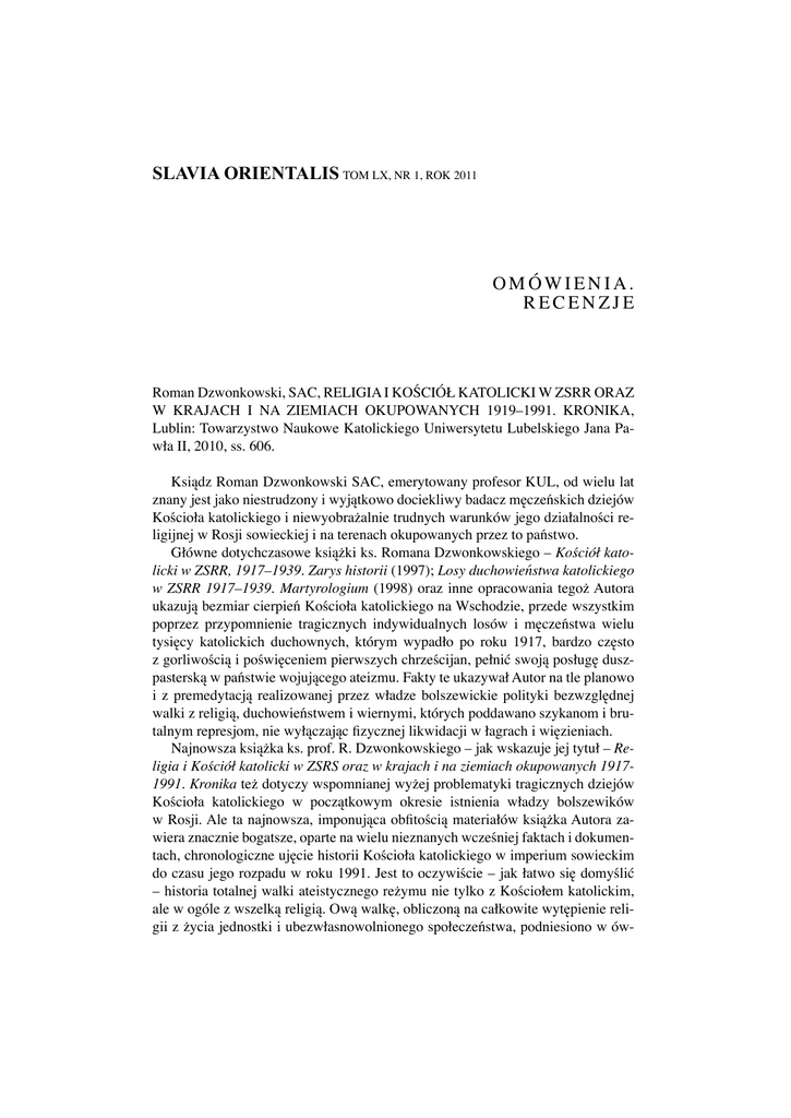 SLAVIA ORIENTALIS TOM LX,НАЗВЫ NR 1, ROK 2011 ДЫЯЛЕКТНЫЯ БЛІНОЎ... 157 OMÓWIENIA. RECENZJE Roman Dzwonkowski, SAC, RELIGIA I KOŚCIÓŁ KATOLICKI W ZSRR ORAZ W KRAJACH I NA ZIEMIACH OKUPOWANYCH 1919–1991. KRONIKA, Lublin: Towarzystwo Naukowe Katolickiego Uniwersytetu Lubelskiego Jana Pawła II, 2010, ss. 606. Ksiądz Roman Dzwonkowski SAC, emerytowany profesor KUL, od wielu lat znany jest jako niestrudzony i wyjątkowo dociekliwy badacz męczeńskich dziejów Kościoła katolickiego i niewyobrażalnie trudnych warunków jego działalności religijnej w Rosji sowieckiej i na terenach okupowanych przez to państwo. Główne dotychczasowe książki ks. Romana Dzwonkowskiego – Kościół katolicki w ZSRR, 1917–1939. Zarys historii (1997); Losy duchowieństwa katolickiego w ZSRR 1917–1939. Martyrologium (1998) oraz inne opracowania tegoż Autora ukazują bezmiar cierpień Kościoła katolickiego na Wschodzie, przede wszystkim poprzez przypomnienie tragicznych indywidualnych losów i męczeństwa wielu tysięcy katolickich duchownych, którym wypadło po roku 1917, bardzo często z gorliwością i poświęceniem pierwszych chrześcijan, pełnić swoją posługę duszpasterską w państwie wojującego ateizmu. Fakty te ukazywał Autor na tle planowo i z premedytacją realizowanej przez władze bolszewickie polityki bezwzględnej walki z religią, duchowieństwem i wiernymi, których poddawano szykanom i brutalnym represjom, nie wyłączając fizycznej likwidacji w łagrach i więzieniach. Najnowsza książka ks. prof. R. Dzwonkowskiego – jak wskazuje jej tytuł – Religia i Kościół katolicki w ZSRS oraz w krajach i na ziemiach okupowanych 19171991. Kronika też dotyczy wspomnianej wyżej problematyki tragicznych dziejów Kościoła katolickiego w początkowym okresie istnienia władzy bolszewików w Rosji. Ale ta najnowsza, imponująca obfitością materiałów książka Autora zawiera znacznie bogatsze, oparte na wielu nieznanych wcześniej faktach i dokumentach, chronologiczne ujęcie historii Kościoła katolickiego w imperium sowieckim do czasu jego rozpadu w roku 1991. Jest to oczywiście – jak łatwo się domyślić – historia totalnej walki ateistycznego reżymu nie tylko z Kościołem katolickim, ale w ogóle z wszelką religią. Ową walkę, obliczoną na całkowite wytępienie religii z życia jednostki i ubezwłasnowolnionego społeczeństwa, podniesiono w ów- 158 OMÓWIENIA. RECENZJE czesnym Związku Sowieckim do rangi politycznej racji stanu i najważniejszego zadania w planach zbudowania nowego społeczeństwa i wychowania człowieka nowej epoki na modłę bolszewicką. We Wprowadzeniu do książki Autor, powołując się m. in. na dyrektywy Lenina, pisze na ten temat: […] Zaplanowane i spontaniczne zbrodnie na wielką skalę istniały zawsze. Historia nie zna jednak zbrodniczej władzy państwowej o takim charakterze i zasięgu, jaki zaistniał w systemie komunistycznym. Po raz pierwszy w dziejach krwawy terror został w ZSRS podniesiony do rangi teoretycznej zasady rządzenia państwem. […] Nic dziwnego, że rozmiary przemocy, barbarzyństwa i okrucieństwa w Rosji sowieckiej nie mają precedensu w historii ludzkości (s. 30). Ks. Roman Dzwonkowski stwierdza również we Wprowadzeniu, że długotrwała i heroiczna obrona swobód religijnych w Związku Sowieckim, okupiona niezliczonymi ofiarami, nie została jeszcze w pełni dostrzeżona i zbadana przez historyków – ani w samej Rosji, ani poza jej granicami. W podnoszeniu tej kwestii i przypominaniu owej zaciekłej walki z religią i Kościołem katolickim w ZSRS Autor widzi zasadniczy cel swoich badań, który tak określa: Niniejsza praca ma na celu służenie tej sprawie. Nie przez rekonstrukcję procesu historycznego, jaki się dokonał w ZSRS w tej dziedzinie, lecz przez ukazanie – w postaci kalendarium – dziejów religii, Kościoła katolickiego, losów należącej do niego ludności polskiej i innych narodowości oraz historii innych Kościołów w tym państwie. Celem tej publikacji jest pogłębienie bardzo ograniczonej dotychczas świadomości społecznej na ten temat (s. 39). Wspomniane tu obszerne Wprowadzenie (s. 7-41) stanowi napisany ze znawstwem przedmiotu szkic historyczny na temat losów religii i Kościoła katolickiego w ZSRS w latach 1917-1991. Szkic ów pozwala prześledzić główne etapy kształtowania się antyreligijnej polityki tego państwa od początków jego istnienia. W wielu pracach na temat historii ZSRS, które wyszły spod pióra autorów rosyjskich, często wyrażany jest pogląd, że okrutny masowy terror zaczął stosować dopiero reżim stalinowski, natomiast Lenin rzekomo budował praworządne państwo rewolucyjne. Z dokumentów zebranych i przytaczanych przez ks. Romana Dzwonkowskiego wynika jednak niezbicie, że główny organizator i przywódca przewrotu październikowego w Rosji od samego początku zalecał stosowanie brutalnej przemocy i terroru wobec przeciwników władzy bolszewickiej, do których zaliczono nie tylko carskich urzędników, korpus oficerski, burżuazję, bogatych ziemian i chłopów, ale również duchowieństwo prawosławne i katolickie. Wśród pierwszych ofiar rozpasanych zrewoltowanych tłumów było nie tylko wielu duchownych, ale też ograbione i zbezczeszczone kościoły, cerkwie i klasztory. OMÓWIENIA. RECENZJE 159 Najwięcej uwagi we Wprowadzeniu poświęca prof. R. Dzwonkowski okresowi 1917-1939. Wynika to z faktu, iż w owych latach dokonano w ZSRS najwięcej i najbardziej okrutnych zbrodni przeciw wierzącym i szczególnie przeciw Kościołowi katolickiemu i ludności polskiej, którą prześladowano z wyjątkową zajadłością. Oto niektóre ustalenia Autora dotyczące wspomnianej kwestii: […] Ogólna liczba strat społeczności polskiej w ZSRS do 1940 r. oceniana jest na 30% stanu z końca lat 20. Według danych „Memoriału” odsetek represjonowanych Polaków przekracza wielokrotnie odsetek repre