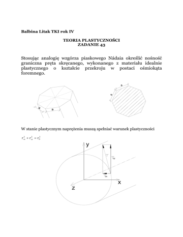 Balbina Litak TKI rok IV TEORIA PLASTYCZNOŚCI ZADANIE 43 Stosując analogię wzgórza piaskowego Nádaia określić nośność graniczna pręta skręcanego, wykonanego z materiału idealnie plastycznego o kształcie przekroju w postaci ośmiokąta foremnego. a a a a W stanie plastycznym naprężenia muszą spełniać warunek plastyczności τ zx2 + τ zy2 = τ 02 y zy zx x z gdzie τ 0 oznacza granicę plastyczności przy ścinaniu i wynosi: σ0 τ 0TG = według kryterium Tresci-Guesta 2 τ 0HMH = σ0 3 według kryterium Hubera-Misesa- Hencky'ego Wprowadzając funkcję Prandtla Ø: τ zx = − ∂φ ∂φ τ zy = ∂y ∂x do warunku plastyczności otrzymujemy: 2 ∂φ ∂φ + = τ 02 ∂y ∂x 2 lub: gradφ = τ 0 Równanie to posiada analogiczną postać jak równanie wzgórza idealnie sypkiego piasku, zbudowanego na płaskiej figurze o kształcie przekroju poprzecznego pręta: 2 ∂w ∂w − + = tgµ ∂x ∂y 2 lub: grad ( w) = tgµ gdzie µ oznacza kąt zsypu (tarcia wewnętrznego). Z analogii równań oraz zgodności warunków brzegowych wynika: φ =τ0 w tgµ Moment skręcający wynosi natomiast M s = 2∫∫ φdA =2 A τ0 tgµ 2τ 0 ∫∫ wdA = tgµ V A gdzie V oznacza objętość wzgórza piasku o stałym kącie zsypu µ PRĘT O PRZEKROJU WIELOKĄTA FOREMNEGO O N BOKACH H h a α = 0.5 π − 2π n α= π 2 − π n tg (α ) = tg ( h = tg (α ) 0.5a π h = 0.5a ⋅ ctg n H = tgµ h π H = 0.5a ⋅ ctg ⋅ tgµ n π 2 − π π ) = ctg n n Pole powierzchni podstawy ostrosłupa: 1 P = n⋅ ⋅a⋅h 2 1 π n π P = n ⋅ ⋅ a ⋅ 0.5a ⋅ ctg = ⋅ a 2 ⋅ ctg 2 n 4 n Objętość ostrosłupa: V = 1 PH 3 V= 1 n 2 n 3 2π π π ⋅ ⋅ a ⋅ ctg ⋅ 0.5a ⋅ ctg ⋅ tgµ = a ctg ⋅ tgµ 3 4 24 n n n Podstawiając do wzoru na graniczny moment skręcający: Ms = 2τ 0 n 3 2 π ⋅ a ctg ⋅ tgµ tgµ 24 n Ms = n π ⋅ τ 0 ⋅ a 3 ctg 2 12 n Dla n=8 otrzymujemy: Ms = 8 π ⋅ τ 0 ⋅ a 3 ctg 2 12 8 M s = 3.89 ⋅ τ 0 ⋅ a 3