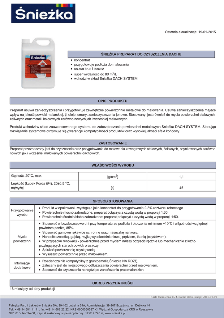 Ostatnia aktualizacja: 19-01-2015 ŚNIEŻKA_PREPARAT_DO_CZYSZCZENIA_DACHU ŚNIEŻKA PREPARAT DO CZYSZCZENIA DACHU koncentrat przygotowuje podłoża do malowania usuwa brud i tłuszcz super wydajność do 80 m2/L wchodzi w skład Śnieżka DACH SYSTEM OPIS PRODUKTU Preparat usuwa zanieczyszczenia i przygotowuje zewnętrzne powierzchnie metalowe do malowania. Usuwa zanieczyszczenia mające wpływ na jakość powłoki malarskiej, tj. oleje, smary, zanieczyszczenia jonowe. Stosowany jest również do mycia powierzchni stalowych, żeliwnych oraz metali kolorowych zarówno nowych jak i wcześniej malowanych. Produkt wchodzi w skład zaawansowanego systemu do zabezpieczania powierzchni metalowych Śnieżka DACH SYSTEM. Stosując rozwiązanie systemowe otrzymuje się gwarancje kompatybilności produktów oraz wysokiej jakości efekt końcowy. ZASTOSOWANIE Preparat przeznaczony jest do czyszczenia oraz przygotowania do malowania zewnętrznych stalowych, żeliwnych, ocynkowanych zarówno nowych jak i wcześniej malowanych powierzchni dachowych. WŁAŚCIWOŚCI WYROBU Gęstość, 20°C, max. Lepkość (kubek Forda Ø4), 20±0,5 °C, najwyżej [g/cm3] 1,1 [s] 45 SPOSÓB STOSOWANIA Przygotowanie wyrobu Mycie powierzchni Informacje dodatkowe Produkt w opakowaniu występuje jako koncentrat do przygotowania 23% roztworu roboczego. Powierzchnie mocno zabrudzone: preparat połączyć z czystą wodą w proporcji 1:30. Powierzchnie średnio/słabo zabrudzone: preparat połączyć z czystą wodą w proporcji 1:50. Stosować w bezdeszczowe dni przy temperaturze podłoża i otoczenia minimum +10°C i wilgotności względnej powietrza poniżej 85%. Stosować gumowe rękawice ochronne oraz maseczkę na twarz. Nanosić szczotką, gąbką, myjką wysokociśnieniową, pędzlem, tkanią (czyściwem). W przypadku renowacji powierzchnie przed myciem należy oczyścić ręcznie lub mechanicznie z luźno przylegających starych powłok oraz rdzy. Spłukać powierzchnię czystą wodą. Wysuszyć powierzchnię przed malowaniem. Rozcieńczalnik kompatybilny z gruntoemalią Śnieżka NA RDZĘ. Zalecany jest do miejscowego odtłuszczania powierzchni przed malowaniem. Stosować do czyszczenia narzędzi po zakończeniu prac malarskich. OKRES PRZYDATNOŚCI 18 miesięcy od daty produkcji Karta techniczna 1/2 Ostatnia aktualizacja: 2015-01-19 Fabryka Farb i Lakierów Śnieżka SA, 39102 Lubzina 34A, Administracja: 39207 Brzeźnica, ul. Dębicka 44 Tel. + 48 14 681 11 11, fax +48 14 682 22 22, KRS 0000060537 XII Wydział Gospodarczy KRS w Rzeszowie NIP: 8181433438, Kapitał zakładowy w pełni opłacony: 12 617 778 zł, www.sniezka.pl OPAKOWANIA 1L, 5L WYDAJNOŚĆ ŚNIEŻKA_PREPARAT_DO_CZYSZCZENIA_DACHU od 40 do 80 m² (po przygotowaniu preparatu) w zależności od stopnia zabrudzenia powierzchni czyszczonej KOLORYSTYKA bezbarwny LZO brak NORMY I ATESTY ZN-SN-054:2011 WSKAZÓWKI BHP I PPOŻ Znak GHS 05 NAPIS: NIEBEZPIECZEŃSTWO Zawiera alkohol etoksylowany (C9-C11). Powoduje poważne uszkodzenie oczu. Zawiera mieszaninę 5chloro2metylo4izotiazol3onu [WE 2475007] i 2metylo2H izotiazol3onu [WE. 2202396] (3:1). Może powodować wystąpienie reakcji alergicznej. W razie konieczności zasięgnięcia porady lekarza należy pokazać pojemnik lub etykietę. Chronić przed dziećmi. Przed użyciem przeczytać etykietę. Stosować rękawice ochronne/odzież ochronną/ochronę oczu/ochronę twarzy. W PRZYPADKU DOSTANIA SIĘ DO OCZU: Ostrożnie płukać wodą przez kilka minut. Wyjąć soczewki kontaktowe, jeżeli są i można je łatwo usunąć. Nadal płukać. Natychmiast skontaktować się z OŚRODKIEM ZATRUĆ lub lekarzem. Zawartość/pojemnik usuwać zgodnie z obowiązującymi przepisami. PRZECHOWYWANIE: Przechowywać w szczelnie zamkniętych opakowaniach w temperaturze od +5°C do +25°C. Chronić przed mrozem i nasłonecznieniem. UWAGA! Informacje zawarte w karcie technicznej mają na celu zapewnienie optymalnego wykorzystania produktu, jednak nie są podstawą do odpowiedzialności prawnej Producenta, gdyż warunki wykonawstwa pozostają poza jego kontrolą. Wszelka ingerencja w skład produktu jest niedopuszczalna i może w znaczny sposób obniżyć jakość stosowanego materiału. W przypadku połączenia z wyrobami innych Producentów nie ponosimy żadnej odpowiedzialności. Przedstawione powyżej informacje podane zostały w dobrej wierze, według aktualnego stanu wiedzy i doświadczenia praktycznego. Producent zastrzega sobie prawo do zmiany treści w kolejnych edycjach bez wcześniejszego informowania o tym fakcie odbiorców. Karta techniczna 2/2 Ostatnia aktualizacja: 2015-01-19 Fabryka Farb i Lakierów Śnieżka SA, 39102 Lubzina 34A, Administracja: 39207 Brzeźnica, ul. Dębicka 44 Tel. + 48 14 681 11 11, fax +48 14 682 22 22, KRS 0000060537 XII Wydział Gospodarczy KRS w Rzeszowie NIP: 8181433438, Kapitał zakładowy w pełni opłacony: 12 617 778 zł, www.sniezka.pl