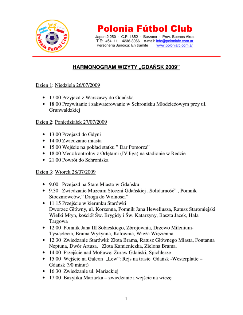 Polonia Fútbol Club Japon 2.250 - C.P. 1852 - Burzaco - Prov. Buenos Aires T.E: +54 11 4238-3066 e-mail: [email protected] Personería Jurídica: En trámite www.poloniafc.com.ar HARMONOGRAM WIZYTY „GDAŃSK 2009” Dzien 1: Niedziela 26/07/2009 • 17.00 Przyjazd z Warszawy do Gdańska • 18.00 Przywitanie i zakwaterowanie w Schronisku Młodzieżowym przy ul. Grunwaldzkiej Dzien 2: Poniedziałek 27/07/2009 • • • • • 13.00 Przejazd do Gdyni 14.00 Zwiedzanie miasta 15.00 Wejście na pokład statku ” Dar Pomorza” 18.00 Mecz kontrolny z Orlętami (IV liga) na stadionie w Redzie 21.00 Powrót do Schroniska Dzien 3: Wtorek 28/07/2009 • 9.00 Przejazd na Stare Miasto w Gdańsku • 9.30 Zwiedzanie Muzeum Stoczni Gdańskiej „Solidarność” , Pomnik Stoczniowców,” Droga do Wolności” • 11.15 Przejście w kierunku Starówki Dworzec Główny, ul. Korzenna, Pomnik Jana Heweliusza, Ratusz Staromiejski Wielki Młyn, kościół Św. Brygidy i Św. Katarzyny, Baszta Jacek, Hala Targowa • 12.00 Pomnik Jana III Sobieskiego, Zbrojownia, Drzewo MileniumTysiąclecia, Brama Wyżynna, Katownia, Wieża Więzienna • 12.30 Zwiedzanie Starówki: Złota Brama, Ratusz Głównego Miasta, Fontanna Neptuna, Dwór Artusa, Złota Kamieniczka, Zielona Brama. • 14.00 Przejście nad Motławę: Żuraw Gdański, Spichlerze • 15.00 Wejście na Galeon „Lew”: Rejs na trasie Gdańsk -Westerplatte – Gdańsk (90 minut) • 16.30 Zwiedzanie ul. Mariackiej • 17.00 Bazylika Mariacka – zwiedzanie i wejście na wieżę 1 • 18.30 Jarmark Dominikański • 20.30 Powrót do Schroniska Dzien 4: Środa 29/07/2009 • • • • • • • 9.00 11.00 14.00 15.30 18.30 19.00 22.00 Przejazd do Gdańska na stadion MOSiR przy ul. Traugutta Mecz kontrolny z drużyną Lechii Gdańsk (Młoda Ekstraklasa) Powrót do Schroniska Zwiedzanie Oliwy: Katedra Oliwska, Park Oliwski, Góra Pachołek Przejazd kolejką SKM do Sopotu Zwiedzanie Sopotu: Monte Cassino, Krzywy Dom, Molo Powrót do Schroniska Dzien 5: Czwartek 30/07/2009 • Dzień Wolny, Zakupy, Plaża w Jelitkowie • 19.00 Wieczór pożegnalny – przemówienia prezydenta Miasta Gdańska, prezesa Wspólnoty Polskiej, prezesa KS „Olivia” oraz uroczyste wręczenie nagród oraz upominków Dzien 6 Piątek 31/07/2009 • 10.00 Wykwaterowanie • 12.00 Wyjazd do Torunia (na Igrzyska Polonijne). 2