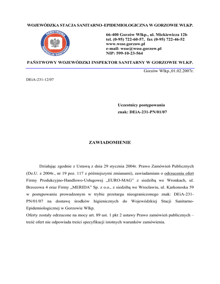 WOJEWÓDZKA STACJA SANITARNO–EPIDEMIOLOGICZNA W GORZOWIE WLKP. 66-400 Gorzów Wlkp., ul. Mickiewicza 12b tel. (0-95) 722-60-57, fax (0-95) 722-46-52 www.wsse.gorzow.pl e-mail: [email protected] NIP: 599-10-23-564 PAŃSTWOWY WOJEWÓDZKI INSPEKTOR SANITARNY W GORZOWIE WLKP. Gorzów Wlkp.,01.02.2007r. DEiA-231-12/07 Uczestnicy postępowania znak: DEiA-231-PN/01/07 ZAWIADOMIENIE Działając zgodnie z Ustawą z dnia 29 stycznia 2004r. Prawo Zamówień Publicznych (Dz.U. z 2004r., nr 19 poz. 117 z późniejszymi zmianami), zawiadamiam o odrzuceniu ofert Firmy Produkcyjno-Handlowo-Usługowej „EURO-MAG” z siedzibą we Wronkach, ul. Brzozowa 4 oraz Firmy „MERIDA” Sp. z o.o., z siedzibą we Wrocławiu, ul. Karkonoska 59 w postępowaniu prowadzonym w trybie przetargu nieograniczonego znak: DEiA-231PN/01/07 na dostawę środków higienicznych do Wojewódzkiej Stacji SanitarnoEpidemiologicznej w Gorzowie Wlkp. Oferty zostały odrzucone na mocy art. 89 ust. 1 pkt 2 ustawy Prawo zamówień publicznych – treść ofert nie odpowiada treści specyfikacji istotnych warunków zamówienia. Uzasadnienie: 1. W dniu 18.01.2007r. Firma Produkcyjno-Handlowo-Usługowa „EURO-MAG” złożyła ofertę na dostarczenie środków higienicznych dla Wojewódzkiej Stacji Sanitarno-Epidemiologicznej w Gorzowie Wlkp. Jednym z wymagań specyfikacji istotnych warunków zamówienia (pkt. 12g) było dostarczenie kart charakterystyki substancji niebezpiecznych, preparatów niebezpiecznych, produktów biobójczych lub substancji czynnych wchodzących w skład produktu biobójczego. Oferent nie dostarczył żadnych kart charakterystyki, co uniemożliwiło ocenę załączonych próbek preparatów. 2. W dniu 18.01.2007r. Firmy „MERIDA” Sp. z o.o. złożyła ofertę na dostarczenie środków higienicznych dla Wojewódzkiej Stacji Sanitarno-Epidemiologicznej w Gorzowie Wlkp. Oferent złożył niekompletne karty charakterystyki produktów, które były wymagane w pkt. 12g specyfikacji istotnych warunków zamówienia, bądź nie dołączył ich w ogóle, co uniemożliwiło ocenę załączonych próbek preparatów: a) uniwersalny płyn do czyszczenia – przedłożona karta charakterystyki produktu jest nie kompletna - brak treści pkt. 3, niepełny pkt. 13 b) płyn do mycia WC – brak karty charakterystyki produktu, brak składu przedmiotowego preparatu na załączonym świadectwie dopuszczenia do obrotu c) wymienny wkład zapachowy - przedłożona karta charakterystyki produktu wymaga uaktualnienia d) proszek do prania - brak pkt. 3-5 i 10-16 w karcie charakterystyki produktu e) płyn do mycia naczyń – karta charakterystyki produktu nie spełnia wymogów prawa f) mydło w płynie – brak składu chemicznego na przedłożonym świadectwie dopuszczenia do obrotu g) mleczko do czyszczenia - brak składu chemicznego na przedłożonym świadectwie dopuszczenia do obrotu h) żel do WC - brak składu chemicznego na przedłożonym świadectwie dopuszczenia do obrotu W związku z powyższym Zamawiający odrzuca oferty i unieważnia postępowanie prowadzone w trybie przetargu nieograniczonego znak przetargu nieograniczonego znak: DEiA-231-PN/01/07 na dostawę środków higienicznych do Wojewódzkiej Stacji SanitarnoEpidemiologicznej w Gorzowie Wlkp. 01.02.2007r. p.o. Z-cy Dyrektora ds. Ek.-Admin. Główny Księgowy mgr Łucja Rybska