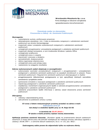 Wrocławskie Mieszkania Sp. z o.o. Firma działająca w obszarze zarządzania i gospodarowania nieruchomościami Poszukuje osoby na stanowisko Pracownika w Sekcji ds. Zamówień Publicznych Wymagania: wykształcenie wyższe, preferowane prawnicze doświadczenie zawodowe: min. 2 lata na stanowisku związanym z udzieleniem zamówień publicznych po stronie Zamawiającego znajomość ustaw i przepisów wykonawczych związanych z udzielaniem zamówień publicznych umiejętność przygotowania i prowadzenia postępowań o udzielenie zamówień publicznych znajomość obsługi komputera, w tym środowiska Windows i pakietu Office umiejętności analityczne umiejętność pracy w zespole staranność i precyzja w działaniu samodzielność, dyspozycyjność dobra organizacja własnej pracy umiejętność pracy pod presją czasu nastawienie na osiąganie rezultatów Zakres wykonywanych zadań obejmuje w szczególności: wykonywanie czynności proceduralnych związanych z przygotowaniem i prowadzeniem postępowań o udzielenie zamówień publicznych na zasadach określonych w ustawie Prawo zamówień publicznych i Regulaminie zamówień publicznych obowiązującym w Spółce przygotowywanie dokumentacji postępowania w tym specyfikacji istotnych warunków zamówienia i projektów umów opiniowanie wniosków o wszczęcie postępowań o udzielenie zamówień publicznych rejestrację postępowań o udzielenie zamówień publicznych współpracę z komórkami organizacyjnymi Spółki w zakresie przygotowywania i prowadzenia postępowań o udzielenie zamówień publicznych udzielanie pracownikom Spółki informacji z zakresu zasad stosowania prawa zamówień publicznych Oferujemy: ciekawą i odpowiedzialną pracę zatrudnienie na podstawie umowy o pracę CV wraz z listem motywacyjnym prosimy przesłać na adres e-mail: [email protected] lub złożyć w siedzibie Spółki przy ul. M. Reja 53-55 w terminie do 25.07.2016 r. W tytule e-maila prosimy wpisać nazwę stanowiska. Aplikacja powinna zawierać klauzulę: „Wyrażam zgodę na przetwarzanie danych osobowych zawartych w mojej ofercie pracy dla potrzeb niezbędnych do realizacji procesu rekrutacji (zgodnie z ustawą z 28.08.1997 r. o ochronie danych osobowych, Dz.U. nr 133, poz. 883)”. Zastrzegamy sobie prawo do odpowiedzi tylko na wybrane oferty.