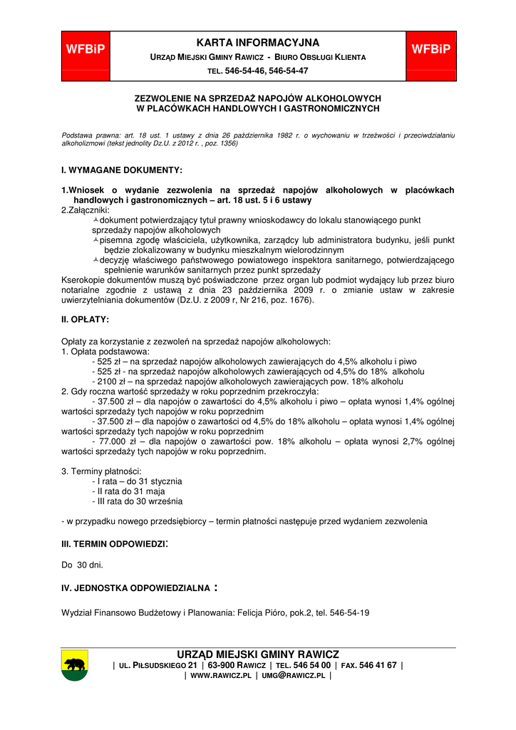 WFBiP KARTA INFORMACYJNA URZĄD MIEJSKI GMINY RAWICZ - BIURO OBSŁUGI KLIENTA WFBiP TEL. 546-54-46, 546-54-47 ZEZWOLENIE NA SPRZEDAŻ NAPOJÓW ALKOHOLOWYCH W PLACÓWKACH HANDLOWYCH I GASTRONOMICZNYCH Podstawa prawna: art. 18 ust. 1 ustawy z dnia 26 października 1982 r. o wychowaniu w trzeźwości i przeciwdziałaniu alkoholizmowi (tekst jednolity Dz.U. z 2012 r. , poz. 1356) I. WYMAGANE DOKUMENTY: 1.Wniosek o wydanie zezwolenia na sprzedaż napojów alkoholowych w placówkach handlowych i gastronomicznych – art. 18 ust. 5 i 6 ustawy 2.Załączniki: dokument potwierdzający tytuł prawny wnioskodawcy do lokalu stanowiącego punkt sprzedaży napojów alkoholowych pisemna zgodę właściciela, użytkownika, zarządcy lub administratora budynku, jeśli punkt będzie zlokalizowany w budynku mieszkalnym wielorodzinnym decyzję właściwego państwowego powiatowego inspektora sanitarnego, potwierdzającego spełnienie warunków sanitarnych przez punkt sprzedaży Kserokopie dokumentów muszą być poświadczone przez organ lub podmiot wydający lub przez biuro notarialne zgodnie z ustawą z dnia 23 października 2009 r. o zmianie ustaw w zakresie uwierzytelniania dokumentów (Dz.U. z 2009 r, Nr 216, poz. 1676). II. OPŁATY: Opłaty za korzystanie z zezwoleń na sprzedaż napojów alkoholowych: 1. Opłata podstawowa: - 525 zł – na sprzedaż napojów alkoholowych zawierających do 4,5% alkoholu i piwo - 525 zł - na sprzedaż napojów alkoholowych zawierających od 4,5% do 18% alkoholu - 2100 zł – na sprzedaż napojów alkoholowych zawierających pow. 18% alkoholu 2. Gdy roczna wartość sprzedaży w roku poprzednim przekroczyła: - 37.500 zł – dla napojów o zawartości do 4,5% alkoholu i piwo – opłata wynosi 1,4% ogólnej wartości sprzedaży tych napojów w roku poprzednim - 37.500 zł – dla napojów o zawartości od 4,5% do 18% alkoholu – opłata wynosi 1,4% ogólnej wartości sprzedaży tych napojów w roku poprzednim - 77.000 zł – dla napojów o zawartości pow. 18% alkoholu – opłata wynosi 2,7% ogólnej wartości sprzedaży tych napojów w roku poprzednim. 3. Terminy płatności: - I rata – do 31 stycznia - II rata do 31 maja - III rata do 30 września - w przypadku nowego przedsiębiorcy – termin płatności następuje przed wydaniem zezwolenia III. TERMIN ODPOWIEDZI: Do 30 dni. IV. JEDNOSTKA ODPOWIEDZIALNA : Wydział Finansowo Budżetowy i Planowania: Felicja Pióro, pok.2, tel. 546-54-19 URZĄD MIEJSKI GMINY RAWICZ | UL. PIŁSUDSKIEGO 21 | 63-900 RAWICZ | TEL. 546 54 00 | FAX. 546 41 67 | | WWW.RAWICZ.PL | [email protected] | WFBiP KARTA INFORMACYJNA URZĄD MIEJSKI GMINY RAWICZ - BIURO OBSŁUGI KLIENTA WFBiP TEL. 546-54-46, 546-54-47 V. TRYB ODWOŁAWCZY: Odwołanie od decyzji Burmistrza Gminy wnosi się do Samorządowego Kolegium Odwoławczego w Lesznie za pośrednictwem organu, który wydał decyzję (odwołanie składa się w Sekretariacie Urzędu). Odwołanie wnosi się w terminie 14 dni od dnia doręczenia decyzji stronie. VI. UWAGI: Odbiór zezwolenia osobiście lub przez pełnomocnika za okazaniem dowodu osobistego. W przypadku braku kompletu wymaganych dokumentów wnioskodawca zostanie wezwany do ich uzupełnienia. Lokalizacja punktu sprzedaży napojów alkoholowych opiniuje Gminna Komisja Rozwiązywania Problemów Alkoholowych. Oświadczenie o wartości sprzedaży napojów alkoholowych w roku poprzednim składa się odrębnie dla każdego rodzaju alkoholu – wg. posiadanych zezwoleń. W przypadku nie dokonania wpłaty w określonym terminie lub nie złożenia oświadczenia o wartości sprzedaży w roku ubiegłym zgodnie z art. 18 ust.12 pkt. 5 – następuje wygaszenie zezwolenia. Przedsiębiorca, któremu zezwolenie wygasło z w/w przyczyn może wystąpić z wnioskiem o wydanie nowego zezwolenia nie wcześniej niż po upływie 6-ciu miesięcy od wydania decyzji o wygaśnięciu. URZĄD MIEJSKI GMINY RAWICZ | UL. PIŁSUDSKIEGO 21 | 63-900 RAWICZ | TEL. 546 54 00 | FAX. 546 41 67 | | WWW.RAWICZ.PL | [email protected] |
