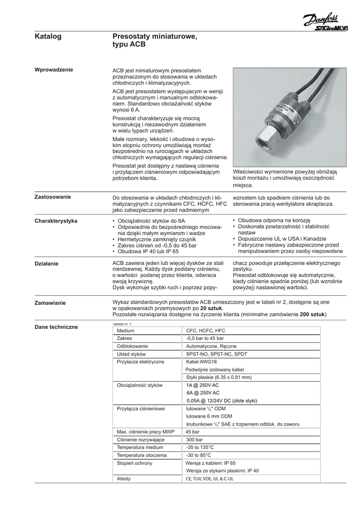 Katalog Presostaty miniaturowe, typu ACB Wprowadzenie ACB jest miniaturowym presostatem przeznaczonym do stosowania w układach chłodniczych i klimatyzacyjnych. ACB jest presostatem występujacym w wersji z automatycznym i manualnym odblokowaniem. Standardowo obciażalność styków wynosi 6 A. Presostat charakteryzuje się mocną konstrukcją i niezawodnym działaniem w wielu typach urządzeń. Małe rozmiary, lekkość i obudowa o wysokim stopniu ochrony umożliwiają montaż bezpośrednio na rurociągach w układach chłodniczych wymagających regulacji ciśnienia. Presostat jest dostępny z nastawą ciśnienia i przyłączem ciśnieniowym odpowiadającym potrzebom klienta. Właściwości wymienione powyżej obniżają koszt montażu i umożliwiają oszczędność miejsca. Zastosowanie Do stosowania w układach chłodniczych i klimatyzacyjnych z czynnikami CFC, HCFC, HFC jako zabezpieczenie przed nadmiernym wzrostem lub spadkiem ciśnienia lub do sterowania pracą wentylatora skraplacza. Charakterystyka • Obciążalność styków do 6A • Odpowiednie do bezpośredniego mocowania dzięki małym wymiarom i wadze • Hermetycznie zamknięty czujnik • Zakres ciśnień od -0,5 do 45 bar • Obudowa IP 40 lub IP 65 • Obudowa odporna na korozję • Doskonała powtarzalność i stabilność nastaw • Dopuszczenie UL w USA i Kanadzie • Fabryczne nastawy zabezpieczone przed manipulowaniem przez osoby niepowołane Działanie ACB zawiera jeden lub więcej dysków ze stali nierdzewnej. Każdy dysk poddany ciśnieniu, o wartości podanej przez klienta, odwraca swoją krzywiznę. Dysk wykonuje szybki ruch i poprzez popy- chacz powoduje przełączenie elektrycznego zestyku. Presostat odblokowuje się automatycznie, kiedy ciśnienie spadnie poniżej (lub wzrośnie powyżej) nastawionej wartości. Zamawianie Wykaz standardowych presostatów ACB umieszczony jest w tabeli nr 2, dostępne są one w opakowaniach przemysowych po 20 sztuk. Pozostałe rozwiązania dostępne na życzenie klienta (minimalne zamówienie 200 sztuk) Dane techniczne Tabela nr. 1 Medium CFC, HCFC, HFC Zakres -0,5 bar to 45 bar Odblokowanie Automatyczne, Ręczne Układ styków SPST-NO, SPST-NC, SPDT Przyłacze elektryczne Kabel AWG18 Podwójnie izolowany kabel Styki płaskie (6.35 x 0.81 mm) Obciążalność styków 1A @ 250V AC 6A @ 250V AC 0,05A @ 12/24V DC (złote styki) Przyłącza ciśnieniowe lutowane 1/4" ODM lutowane 6 mm ODM śrubunkowe 1/4" SAE z trzpieniem odblok. do zaworu Max. ciśnienie pracy MWP 45 bar Ciśnienie rozrywające 300 bar Temperatura medium -35 to 135°C Temperatura otoczenia -30 to 85°C Stopień ochrony Wersja z kablem: IP 65 Atesty CE, TUV, VDE, UL & C-UL Wersja ze stykami płaskimi: IP 40 Presostaty miniaturowe, typu ACB Zamawianie standardowych presostatów ACB Tabela nr. 2 Ciśnienie Odblokowanie Układ styków Przyłącze Numer kodowy Typ Opis 061F7504 ACB-2UB504W ACB HP aut.6mm lut. 061F7505 ACB-2UB505W ACB HP aut.1/4” lut. x 061F7506 ACB-2UB506W ACB HP aut.1/4”śrub. SPDT x 061F9057 ACB-2UC59W ACB HP aut.SPDT 1/4”śrub. SPST-NC x 061F8494 ACB2UB465W ACB HP aut.SPST 1/4”śrub. x 061F9056 ACB-2UC58W ACB HP aut.SPDT 1/4”śrub. x 061F9243 ACB-PC62M ACB HP ręcz. SPDT 1/4”śrub. 061F7507 ACB-2UB507W ACB HP aut.SPST 6mm lut. 061F7508 ACB-2UB508W ACB HP aut.SPST 1/4” lut. 061F7509 ACB-2UB509W ACB HP aut.SPST 1/4”śrub. 061F9703 ACB-2UB803MW ACB HP ręcz. SPST 6mm lut. 061F9714 ACB-2UB814MW ACB HP ręcz. SPST 1/4” lut. lutowane rozłączenia załączenia bar bar automatyczne 18 ± 0.7 13 ± 1.2 SPST-NC automatyczne 18 ± 0.7 13 ± 1.2 SPST-NC automatyczne 18 ± 0.7 13 ± 1.2 SPST-NC automatyczne 18 ± 0.7 13 ± 1.2 automatyczne 23 ± 0.7 19 ± 1.2 automatyczne 23 ± 0.7 19 ± 1.2 SPDT SPST SPDT 6mm 1/4” 7/16-20 UNF śrubunkowe z trzpieniem 2) x x ręczne 23 ± 0.7 19 ± 1.2 SPDT automatyczne 26 ± 1 20 ± 1.5 SPST-NC automatyczne 26 ± 1 20 ± 1.5 SPST-NC automatyczne 26 ± 1 20 ± 1.5 SPST-NC ręczne 26 ± 1 20 ± 2 SPST-NC ręczne 26 ± 1 20 ± 2 SPST-NC ręczne 26 ± 1 20 ± 2 SPST-NC x 061F9713 ACB-2UB813MW ACB HP ręcz.SPST 1/4”śrub. DXWRPDW 26 ± 1 20 ± 1.5 SPDT x 061F9055 ACB-2UC57W ACB HP aut.SPDT 1/4”śrub. automatyczne 28 ± 1 21 ± 1.5 SPST-NC 061F7510 ACB-2UB510W ACB HP aut.SPST 6mm lut. automatyczne 28 ± 1 21 ± 1.5 SPST-NC 061F7513 ACB-2UB513W ACB HP aut.SPST 1/4” lut. automatyczne 28 ± 1 21 ± 1.5 SPST-NC x 061F7514 ACB-2UB514W ACB HP aut.SPST 1/4”śrub. ACB HP ręcz. SPDT1/4”śrub. x x x x x x x ręczne 28 ± 1 21 ± 1.5 SPST-NC x 061F9522 ACB-2UB327MW automatyczne 28 ± 1 21 ± 1.5 SPDT x 061F9054 ACB-2UC56W ACB HP aut.SPDT 1/4”śrub. ręczne 28 ± 1 21 ± 1.5 SPDT x 061F9242 ACB-PC61M ACB HP ręcz. SPDT 1/4”śrub. automatyczne 31 ± 1 24 ± 1.5 SPST-NC 061F8493 ACB-2UB464W ACB HP ręcz. SPST 6mm lut. automatyczne 31 ± 1 24 ± 1.5 SPST-NC x 061F8492 ACB-2UB463W ACB HP aut.SPST 1/4”śrub. automatyczne 31 ± 1 24 ± 1.5 SPDT x 061F9053 ACB-2UC55W ACB HP aut.SPDT 1/4”śrub. automatyczne 42 ± 1.2 33 ± 2 SPST-NC 061F7515 ACB-2UB515W ACB HP ręcz. SPST 6mm lut. automatyczne 42 ± 1.2 33 ± 2 SPST-NC 061F7516 ACB-2UB516W ACB HP aut.SPST 1/4” lut. automatyczne 42 ± 1.2 33 ± 2 SPST-NC x 061F7517 ACB-2UB517W ACB HP aut.SPST 1/4”śrub. x x x ręczne 42 ± 1.2 33 ± 2 SPST-NC x 061F9575 ACB-2UB461MW ACB HP ręcz. SPST 1/4”śrub. automatyczne 42 ± 1.2 33 ± 2 SPDT x 061F9052 ACB-2UC54W ACB HP aut.SPDT 1/4”śrub. automatyczne 0.5 ± 0.4 1.5 ± 0.3 SPST-NO 061F7518 ACB-2UA518W ACB LP aut.SPST 6mm lut. automatyczne 0.5 ± 0.4 1.5 ± 0.3 SPST-NO 061F7519 ACB-2UA519W ACB LP aut.SPST 1/4” lut. automatyczne 0.5 ± 0.4 1.5 ± 0.3 SPST-NO 061F7520 ACB-2UA520W ACB LP aut.SPST 1/4”śrub. automatyczne 0.7 ± 0.5 1.7 ± 0.4 SPST-NO 061F7521 ACB-2UA521W ACB LP aut.SPST 6mm lut. automatyczne 0.7 ± 0.5 1.7 ± 0.4 SPST-NO 061F7522 ACB-2UA522W ACB LP aut.SPST 1/4” lut. automatyczne 0.7 ± 0.5 1.7 ± 0.4 SPST-NO x 061F7523 ACB-2UA523W ACB LP aut.S