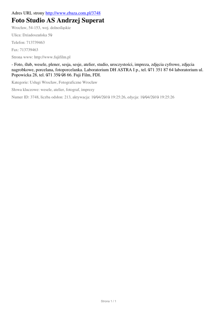 Adres URL strony http://www.ebaza.com.pl/3748 Foto Studio AS Andrzej Superat Wrocław, 54-153, woj. dolnośląskie Ulica: Dziadoszańska 50 Telefon: 713739463 Fax: 713739463 Strona www: http://www.fujifilm.pl - Foto, ślub, wesele, plener, sesja, sesje, atelier, studio, uroczystości, impreza, zdjęcia cyfrowe, zdjęcia nagrobkowe, porcelana, fotoporcelanka. Laboratorium DH ASTRA I p., tel. 071 351 87 64 laboratorium ul. Popowicka 28, tel. 071 350 08 66. Fuji Film, FDI. Kategorie: Usługi Wrocław, Fotograficzne Wrocław Słowa kluczowe: wesele, atelier, fotograf, imprezy Numer ID: 3748, liczba odsłon: 213, aktywacja: 10/04/2010 19:25:26, edycja: 10/04/2010 19:25:26 Strona 1 / 1