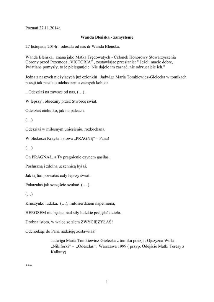 Poznań 27.11.2014r. Wanda Błeńska - zamyślenie 27 listopada 2014r. odeszła od nas dr Wanda Błeńska. Wanda Błeńska, znana jako Matka Trędowatych - Członek Honorowy Stowarzyszenia Obrony przed Przemocą „VICTORIA” , zostawiając przesłanie: " Jeżeli macie dobre, światlane pomysły, to je pielęgnujcie. Nie dajcie im zasnąć, nie odrzucajcie ich." Jedna z naszych nieżyjących już członkiń Jadwiga Maria Tomkiewicz-Gielecka w tomikach poezji tak pisała o odchodzeniu zacnych kobiet: „ Odeszłaś na zawsze od nas, (…) . W lepszy , obiecany przez Stwórcę świat. Odeszłaś cichutko, jak na palcach. (…) Odeszłaś w miłosnym uniesieniu, rozkochana. W bliskości Krzyża i słowa „PRAGNĘ” – Pana! (…) On PRAGNĄŁ, a Ty pragnienie czynem gasiłaś. Posłuszną i zdolną uczennicą byłaś. Jak tajfun porwałaś cały lepszy świat. Pokazałaś jak szczęście szukać (… ). (…) Kruszynko ludzka. (…), miłosierdziem napełniona, HEROSEM nie będąc, nad siły ludzkie podjęłaś dzieło. Drobna istoto, w walce ze złem ZWYCIĘŻYŁAŚ! Odchodząc do Pana nadzieję zostawiłaś! Jadwiga Maria Tomkiewicz-Gielecka z tomiku poezji : Ojczyzna Woła – „Nikiforki” – „Odeszłaś”, Warszawa 1999 ( przyp. Odejście Matki Teresy z Kalkuty) *** 1 31 stycznia 2014r. w naszym projekcie ( który „przepadł” w komisji kwalifikacyjnej) pt.: " Wielcy seniorzy-zobacz w nich inspirację", kierując się mottem Wandy Błeńkiej : " tak napisałyśmy w biografii o naszej honorowej członkini: "Dr Wanda Błeńska, porucznik AK, organizatorka systemu opieki nad trędowatymi, dzielna lekarka i nauczycielka kadr lekarzy w Ugandzie, gdzie działała do 83 roku życia,Dr Honoris Causa Akademii Medycznej w Poznaniu ,silnie związana ze Wspólnotą Dominikanów w Poznaniu”. *** Odeszla od nas ZACNA KOBIETA w TYGODNIU WALKI z PRZEMOCĄ wobec kobiet. To szczególnie bardzo znamienne dla naszego Stowarzyszenia . (…) Chwile pożegnań zawsze są bolesne i trudne (…), napisała Jadwiga Maria Tomkiewicz-Gielecka w tomiku poezji: Szczęśliwa Godzina – „Nikiforki” „Rozmowa z Bogiem Miłości”, Warszawa 2003r.. Wandę Błeńską z żalem żegnamy - pozostawiła nam – NADZIEJĘ. *** W 2001r w „VICTORIA –Biuletyn Informacyjny Stowarzyszenia Obrony przed Przemocą” tak napisał o zmarłej: Marzec 2001 roku Wanda B ł e ń s k a Wielkopolaninem Roku 2000 Zgodnie z wieloletnią tradycją, w pierwszych miesiącach tego roku dokonano wyboru Wielkopolanina Roku 2000. Tym razem, spośród wielu kandydatów, ten zaszczytny tytuł przypadł wielce doświadczone-mu i zasłużonemu Człowiekowi zasad i etycznego postępowania, lekarce i społecznikowi - Wandzie Błeńskiej. Uroczysty koncert na cześć Wielkopolanina Roku 2000 odbył się 1 marca br. w Sali Czerwonej Pałacu Działyńskich. Wydarzenie uświetnił występ Jacka Kowalskiego z zespołem Monogramista J.K. Podczas koncertu została przeprowa-dzona zbiórka pieniędzy na cel charytatywny. W tym samym czasie dzieliliśmy radość z obwieszczenia formalnego powołania do życia Stowarzyszenia Obrony przed Przemocą „VICTORIA”. Cyt przedruki: „6 marca 2001 roku, Sąd Okręgowy w Poznaniu wydał postanowienie o rejestracji Stowarzyszenia Obrony Przed Przemocą „VICTORIA”. Zgodnie z wymogami formalnymi, po dokonaniu rejestracji Komitet Założycielski Stowarzyszenia kończy swoją działalność i wkrótce odbędą się wybory do władz organizacji na pięcioletnią kadencję. Zapraszamy członków założycieli i wszystkie osoby, którym nieobca jest problematyka przeciwdziałania 2 przemocy, chęć niesienia pomocy osobom poszkodowanym i pokrzywdzonym, a także ofiary wszelakiej przemocy”. Niezwłocznie rozpoczęliśmy naszą pracę : Stowarzyszenie Obrony Przed Przemocą "Victoria" Stowarzyszenie Maltretowanych Kobiet i Dzieci organizują otwarte spotkanie pod nazwą FORUM PRZECIW PRZEMOCY na które gorąco zapraszają wszystkich zainteresowanych problematyką przeciwdziałania przemocy, w tym osoby poszkodowane - ofiary przemocy, osoby oczekujące pomocy i wsparcia w rozwiązywaniu swoich problemów życiowych i osobistych, a także osoby wspierające ludzi dotkniętych przemocą oraz wszystkich chętnych. W programie spotkania m.in. - wykład inauguracyjny - dwugłos o przemocy: prawnik i psycholog - spotkania w małych grupach problemowych, rozmowy i dyskusje - podsumowanie i wnioski - występ artystów amatorów i słodki poczęstunek Zapamiętaj: Spotykamy się 21 kwietnia 20001 roku o godzinie 11.00 w siedzibie … 3 Jedna z założycielek Stowarzyszenia Niezrzeszone Maltretowane Kobiety i Dzieci dedykowała nam wówczas złotą myśl. Cyt: „Pewnego razu, była sobie wyspa zamieszkała przez wszystkie uczucia i cechy.Mieszkały tam:Szczęście, Smutek, Mądrość i inne, a w tym Miłość. Pewnego dnia jednak wyspa zaczęła tonąć i nie było już dla niej żadnego ratunku.Wszyscy więc naprawili swoje łódki i zaczęli uciekać z tonącej wyspy.Miłość jednak chciała wytrwać do ostatniej chwili na wyspie.Kiedy wyspa już prawie zatonęła, Miłość zdecydowała się poprosić kogoś o pomoc w ucieczce. Niedaleko przepływało Bogactwo w wielkim statku wypełnionym złotem i srebrem. -Bogactwo, czy mógłbyś wziąć mnie ze sobą? - poprosiła Miłość. -Niestety nie, na pokładzie jest dużo srebra i złota i nie ma tam miejsca dla Ciebie powiedziało bogactwo i odpłynęło Miłość postanowiła więc poprosić o pomoc Próżność, która również przepływała nieopodal w pięknym okręcie. -Niestety, Miłość, jesteś cała mokra i mogłabyś zniszczyć mój okręt - powiedziała próżność i odpłynęła Nieopodal przepływał Smutek -Smutku, czy możesz zabrać mnie ze sobą - zapytała Miłość. -Oh, Miłość, jest mi tak smutno i muszę pozostać sobą, więc nie mogę Cię zabrać Niedaleko przepływało Szczęście. Jednak było ono tak szczęśliwe, że nawe