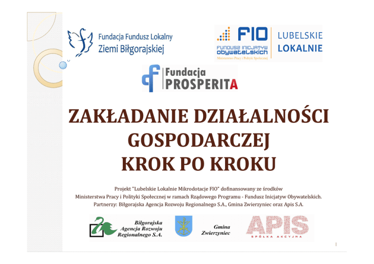 ZAKŁADANIE DZIAŁALNOŚCI GOSPODARCZEJ KROK PO KROKU Projekt "Lubelskie Lokalnie Mikrodotacje FIO" dofinansowany ze środków Ministerstwa Pracy i Polityki Społecznej w ramach Rządowego Programu - Fundusz Inicjatyw Obywatelskich. Partnerzy: Biłgorajska Agencja Rozwoju Regionalnego S.A., Gmina Zwierzyniec oraz Apis S.A. 1 Czym jest DZIAŁALNOŚĆ GOSPODARCZA?? GOSPODARCZA w rozumieniu Ustawy z 11 marca 2004 r. o podatku od towarów i usług obejmuje wszelką działalność producentów, handlowców lub usługodawców, w tym podmiotów pozyskujących zasoby naturalne oraz rolników, a także działalność osób wykonujących wolne zawody, również wówczas, gdy czynność została wykonana jednorazowo w okolicznościach wskazujących na zamiar wykonywania czynności w sposób częstotliwy. Działalność gospodarcza obejmuje również czynności polegające na wykorzystywaniu towarów lub wartości niematerialnych i prawnych w sposób ciągły dla celów zarobkowych. 2 Krok 1 – Wybór formy organizacyjno--prawnej organizacyjno działalności gospodarczej Zanim założymy działalność gospodarczą należy przemyśleć jaka forma organizacyjno-prawna będzie dla nas najkorzystniejsza. Istnieje możliwość prowadzenia firmy indywidualnie lub wejścia w spółkę (osobową lub kapitałową). 3 Formy prowadzenia działalności gospodarczej: DZIAŁALNOŚĆ GOSPODARCZA OSOBY FIZYCZNEJ SPÓŁKA CYWILNA (S.C.) SPÓŁKA JAWNA (S.J.) SPÓŁKA PARTNERSKA SPÓŁKA KOMANDYTOWA (SP.K.) SPÓŁKA KOMANDYTOWO-AKCYJNA SPÓŁKA Z OGRANICZONĄ ODPOWIEDZIALNOŚCIĄ (SPÓŁKA Z O.O.) SPÓŁKA AKCYJNA 4 Krok 2 – Rejestracja działalności gospodarczej Wszyscy przedsiębiorcy zobowiązani są zarejestrować swoją działalność w odpowiednim rejestrze. W przypadku: osób fizycznych oraz osób fizycznych będących wspólnikami spółek cywilnych rejestrem tym jest Centralna Ewidencja i Informacja o Działalności Gospodarczej (CEIDG), spółek jawnych, spółek komandytowych i komandytowo-akcyjnych, partnerskich, spółek z ograniczoną odpowiedzialnością oraz spółek akcyjnych - rejestr przedsiębiorców Krajowego Rejestru Sądowego. 5 Wniosek o wpis do CEIDG lub KRS można złożyć elektronicznie lub papierowo. Wniosek o wpis do rejestru CEIDG złożyć można osobiście – w urzędzie miasta lub gminy, korespondencyjnie lub też drogą elektroniczną – bezpośrednio na stronie CEIDG (funkcjonuje także pod nazwą firma.gov.pl). W tym ostatnim przypadku warunkiem jest posiadanie podpisu elektronicznego albo zaufanego profilu ePUAP . Rejestracja w CEIDG jest wolna od opłat. 6 Rejestracja: wypełniamy wniosek CEIDG-1 oraz przedkładamy dokument potwierdzający naszą tożsamość. Wniosek ten stanowi jednocześnie zgłoszenie do ZUS lub KRUS, GUS oraz US. Warto zwrócić uwagę na dokładne wypełnienie towarzyszących mu oświadczeń i zgłoszeń. Wpis dokonywany jest nie później niż następnego dnia roboczego od wpływu poprawnego wniosku do CEIDG. Działalność możemy podjąć już w dniu złożenia wniosku, o ile tę datę zaznaczyliśmy jako datę rozpoczęcia działalności. Możliwe jest także określenie daty późniejszej. 7 UWAGA! Do rejestracji niezbędne jest określenie przedmiotu działalności gospodarczej wg PKD (Polskiej Klasyfikacji Działalności). Pełna lista kodów PKD dostępna jest np. na stronie internetowej http://www.pkd.com.pl/wyszukiwarka /lista_pkd 8 Przedsiębiorca ma prawo we wniosku o wpis do CEIDG określić późniejszy dzień podjęcia działalności gospodarczej niż dzień złożenia wniosku. Przedsiębiorca jest obowiązany złożyć wniosek o zmianę wpisu w terminie najpóźniej 7 dni od dnia zmiany danych. Przedsiębiorca może zawiesić wykonywanie działalności gospodarczej na okres max. do 24 miesięcy. Jeżeli przedsiębiorca nie wznowi działalności przed upływem okresu 24 miesięcy, wpis zostanie wykreślony z urzędu. 9 W terminie 7 dni od rozpoczęcia działalności gospodarczej przedsiębiorca musi dokonać w swoim oddziale ZUS zgłoszenia do odpowiednich ubezpieczeń. Jeżeli prowadzenie firmy jest jedynym zajęciem przedsiębiorcy wówczas składa on formularz ZUS ZUA (zgłoszenie do ubezpieczeń). Kiedy natomiast przedsiębiorca wykonuje pełnoetatową pracę płatną w wysokości co najmniej minimalnej pensji krajowej (w roku 2016 minimalne wynagrodzenie wynosi 1850 zł brutto), wówczas może zgłosić się tylko do ubezpieczenia zdrowotnego na formularzu ZUS ZZA. Ponadto w przypadku zatrudniania pracowników należy dokonać ich zgłoszenia w terminie 7 dni od daty powstania obowiązku ubezpieczeń. 10 Podatek VAT: Gdy przedsiębiorca staje się płatnikiem podatku VAT to najpóźniej w dniu poprzedzającym dzień rozpoczęcia sprzedaży towarów lub świadczenia usług objętych VAT w Urzędzie Skarbowym właściwym w sprawach VAT składa druk zgłoszeniowy VAT-R . 11 Rejestracja w KRS: Warunkiem rejestracji spółek z o.o., sp. jawnej oraz komandytowej jest posiadanie podpisu elektronicznego przez każdego ze wspólników. Zaletą tej metody jest brak konieczności ponoszenia kosztów notarialnych związanych z zawieraniem umowy spółki. Dodatkowo, od 1 grudnia 2014 r., rejestrując spółkę przez Internet, można skorzystać z procedury tzw. "jednego okienka", co oznacza, że nie trzeba już samodzielnie dostarczać dokumentów rejestracyjnych do US i GUS w celu otrzymania numeru NIP i REGON, ani do ZUS (KRUS) w celu założenia konta płatnika składek. 12 Wniosek do KRS można złożyć drogą elektroniczną, osobiście w odpowiednim dla siedziby firmy sądzie lub korespondencyjnie. Adresy sądów znajdują się na stronach Ministerstwa Sprawiedliwości. Składając wniosek o rejestrację w KRS, trzeba do niego załączyć odpowiednie dokumenty. Lista wymaganych załączników różni się w zależności od formy prawnej, w jakiej chcemy prowadzić działalność gospodarczą. Do najważniejszych należą zwykle: - umowa
