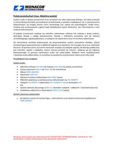 Pokój przesłuchań (tzw. Błękitny pokój) System audio w pokoju przesłuchań musi umożliwić nie tylko rejestrację dźwięku, ale także pozwolić na komunikację pomiędzy prowadzącym przesłuchanie a osobami znajdującymi się w pomieszczeniu odsłuchowym, po drugiej stronie lustra weneckiego (np. sędzią lub psychologiem). Dzięki temu, możliwe jest przekazywanie sugestii bądź dodatkowych pytań śledczemu, bez informowania o tym osoby przesłuchiwanej. W pokoju przesłuchań znajduje się mikrofon odsłuchowy sufitowy lub stołowy o dużej czułości, zbierający dźwięk z całego pomieszczenia. Dźwięk z mikrofonu przesyłany jest do miksera umożliwiającego regulację głośności, a następnie do rejestratora oraz na monitory odsłuchowe. Do komunikacji zwrotnej wykorzystuje się bezprzewodowy system przesyłania dźwięku. Osoba przesłuchująca wyposażona jest w odbiornik sygnału oraz specjalne, nie rzucające się w oczy, słuchawki douszne. W pomieszczeniu za lustrem weneckim znajduje się nadajnik sygnału, do którego podłączony jest mikrofon. Sygnał z nadajnika, można również przesłać do miksera i dołączyć go do nagrania dokonywanego za pomocą rejestratora audio lub audio-wideo. Nadajnik może współpracować z dowolną liczbą odbiorników, co umożliwia prowadzenie przesłuchania nawet przez kilka osób. Przykładowa lista urządzeń: System audio: Mikrofon sufitowy CM-502 lub stołowy ECM-302B do pokoju przesłuchań Zasilacz phantom EMA-3 lub EMA-200 do mikrofonów Mikser MMX-602/SW Rejestrator DPR-110 Aktywne monitory odsłuchowe MKA-50SET (para) Mikrofon pulpitowy w pomieszczeniu odsłuchowym np. PA-5000PTT Nadajnik TXA-800ST + odbiornik(i) ATS-162R/ATS-16R ze słuchawką S-83 lub System odsłuchu dousznego SIEM-111 (komplet: nadajnik + odbiornik + słuchawki douszne) Dodatkowy odbiornik ze słuchawkami SIEM-111/R (opcja) System rejestracji audio/wideo Kompletny zestaw do monitoringu, z rejestratorem oraz dwiema kamerami kopułkowymi DMR-2840SET Niniejsze opracowanie jest własnością firmy MONACOR® INTERNATIONAL GmbH & Co. KG. Kopiowanie w celach komercyjnych bez zezwolenia zabronione.