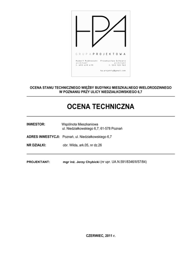 OCENA STANU TECHNICZNEGO WIĘŹBY BUDYNKU MIESZKALNEGO WIELORODZINNEGO W POZNANIU PRZY ULICY NIEDZIAŁKOWSKIEGO 6,7 OCENA TECHNICZNA INWESTOR: Wspólnota Mieszkaniowa ul. Niedziałkowskiego 6,7; 61-578 Poznań ADRES INWESTYCJI: Poznań, ul. Niedziałkowskiego 6,7 NR DZIAŁKI: obr. Wilda, ark.05, nr dz.26 PROJEKTANT: mgr inż. Jerzy Chybicki (nr upr. UA.N.591/8346/II/57/84) CZERWIEC, 2011 r. OPIS TECHNICZNY 1. Podstawa opracowania: 1.1. Umowa na wykonanie prac projektowych. 1.2. Materiały wyjściowe –inwentaryzacja własna budynku. 1.3. Wizja lokalna. 1.4. Literatura z zakresu konstrukcji drewnianych. 1.5. Polskie normy. 2. Zakres opracowania Celem niniejszego opracowania jest ocena stanu technicznego więźby dachowej przedmiotowego budynku będąca podstawą do rozpoczęcia robót modernizacyjnych polegających na wymianie poszycia dachu budynku w ramach remontu i termomodernizacji dachu. 3. Opis stanu istniejącego Przedmiotowy obiekt to budynek mieszkalny wielorodzinny, w zabudowie śródmiejskiej z lat początku XX wieku, 4 - kondygnacyjny z użytkowym poddaszem, podpiwniczony. Posiada ściany nośne wykonane z cegły pełnej, częściowo otynkowane metodą ciężką – mokrą. Dach w budynku o konstrukcji drewnianej, pokryty dachówką ceramiczną (dachówka karpiówka układana w koronkę). Oceniana więźba głównej połaci dachu została zaprojektowana w układzie dachu mansardowego, wieszarowego; natomiast pozostała część dachu w układzie dachu płatwiowo – kleszczowego. W części poddasza nieużytkowego konstrukcję dachu stanowią płatwie pośrednie o przekroju 16x18cm spięte kleszczami 8x18cm oraz podparte słupami 14x14cm. Na płatwiach rozpięte są krokwie o przekroju 14x16cm. Konstrukcję dachów nad ryzalitami stanowią płatwie kalenicowe 14x16cm oraz krokwie 14x16cm Ze względu na brak dostępu do więźby dachowej w części mieszkalnej należy po zdjęciu pokrycia dokonać ponownej oceny stanu technicznego. Dach budynku jest pokryty dachówką ceramiczną karpiówką łączoną na zaprawę cementową. Poszycie dachu częściowo uszkodzone. 4. Ocena techniczna stanu istniejącego W trakcie przeprowadzonej wizji lokalnej stwierdzono co następuje: Więźba dachowa jest w dobrym stanie technicznym – w trakcie realizacji remontu, po odkryciu dachu należy przeprowadzić dodatkową ocenę stanu technicznego elementów więźby obecnie niewidocznych. W przypadku stwierdzenia konieczności wymiany dodatkowych elementów więźby dachowej należy wymienić je nowe zachowując przekroje konstrukcyjne. Brak dekompletacji elementów konstrukcyjnych, czy korozji biologicznej w skutek działania grzybów i owadów (w części dostępnego poddasza nieużytkowego) Materiał więźby jest suchy, drewno należy zaimpregnować drewnochronem Poszycie dachu z dachówki ceramicznej łączonej na zaprawę cementową wykazuje uszkodzenia i kwalifikuje się do wymiany. Więźba dachowa nie wykazuje nadmiernych ugięć czy zmian geometrii 5. Wnioski Na podstawie przeprowadzonej wizji lokalnej stwierdzono, że przedmiotowy dach nadaje się do przeprowadzenia planowanych robót polegających na wymianie pokrycia, opierzeń i uzbrojenia dachu. Pokrycie dachu może być wymienione na podobne. Dopuszcza się także ocieplenie więźby za pomocą wełny mineralnej miękkiej umieszczonej pomiędzy krokwiami. Ciężar tej wełny mineralnej nie powinien przekroczyć 5kN/m2. 6. Zalecenia wykonawcze Przed przystąpieniem do wymiany pokrycia dachowego należy usunąć starą dachówkę, opierzenia z blachy. Ewentualne elementy drewniane więźby nie nadające się do użytku, należy wymienić na nowe zachowując przekroje elementów konstrukcyjnych. Przed położeniem nowej dachówki należy wykonać nowe ołacenie (łaty i kontrłaty) oraz położyć folię dachową wysokoparoprzepuszczalną. W trakcie prowadzenia prac remontowych dachu należy rozebrać istniejące kominy do poziomu dachu, a następnie wymurować z cegły pełnej (ponad dachem z cegły klinkierowej lub też otynkować). Ponadto należy pamiętać o wykonaniu nowych obróbek blacharskich, rynien, rur spustowych z blachy tytanowo – cynkowej oraz o wykonaniu nowych ław kominiarskich. Wszystkie roboty budowlano-montażowe wykonać należy zgodnie z obowiązującymi w tym zakresie normami i przepisami BHP. Prace budowlane może przeprowadzić tylko wyspecjalizowana firma pod nadzorem osób uprawnionych do kierowania robotami budowlanymi i nadzorowania jakości ich wykonania. Wszelkie prace budowlane należy wykonać zgodnie z zatwierdzonym projektem technicznym (opisem technicznym oraz rysunkami) po uprzednim uzyskaniu decyzji o pozwoleniu na budowę oraz zgłoszeniu zamiaru rozpoczęcia robót w odpowiedniej jednostce Nadzoru Budowlanego. 7. Dokumentacja fotograficzna Fot. 1 Budynek wielorodzinny przy ulicy Niedziałkowskiego 6,7 w Poznaniu. Fot. 2 Widok na więźbę głównej połaci dachowej – płatew pośrednia oraz krokwie. Fot. 3 Kleszcze oraz podparcie płatwi pośredniej. Fot. 4 Połączenie dachów o różnym nachylenie połaci. Opracował: mgr inż. Jerzy Chybicki (nr upr. UA.N.591/8346/II/57/84)