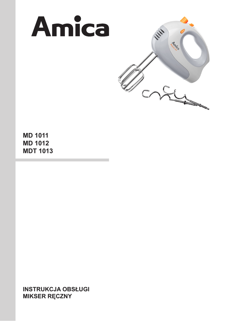 MD 1011 MD 1012 MDT 1013 INSTRUKCJA OBSŁUGI MIKSER RĘCZNY PL 2 1 5 3 4 1 6 2 3 4 5 2 SZANOWNI PAŃSTWO! Urządzenie marki Amica to połączenie wyjątkowej łatwości obsługi i doskonałej efektywności. Każde urządzenie przed opuszczeniem fabryki zostało dokładnie sprawdzone pod względem bezpieczeństwa i funkcjonalności. Prosimy Państwa o uważną lekturę instrukcji obsługi przed uruchomieniem urządzenia. Poniżej znajdują się objaśnienia dotyczące symboli występujących w niniejszej instrukcji: Ważne informacje dotyczące bezpieczeństwa użytkownika urządzenia oraz prawidłowej jego eksploatacji. i Zagrożenia wynikające z niewłaściwego postępowania z urządzeniem oraz czynnościach, które może wykonać jedynie wykwalifikowana osoba, na przykład z serwisu producenta. Wskazówki związane z użytkowaniem sprzętu. Informacje dotyczące ochrony środowiska naturalnego. Zakaz wykonywania pewnych czynności przez użytkownika. SPIS TREŚCI DANE TECHNICZNE WSKAZÓWKI DOTYCZĄCE BEZPIECZEŃSTWA UŻYTKOWANIA USUWANIE / ZŁOMOWANIE ZUŻYTEGO SPRZĘTU OBSŁUGA CZYSZCZENIE GWARANCJA, OBSŁUGA POSPRZEDAŻNA 3 4 6 7 8 9 DANE TECHNICZNE / WYPOSAŻENIE Typ MD 1011 / MD1012 / MDT 1013 Napięcie znamionowe 220-240V ~50 Hz Moc znamionowa 300W Regulacja prędkości Tak, 5 biegów Funkcja Turbo Tak Trzepaki Tak / 2 szt. / stal nierdzewna Mieszaki Tak / 2 szt. / stal nierdzewna Przewód zasilający ~1,1m Urządzenie przeznaczone jest wyłącznie do użytku domowego. Producent zastrzega sobie możliwość dokonywania zmian niewpływających na działanie urządzenia. 3 PL GRATULUJEMY WYBORU SPRZĘTU MARKI AMICA WSKAZÓWKI DOTYCZĄCE BEZPIECZEŃSTWA UŻYTKOWANIA PL i Uwaga! Aby zminimalizować ryzyko powstania pożaru, porażenia prądem lub uszkodzenia ciała: Uważnie przeczytaj tą instrukcję przed użytkowaniem urządzenia. Dzieci nie zdają sobie sprawy z niebezpieczeństw, które mogą powstać podczas używania urządzeń elektrycznych; dlatego trzymaj urządzenie poza zasięgiem dzieci. Nie zanurzaj korpusu urządzenia w wodzie lub innych cieczach. Zanurzenie w wodzie może spowodować porażenie prądem elektrycznym. W przypadku zalania wodą zewnętrznych elementów urządzenia, przed ponownym włączeniem urządzenia do sieci dokładnie je wysusz. Nie dotykaj mokrych powierzchni mających kontakt z podłączonym do zasilania urządzeniem, należy natychmiast odłączyć je od zasilania. Nie używaj urządzenia, jeżeli wykazuje ono jakiekolwiek oznaki uszkodzenia przewodu przyłączeniowego lub jeżeli urządzenie zostało upuszczone na podłogę. Po użyciu zawsze wyciągaj wtyczkę z gniazdka a także w przypadku jakiegokolwiek niewłaściwego działania, przed czyszczeniem lub przed wymianą akcesoriów. Przy wyciąganiu wtyczki z gniazdka ściennego nigdy nie ciągnij za przewód tylko za wtyczkę jednocześnie trzymając drugą ręką gniazdko sieciowe. Urządzenie jest wykonane w II klasie ochrony przeciwporażeniowej. Nie próbuj usuwać żadnych części obudowy. Aby uniknąć uszkodzenia przewodu zasilającego nie umieszczaj go ponad ostrymi krawędziami, ani w pobliżu gorących powierzchni. Nie wystawiaj urządzenia na deszcz lub wilgoć i nie używaj urządzenia na zewnątrz. Nie obsługuj urządzenia mokrymi rękoma. Jeżeli przewód sieciowy lub wtyczka ulegną uszkodzeniu, to powinny one być wymienione przez specjalistyczny zakład naprawczy w celu uniknięcia zagrożenia. 4 Używanie akcesoriów, które nie zostały dostarczone wraz z produktem może doprowadzić do uszkodzenia urządzenia. Nigdy nie stawiaj urządzenia na gorących powierzchniach. Należy zachować ostrożność przy myciu akcesoriów. Nigdy nie zostawiaj urządzenia podłączonego do sieci bez nadzoru. Niniejszy sprzęt nie jest przeznaczony do użytkowania przez osoby (w tym dzieci) o ograniczonej zdolności fizycznej, czuciowej lub psychicznej, lub osoby o braku doświadczenia lub znajomości sprzętu, chyba że odbywa się to pod nadzorem lub zgodnie z instrukcją użytkowania sprzętu, przekazaną przez osoby odpowiadające za ich bezpieczeństwo. Należy zwracać uwagę na dzieci, by nie bawiły się urządzeniem. Wyciągaj wtyczkę z gniazda sieciowe przed zmianą akcesoriów. To urządzenie może być używane przez dzieci w wieku 8 lat i starsze, przez osoby o ograniczonej zdolności fizycznej, czuciowej lub psychicznej oraz osoby o braku doświadczenia lub znajomości sprzętu, gdy są one nadzorowane lub zostały poinstruowane na temat korzystania z urządzenia w sposób bezpieczny i znają zagrożenia związane z użytkowaniem urządzenia. Dzieci nie powinny bawić się urządzeniem. Czyszczenie i konserwacja urządzenia nie powinna być wykonywania przez dzieci chyba że ukończyły 8 lat i są nadzorowane przez odpowiednią osobę. Powierzchnia na której jest użytkowane urządzenie powinna być wypoziomowana czysta i sucha. i Aby włączyć urządzenie przesuń suwak (Rys. 1 poz. 9) na pozycję z zakresu 1-5, dodatkowo można użyc funkcji ”TURBO” (Rys. 1 poz. 10). Warunkiem użycia funkcji ”TURBO” jest wcześniejsze załączenie biegu z zakresu 1-5. Aby wyłączyć silnik urządzenia przesuń suwak (Rys. 1 poz. 9) w pozycję ”0”. Całkowite wyłączenie urządzenia jest możliwe poprzez odłączenie urządzenia od zasilania. 5 PL WSKAZÓWKI DOTYCZĄCE BEZPIECZEŃSTWA UŻYTKOWANIA WSKAZÓWKI DOTYCZĄCE BEZPIECZEŃSTWA UŻYTKOWANIA PL Nie używaj urządzenia w połączeniu z gotującą się żywnością. W przypadku zablokowania elementów rozdrabniających / miksujących, przed usunięciem blokujących składników, wyciągnij wtyczkę z gniazdka. Zachowaj szczególną ostrożność. Elementy rozdrabniające są bardzo ostre. Podczas pracy urządzenia nie dotykaj elementów mieszających lub rozdrabniających, zwróć szczególną uwagę na długie włosy i części garderoby. Niektóre elementy zestawu są wyposażone w ostre noże, używając ich zachow