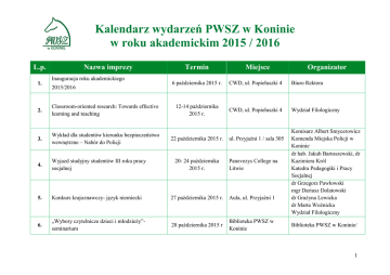 Kalendarz wydarzeń PWSZ w Koninie w roku akademickim 2015 / 2016 L.p. 1. Nazwa imprezy Inauguracja roku akademickiego 2015/2016 2. Classroom-oriented research: Towards effective learning and teaching 3. Wykład dla studentów kierunku bezpieczeństwo wewnętrzne – Nabór do Policji 4. Wyjazd studyjny studentów III roku pracy socjalnej 5. 6. Termin Miejsce Organizator 6 października 2015 r. CWD, ul. Popiełuszki 4 Biuro Rektora 12-14 października 2015 r. CWD, ul. Popiełuszki 4 Wydział Filologiczny 22 października 2015 r. ul. Przyjaźni 1 / sala 305 20- 24 października 2015 r. Panevezys College na Litwie Konkurs krajoznawczy- język niemiecki 27 października 2015 r. Aula, ul. Przyjaźni 1 „Wybory czytelnicze dzieci i młodzieży”seminarium 28 października 2015 r Biblioteka PWSZ w Koninie Komisarz Albert Smycerowicz Komenda Miejska Policji w Koninie dr hab. Jakub Bartoszewski, dr Kazimiera Król Katedra Pedagogiki i Pracy Socjalnej dr Grzegorz Pawłowski mgr Dariusz Dolatowski dr Grażyna Lewicka dr Marta Woźnicka Wydział Filologiczny Biblioteka PWSZ w Koninie/ 1 Kalendarz wydarzeń PWSZ w Koninie w roku akademickim 2015 / 2016 7. 8. Wychowanie Fizyczne – metodyka nauczania i aplikacje – konferencja metodyczno-szkoleniowa Projekty edukacyjne” „Studenci dzieciom” 28 października 2015 r. Hala Sportowa MOSiR oraz CWD ul. Popiełuszki 4 Październik 2015 styczeń 2016 r. ul. Popiełuszki 4 9. Zbiórka krwi 3 listopada 2015 r. ul. Przyjaźni 1/sala 5 b 10. Akademia Młodego Studenta – bezpieczeństwo wewnętrzne 10 listopada 2015 r. CWD, ul. Popiełuszki 4 11. ZBLIŻENIA: językoznawstwo - translatoryka literaturoznawstwo 16 -17 listopada 2015 r. 12. Międzynarodowa Konferencja Naukowa: „ Praca socjalna wyzwania i dylematy. Ujęcie interdyscyplinarne” – edycja II 17 listopada 2015 r. ul. Przyjaźni 1 ul. Popiełuszki 4 Katedra Wychowania Fizycznego i Fizjoterapii, Zakład Wychowania Fizycznego i Sportu oraz Miejski Ośrodek Doskonalenia Nauczycieli i Centrum Doskonalenia Nauczycieli w Koninie mgr Małgorzata Chybicka Zakład Pedagogiki Klub Honorowych Dawców Krwi PCK przy PWSZ w Koninie. mgr Monika Wojciechowska Biuro ds. Promocji Dr Julian Jaroszewski Katedra Bezpieczeństwa dr Anna Stolarczyk-Gembiak Wydział Filologiczny PWSZ w Koninie, Wydział Filologiczny Zakład Pracy Socjalnej, Społeczno-Ekonomiczny Zespół Badawczy 2 Kalendarz wydarzeń PWSZ w Koninie w roku akademickim 2015 / 2016 13. Młodzieżowy Półfinał o Tytuł Mistrza Prowadzenia Przedsiębiorstwa Społecznego – „Młodzieżowy Turniej Przedsiębiorczości Społecznej” 14. Konkurs tłumaczeniowy 15. Seminarium dla studentów i nauczycieli „Aktualne zmiany w prawie oświatowym i ich konsekwencje” 16. Poetycki listopad z PWSZ – poetycka godzina z teatrem kamishi –bai dla przedszkolaków 17. Akademia Młodego Studenta – uczniowie z Gimnazjum w Brzeźnie 19- 20 oraz 26 - 27 listopada 2015 r. 25 listopada 2015 r. Listopad 2015 r. 4, 18 i 25 listopada 2015 r. 1 grudnia 2015 r. ul. Przyjaźni 1 sale: 107, 108, 109 i 112 Aula, ul. Przyjaźni 1 ul. Popiełuszki 4 Fundacja Wiarygodny Partner Biuro ds. Promocji mgr EwaKonieczna mgr DariuszDolatowski mgr Sylwia Dominiak mgr Bożena Miastkowska dr Grzegorz Pawłowski mgr Elżbieta WilińskaHajewska dr Ewa Urbaniak-Rybicka dr Magdalena PospieszyńskaWojtkowiak Wydział Filologiczny mgr Małgorzata Chybicka mgr Ewa Łechtańska mgr Wiesława Kozłowska Zakład Pedagogiki Czytelnie filii Miejskiej Biblioteki Publicznej w Koninie mgr Wiesława Kozłowska Zakład Pedagogiki Aula, ul. Przyjaźni 1 dr Agnieszka Szymankowska Zakład Zarządzania 3 Kalendarz wydarzeń PWSZ w Koninie w roku akademickim 2015 / 2016 18. Dzień Portugalski 1 grudnia 2015 r. Sala 5B, ul. Przyjaźni 1 , godz. 12:00 mgr Patrycja Herman- Wróbel 19. Akademia Młodego Studenta – uczniowie ze Szkoły Podstawowej nr 5 w Turku 7 grudnia 2015 r. ul. Popiełuszki 4 mgr Artur Cygan Zakład Pracy Socjalnej mgr Ewa Konieczna mgr Dariusz Dolatowski mgr SylwiaDominiak mgr BożenaMiastkowska mgr Elżbieta WilińskaHajewska dr Ewa Urbaniak-Rybicka dr Magdalena PospieszyńskaWojtkowiak Wydział Filologiczny 20. Konkurs recytatorski 15 grudnia 2015 ul. Przyjaźni 1 21. Koncert Świąteczny 14 grudnia 2015 r. Aula, ul. Przyjaźni 1godz. 18:00 Akademicki Chór PWSZ w Koninie /Biuro ds. Promocji 22. Uroczystość nadania imienia Bibliotece PWSZ w Koninie 15 grudnia 2015 r. Biblioteka PWSZ w Koninie Biuro Rektora 23. III Studenckie Seminarium Naukowo-Badawcze z cyklu: „ Dziecko w codziennej przestrzeni edukacyjnej” „Szkolne laboratorium doświadczenia sztuki” 16 grudnia 2015 r. Biblioteka PWSZ w Koninie dr Paweł Trzos Zakład Pedagogiki dr Marcin Olejniczak Zakład Pedagogiki, SKN Wizja 4 Kalendarz wydarzeń PWSZ w Koninie w roku akademickim 2015 / 2016 23. Akademia Młodego Studenta – uczniowie Zespołu Szkół Ekonomiczno-Usługowych w Żychlinie 17 grudnia 2015 r. ul. Popiełuszki 4 dr Karolina Waliszewska Zakład Wychowania fizycznego 24. Finał Turnieju o tytuł Mistrza Prowadzenia Przedsiębiorstwa Społecznego Grudzień 2015 r. ul. Przyjaźni 1 Fundacja Wiarygodny Partner Biuro ds. Promocji 25. „Świąteczna Kawiarenka”- akcja charytatywna dla dzieci z Pogotowia Opiekuńczego w Koninie Grudzień 2015 ul. Popiełuszki 4 SKN Młodych Pedagogów dr Marianna Styczyńska 26. Wystawa prac Pawła Obarskiego Grudzień2015 r /styczeń 2016 r. Biblioteka PWSZ w Koninie mgr Marcin Olejniczak, ul. Popiełuszki 4 SKN Wizja, SKN Młodych Pedagogów mgr Marcin Olejniczak, dr Marianna Styczyńska Konin Studenci/ Biuro ds. Promocji ul. Wyszyńskiego 35 dr inż. Robert Cieślak Katedra Mechaniki i Energetyki ul. Popiełuszki 4 dr Bartosz Chmielewski Katedra Wychowania Fizycznego i Fizjoterapii 27. Warsztaty muzyczne dla dzieci i studentów – koncert/ pokaz SAMBAR 28. Wielka Orkiestra Świątecznej Pomocy 29. Akademia Młodego Studenta dla uczniów Zespołu Szkół im. Mikołaja K