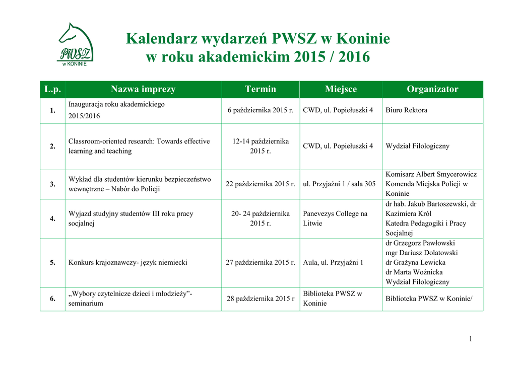 Kalendarz wydarzeń PWSZ w Koninie w roku