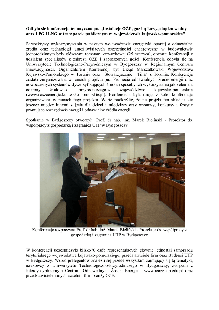 Odbyła się konferencja tematyczna pn. „Instalacje OŹE, gaz łupkowy, stopień wodny oraz LPG i LNG w transporcie publicznym w województwie kujawsko-pomorskim” Perspektywy wykorzystywania w naszym województwie energetyki opartej o odnawialne źródła oraz technologii umożliwiających oszczędności energetyczne w budownictwie jednorodzinnym były głównymi tematami czwartkowej (25 czerwca), otwartej konferencji z udziałem specjalistów z zakresu OZE i zaproszonych gości. Konferencja odbyła się na Uniwersytecie Technologiczno-Przyrodniczym w Bydgoszczy w Regionalnym Centrum Innowacyjności. Organizatorem Konferencji był Urząd Marszałkowski Województwa Kujawsko-Pomorskiego w Toruniu oraz Stowarzyszenie "Tilia" z Torunia. Konferencja została zorganizowana w ramach projektu pn.: Promocja odnawialnych źródeł energii oraz nowoczesnych systemów dywersyfikujących źródła i sposoby ich wykorzystania jako element ochrony środowiska przyrodniczego w województwie kujawsko-pomorskim (www.naszaenergia.kujawsko-pomorskie.pl). Konferencja była drugą z kolei konferencją organizowana w ramach tego projektu. Warto podkreślić, że na projekt ten składają się jeszcze między innymi zajęcia dla dzieci i młodzieży oraz wystawy, konkursy i festyny promujące oszczędność energii i odnawialne źródła energii. Spotkanie w Bydgoszczy otworzył Prof. dr hab. inż. Marek Bieliński - Prorektor ds. współpracy z gospodarką i zagranicą UTP w Bydgoszczy. Konferencję rozpoczyna Prof. dr hab. inż. Marek Bieliński - Prorektor ds. współpracy z gospodarką i zagranicą UTP w Bydgoszczy W konferencji uczestniczyło blisko70 osób reprezentujących głównie jednostki samorządu terytorialnego województwa kujawsko-pomorskiego, przedstawiciele firm oraz studenci UTP w Bydgoszczy. Wśród prelegentów znaleźli się przede wszystkim zajmujący się tą tematyką naukowcy z Uniwersytetu Technologiczno-Przyrodniczego w Bydgoszczy, związani z Interdyscyplinarnym Centrum Odnawialnych Źródeł Energii - www.icoze.utp.edu.pl oraz przedstawiciele innych uczelni i firm branży OZE. Sala obrad podczas konferencji W sesji pierwszej konferencji profesor dr hab. inż. Józef Flizikowski przedstawił problematykę możliwości wykorzystania w naszym regionie energetyki wodnej oraz budowy stopnia wodnego w woj. kujawsko-pomorskim, mgr inż. Beata Dolata zaprezentowała nowe Centrum Demonstracyjne Odnawialnych Źródeł Energii w Bydgoszczy, Dr inż. Bogdan Noga z Uniwersytetu Technologiczno-Humanistycznego z Radomia przedstawił analizę możliwości wykorzystania gazu łukowego i instalacji geotermalnych w woj. kujawsko-pomorskim, a mgr inż. Łukasz Trzeciak zaprezentował polskie oraz światowe trendy rozwojowe w zakresie instalacji fotowoltaicznych. W sesji drugiej mgr inż. Tomasz Mania - Prezes Polskiego Stowarzyszenia POMP ciepła przedstawił zagadnienie efektywnego wykorzystania pomp ciepła i systemów magazynowania energii ciepła, mgr Joanna Kawa zaprezentowała czekające branżę zmiany wynikające z wprowadzenia w Polsce nowej ustawy o OZE a mgr inż. Adam Koniszewski zaprezentował przykłady ekologicznych systemów grzewczych w budownictwie jednorodzinnym. Na zakończenie mgr inż. Maciej Gniot zaprezentował analizę możliwości wykorzystania LPG i LNG w transporcie publicznym w województwie kujawsko-pomorskim Konferencja została zorganizowana w ważnym dla branży OZE okresie. Branża ma szansę dynamicznie się rozwijać szczególnie w zakresie mikroinstalacji. Według danych Urzędu Regulacji Energetyki, w Polsce jest obecnie 870 prosumentów posiadających mikroinstalacje fotowoltaiczne o mocy do 40kWp przyłączone do sieci. Tylko w zeszłym roku przyłączono do sieci nieco ponad 570 mikroinstalacji fotowoltaicznych. Łączna moc zainstalowana tych instalacji to przeszło 4,2 MWp. Dla porównania szacuje się, że w Niemczech prosumentów jest dziś ponad 2 miliony! Przestawia to wciąż niewielką, ale rozwojową skalę inwestycji prosumenckich w Polsce. Wg przedstawicieli branży OZE podpisana przez Sejm w lutym tego roku, a podpisana przez Prezydenta w marcu ustawa o OZE będzie wkrótce nowelizowana w kierunku zmniejszania taryf gwarantowanych dla najmniejszych instalacji PV i komplikowania systemu wsparcia. Z pewnością wpłynie to negatywnie na rozwój rynku instalacji OZE - szczególnie rynku prosumenckiego. Zmiany zaproponowane przez Ministerstwo Gospodarki wynikają z lobbingu dużych firm energetycznych. Ważne jest zatem promowanie korzystnych aspektów wynikających ze stosowania i wdrażania systemów energetyki odnawialnej w Polsce. Stałe stawki w ramach polskiego systemu taryf gwarantowanych mają obowiązywać dla każdej domowej instalacji mieszczącej się w w/w przedziale mocy, w tym okresie od momentu jej uruchomienia. Dzięki tym zmianom wprowadza się obowiązek zakupu energii od wytwórcy energii z mikroinstalacji o mocy do 3 kW wykorzystującej różne odnawialne źródła energii po określonej, stałej w okresie 15 lat, cenie (tylko dla pierwszych 300 MW): hydroenergia, energia wiatru, energia promieniowania słonecznego za 0,75 zł za 1 kWh. Dla mikroinstalacji o mocy powyżej 3 kW do 10 kW przewidziano natomiast następujące taryfy gwarantowane (tylko dla pierwszych 500 MW): - biogaz rolniczy - 0, 70 zł za 1 kWh, - biogaz pozyskany z surowców pochodzących ze składowisk odpadów - 0,55 zł za 1 kWh, - biogaz pozyskany z surowców pochodzących z oczyszczalni ścieków 0,45 zł za 1 kWh, - hydroenergia - 0,65 zł za 1 kWh, - energia wiatru - 0,65 zł za 1 kWh, - energia promieniowania słonecznego - 0,65 zł za 1 kWh. Warto zdawać sobie sprawę, że dzięki zmianom, które wprowadzi ustawa istnieje szansa na poprawę jakości powietrza - zwiększy się w Polsce ilość ekologicznych instalacji grzewczych opartych o OZE. Inna sprawą jest to, że do tej pory zieloną energię produkowały wyłącznie koncerny energetyczne, a ter