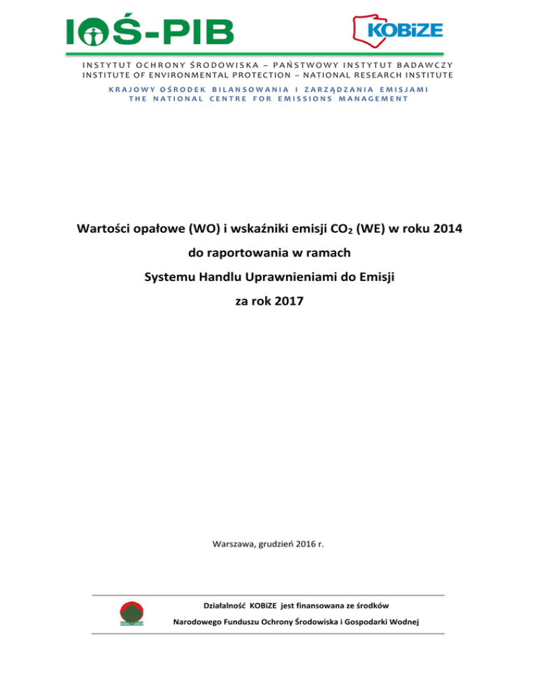INSTYTUT OCHRONY ŚRODOWISKA – PAŃSTWOWY INSTYTUT BADAWCZY IN S TI TU TE O F E NV IR O N ME NT AL P RO T EC T ION – N AT ION AL R E S EA RC H I NS T IT UT E KRAJOWY OŚRODEK BILANSOWANIA I ZARZĄDZANIA EMISJAMI THE NATIONAL CENTRE FOR EMISSIONS MANAGEMENT Wartości opałowe (WO) i wskaźniki emisji CO2 (WE) w roku 2014 do raportowania w ramach Systemu Handlu Uprawnieniami do Emisji za rok 2017 Warszawa, grudzień 2016 r. Działalność KOBiZE jest finansowana ze środków Narodowego Funduszu Ochrony Środowiska i Gospodarki Wodnej Prezentowane tabele zawierają dane na temat wartości opałowych (WO) i wskaźników emisji CO2 (WE) dla paliw wykorzystywanych w gospodarce krajowej w 2014 roku. W tabelach 1-13 zestawione zostały krajowe wartości WO i WE dla węgla dla poszczególnych rodzajów działalności (jeżeli wg danych statystycznych występowało w danym dziale zużycie tego paliwa). Wskaźniki emisji zestawione w tych tabelach odpowiadają wyłącznie podanej dla nich wartości opałowej. W tabeli 14 podane zostały wskaźniki emisji CO2 dla pozostałych paliw. Wartości tych wskaźników emisji oparte są na domyślnych wskaźnikach emisji CO2 podawanych w wytycznych IPCC (2006 IPCC Guidelines for National Greenhouse Gas Inventories) i mogą być stosowane niezależnie od rodzaju działalności. Wartości opałowe w tabeli 14 (pochodzące z wytycznych IPCC) zostały podane w celach informacyjnych dla ułatwienia raportowania przez prowadzących instalacje. Podmioty nie są zobligowane do stosowania wskaźnika emisji w połączeniu z podaną w tej tabeli wartością opałową. Wartości opałowe przedstawione w tabeli 14 nie są stosowane w krajowej inwentaryzacji emisji gazów cieplarnianych. Dodatkowo zamieszczona została tabela 15, w której podano wartości wskaźników emisji CO 2 dla węgla kamiennego i brunatnego, obliczone na podstawie średnich krajowych wartości opałowych dla tych paliw (średnie wartości WO dla węgla kamiennego i brunatnego wyliczono na podstawie krajowego bilansu tych paliw dla roku 2014, przygotowanego w oparciu o dane zestawione wg metodyki Eurostatu). Wskaźniki emisji z tej tabeli mogą być wykorzystane przez prowadzących instalacje tylko w przypadku, kiedy w danej instalacji zużywany był węgiel, a w tabeli odpowiadającej danemu rodzajowi działalności (tab. 1-13) nie ma wartości WO i WE dla węgla (może to mieć miejsce w sytuacji, kiedy zużycie węgla w danej branży było tak niewielkie, że nie zostało wykazane w statystyce ogólnokrajowej). Emisji CO2 ze spalania biomasy (drewna opałowego i odpadów pochodzenia drzewnego, odpadów komunalnych biogenicznych i biogazu) nie wlicza się do sumy emisji ze spalania paliw, zgodnie z zasadami ustalonymi w systemie handlu uprawnieniami do emisji oraz IPCC. Podejście to jest równoważne stosowaniu zerowego wskaźnika emisji dla biomasy. Współczynnik utlenienia jest już uwzględniony w wartości wskaźnika emisji danego paliwa. Wartości z tabel zawierających wskaźniki emisji i wartości opałowe dla węgla (tab. 1-13) należy wykorzystywać stosownie do podstawowego rodzaju działalności (PKD 2007) wpisywanego na sprawozdaniach G-02 i G-03. Dla poszczególnych rodzajów działalności w niniejszym opracowaniu dane są umieszczone następująco: Nr Rodzaj działalności tabeli Elektrownie i elektrociepłownie zawodowe 1 Elektrociepłownie przemysłowe 2 Ciepłownie 3 Koksownie 4 Produkcja żelaza i stali (grupy z działu 24 z wyjątkiem grup wymienionych poniżej – w tabeli 6) 5 Przemysł metali nieżelaznych (grupy: 24.4, 24.53, 24.54) 6 Przemysł chemiczny (dział 20 i 21) 7 Przemysł papierniczy i poligraficzny (dział 17 i 18) 8 Przemysł spożywczy (dział 10, 11 i 12) 9 Produkcja wyrobów z pozostałych mineralnych surowców niemetalicznych (dział 23) 10 Inne przemysły - z sekcji B (górnictwo i wydobywanie) działy: 07, 08, 09.9, z sekcji C (przetwórstwo przemysłowe) działy: 13-16, 22, 25-32 oraz sekcja F (budownictwo) działy: 41-43 11 Instytucje/handel/usługi 12 Rolnictwo, leśnictwo i rybołówstwo 13 Dla pozostałych paliw (innych niż węgiel) stosuje się wartości z tabeli 14, niezależnie od podstawowego rodzaju działalności (PKD). Wartości opałowe (WO) i wskaźniki emisji CO2 (WE) w roku 2014 do raportowania w Systemie Handlu Uprawnieniami do Emisji za rok 2017 Tabela 1. Elektrownie i elektrociepłownie zawodowe RODZAJ PALIWA Węgiel kamienny Węgiel brunatny Tabela 2. Elektrociepłownie przemysłowe RODZAJ PALIWA Węgiel kamienny Tabela 3. Ciepłownie RODZAJ PALIWA Węgiel kamienny Węgiel brunatny Tabela 4. Koksownie RODZAJ PALIWA Węgiel kamienny WO MJ/kg 21,77 8,12 WE CO2 kg/GJ 92,30 110,77 WO MJ/kg 22,81 WE CO2 kg/GJ 94,69 WO MJ/kg 21,77 8,32 WE CO2 kg/GJ 94,93 109,77 WO MJ/kg 28,98 WE CO2 kg/GJ 93,57 Tabela 5. Produkcja żelaza i stali (grupy z działu 24 z wyjątkiem wymienionych w tab. 6) RODZAJ PALIWA WO WE CO2 MJ/kg kg/GJ Węgiel kamienny 26,73 93,92 Tabela 6. Przemysł metali nieżelaznych (grupy 24.4, 24.53, 24.54) RODZAJ PALIWA WO MJ/kg Węgiel kamienny 22,75 Tabela 7. Przemysł chemiczny (dział 20 i 21) RODZAJ PALIWA Węgiel kamienny Tabela 8. Przemysł papierniczy i poligraficzny (dział 17 i 18) RODZAJ PALIWA Węgiel kamienny Tabela 9. Przemysł spożywczy (dział 10, 11 i 12) RODZAJ PALIWA Węgiel kamienny WE CO2 kg/GJ 94,70 WO MJ/kg 22,63 WE CO2 kg/GJ 94,73 WO MJ/kg 22,63 WE CO2 kg/GJ 94,73 WO MJ/kg 22,64 WE CO2 kg/GJ 94,73 Tabela 10. Produkcja wyrobów z pozostałych mineralnych surowców niemetalicznych (dział 23) RODZAJ PALIWA WO WE CO2 MJ/kg kg/GJ Węgiel kamienny 22,63 94,73 Węgiel brunatny 8,33 109,74 Tabela 11. Inne przemysły RODZAJ PALIWA Węgiel kamienny Węgiel brunatny Tabela 12. Instytucje/handel /usługi RODZAJ PALIWA Węgiel kamienny Węgiel brunatny Tabela 13. Rolnictwo, leśnictwo i rybołówstwo RODZAJ PALIWA Węgiel kamienny Węgiel brunatny WO MJ/kg WE CO2 kg/GJ 22,63 8,33 94,73 109,74 WO MJ/kg 26,00 8,04
