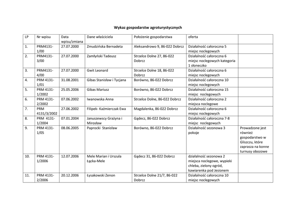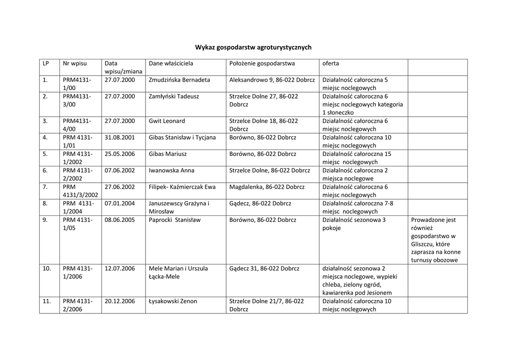 Wykaz gospodarstw agroturystycznych LP Nr wpisu Data Dane właściciela wpisu/zmiana 27.07.2000 Zmudzińska Bernadeta Położenie gospodarstwa oferta 1. PRM41311/00 PRM41313/00 Aleksandrowo 9, 86-022 Dobrcz 27.07.2000 Zamłyński Tadeusz Strzelce Dolne 27, 86-022 Dobrcz PRM41314/00 PRM 41311/01 PRM 41311/2002 PRM 41312/2002 PRM 4131/3/2002 PRM 41311/2004 PRM 41311/05 27.07.2000 Gwit Leonard 31.08.2001 Gibas Stanisław i Tycjana Strzelce Dolne 18, 86-022 Dobrcz Borówno, 86-022 Dobrcz 25.05.2006 Gibas Mariusz Borówno, 86-022 Dobrcz 07.06.2002 Iwanowska Anna Strzelce Dolne, 86-022 Dobrcz 27.06.2002 Filipek- Kaźmierczak Ewa Magdalenka, 86-022 Dobrcz 07.01.2004 Januszewscy Grażyna i Mirosław Paprocki Stanisław Gądecz, 86-022 Dobrcz Działalność całoroczna 5 miejsc noclegowych Działalność całoroczna 6 miejsc noclegowych kategoria 1 słoneczko Działalność całoroczna 6 miejsc noclegowych Działalność całoroczna 10 miejsc noclegowych Działalność całoroczna 15 miejsc noclegowych Działalność całoroczna 2 miejsca noclegowe Działalność całoroczna 6 miejsc noclegowych Działalność całoroczna 7-8 miejsc noclegowych Działalność sezonowa 3 pokoje 10. PRM 41311/2006 12.07.2006 Mele Marian i Urszula Łącka-Mele Gądecz 31, 86-022 Dobrcz 11. PRM 41312/2006 20.12.2006 Łysakowski Zenon Strzelce Dolne 21/7, 86-022 Dobrcz 2. 3. 4. 5. 6. 7. 8. 9. 08.06.2005 Borówno, 86-022 Dobrcz działalność sezonowa 2 miejsca noclegowe, wypieki chleba, zielony ogród, kawiarenka pod Jesionem Działalność całoroczna 10 miejsc noclegowych Prowadzone jest również gospodarstwo w Gliszczu, które zaprasza na konne turnusy obozowe 12. 13. 14. 15. 16. 17. 18. 19. 20. 21. PRM 41311/2007 PRM 41311/2008 27.07.2007 Filipiak Józef Nekla 17, 86-022 Dobrcz 08.08.2008 Rogalski Rafał i Anna Żółtowska-Rogalska Strzelce Dolne 17 A, 86-022 Dobrcz Działalność całoroczna 4 miejsca noclegowe Działalność całoroczna 4 MIEJSCA NOCLEGOWE PRM 1/2009 PRM 2/2009 28.05.2009 Noskoau Elżbieta Trzebień 38 , 86-022 Dobrcz ZIELONA SZKOŁA 03.08.2009 Czerniak Józef PRM 41311/10 PRM 41312/10 PRM 4131-112 28.06.2010 Ewa i Piotr Bonieccy Strzelce Dolne 25, 86-022 Dobrcz Strzelce Dolne 44, 86-022 Dobrcz Działalność całoroczna 4 miejsca noclegowe Działalność całoroczna 3 pokoje plus salon 12.08.2010 Alicja Ożóg 30.07.2012 Beata i Dariusz Jendruszewscy Strzelce Dolne 21, 86-022 Dobrcz Działalność sezonowa- 5 miejsc noclegowych KORZYSTANIE Z INTERNETU, MOŻLIWOŚCI ZAKUPU POWIDEŁ, STÓŁ DO GRY W PING-PONGA, SAD, STAW, WYPOŻYCZALNIA ROWERÓW GÓRSKICH