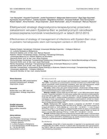 DOI: 10.5604/08606196.1215442 Post N Med 2016; XXIX(8): 537-541 ©Borgis *Jan Styczyński1, Krzysztof Czyżewski1, Jowita Frączkiewicz2, Małgorzata Salamonowicz2, Olga Zając-Spychała3, Agnieszka Zaucha-Prażmo4, Jolanta Goździk5, Magdalena Dziedzic1, Krzysztof Kałwak2, Ewa Gorczyńska2, Robert Dębski1, Anna Krenska1, Alicja Chybicka2, Jacek Wachowiak3, Jerzy R. Kowalczyk4, Mariusz Wysocki1 Efektywność strategii diagnostyczno-terapeutycznej przeciwko zakażeniom wirusem Epsteina-Barr w pediatrycznych ośrodkach przeszczepiania komórek krwiotwórczych w latach 2012-2015 Effectiveness of strategy of management of infections with Epstein-Barr virus in pediatric hematopoietic stem cell transplant centers in 2012-2015 1 Katedra Pediatrii, Hematologii i Onkologii, Uniwersytet Mikołaja Kopernika – Collegium Medicum im. Ludwika Rydygiera w Bydgoszczy Kierownik Katedry: prof. dr hab. med. Mariusz Wysocki 2 Katedra i Klinika Transplantacji Szpiku, Onkologii i Hematologii Dziecięcej, Uniwersytet Medyczny im. Piastów Śląskich we Wrocławiu Kierownik Kliniki: prof. dr hab. med. Alicja Chybicka 3 Klinika Onkologii, Hematologii i Transplantologii Pediatrycznej, Uniwersytet Medyczny im. Karola Marcinkowskiego w Poznaniu Kierownik Kliniki: prof. dr hab. med. Jacek Wachowiak 4 Klinika Hematologii, Onkologii i Transplantologii Dziecięcej, Uniwersytet Medyczny w Lublinie Kierownik Kliniki: prof. dr hab. med. Jerzy R. Kowalczyk 5 Ośrodek Transplantacji, Uniwersytecki Szpital Dziecięcy w Krakowie, Katedra Immunologii i Transplantologii Klinicznej, Uniwersytet Jagielloński – Collegium Medicum Kierownik Ośrodka: dr hab. med. Jolanta Goździk Słowa kluczowe Streszczenie wirus Epsteina-Barr, EBV, przeszczepianie komórek krwiotwórczych, strategia, diagnostyka, terapia Wstęp. Prawie 90% osób dorosłych jest bezobjawowym nosicielem wirusa Epsteina-Barr (EBV). U pacjentów po przeszczepieniu komórek krwiotwórczych (HSCT) EBV może jednak powodować rozwój poważnego powikłania, jakim jest poprzeszczepowy zespół limfoproliferacyjny (ang. post-transplant lymphoproliferative disorder – PTLD). Cel pracy. Celem pracy jest ocena funkcjonowania i skuteczności strategii diagnostyczno-terapeutycznej zakażeń EBV w polskich pediatrycznych ośrodkach przeszczepiania komórek krwiotwórczych w latach 2012-2015. Materiał i metody. Analizą objęto łącznie 650 HSCT, w tym 499 przeszczepień allogenicznych. Pacjentów podzielono na dwie grupy według daty wykonania przeszczepienia: grupa 2012-2013 (308 HSCT, w tym 232 allo-HSCT) oraz grupa 2014-2015 (342 HSCT, w tym 267 allo-HSCT). Analizie poddano pacjentów, u których wystąpiła reaktywacja EBV wymagająca terapii wyprzedzającej. Jednocześnie przeprowadzono ankietę we wszystkich krajowych pediatrycznych ośrodkach przeszczepowych dotyczącą strategii diagnostyczno-terapeutycznej zakażeń EBV. Wyniki. Reaktywacje EBV wystąpiły jedynie u pacjentów po allo-HSCT. W latach 2014-2015 częstość reaktywacji EBV wyniosła 24,3% (65/267) i była istotnie wyższa niż w latach 2012-2013, tj. 15,5% (36/232) (p = 0,014; OR = 1,8; 95%CI = 1,1-2,8). W latach 2012-2013 u 4/36 (11,1%) pacjentów z reaktywacją EBV doszło do zgonu w konsekwencji rozwoju PTLD. Natomiast w latach 2014-2015 u żadnego pacjenta (0/65) nie doszło do zgonu z powodu EBV-zależnego PTLD (p = 0,006; OR = 3,0; 95%CI = 2,3-4,0). Wnioski. Strategia diagnostyczno-terapeutyczna zakażeń EBV oparta o rekomendacje ECIL, stosowana w polskich pediatrycznych ośrodkach przeszczepiania komórek krwiotwórczych w latach 2012-2015 charakteryzuje się wysoką skutecznością terapeutyczną i może być rekomendowana do dalszej praktyki klinicznej. Keywords Epstein-Barr virus, EBV, stem cell transplantation, strategy, diagnostics, therapy Konflikt interesów Conflict of interest Brak konfliktu interesów None Adres/address: *Jan Styczyński Katedra Pediatrii, Hematologii i Onkologii Uniwersytet Mikołaja Kopernika – Collegium Medicum im. Ludwika Rydygiera w Bydgoszczy ul. Curie-Skłodowskiej 9, 85-094 Bydgoszcz tel. +48 (52) 585-48-60 [email protected] Summary Introduction. Almost 90% of adult population is regarded to be asymptomatic carrier of Epstein-Barr Virus (EBV). However, in patients after hematopoietic stem cell transplantation (HSCT), EBV can cause post-transplant lymphoproliferative disorder (PTLD), which is a life-threatening complication. 537 Jan Styczyński i wsp. Aim. The aim of the study was the analysis of efficacy of strategy of management of infections with EBV in Polish pediatric stem cell transplant centers in 2012-2015. Material and methods. A total number of 650 transplants, including 499 allogeneic HSCT, were included into the study. Patients were divided in two groups, according to date of transplant: group 2012-2013 (308 HSCT, including 232 allo-HSCT) and group 2014-2015 (342 HSCT, including 267 allo-HSCT). All patients who were diagnosed for EBV reactivation were followed-up for efficacy of preemptive anti-EBV therapy. The results of survey on existing strategy of management of diagnosis and therapy of EBV infections in transplant centers was also analyzed. Results. EBV reactivations occurred only in patients after allo-HSCT. In 2014-2015 the rate of EBV reactivations was 24.3% (65/267), thus being significantly higher than in 2012-2013, i.e. 15.5% (36/232) (p = 0.014; OR = 1.8; 95%CI = 1.1-2.8). In 2012-2013 in 4/36 (11.1%) patients with EBV reactivation fatal EBV-related PTLD has occurred, while in did not happen in any patient treated between 2014-2015 (p = 0.006; OR = 3.0; 95%CI = 2.3-4.0). Conclusions. Strategy of management of infections with EBV based on ECIL guidelines, used in Polish pediatric stem cell transplant centers in 2012-2015 resulted in high efficacy and might be recommended for further clinical practice. WSTĘP Zakażenia są jednym z najczęstszych powikłań u pacjentów po przeszczepieniu komórek krwiotwórczych (ang. hematopoieti
