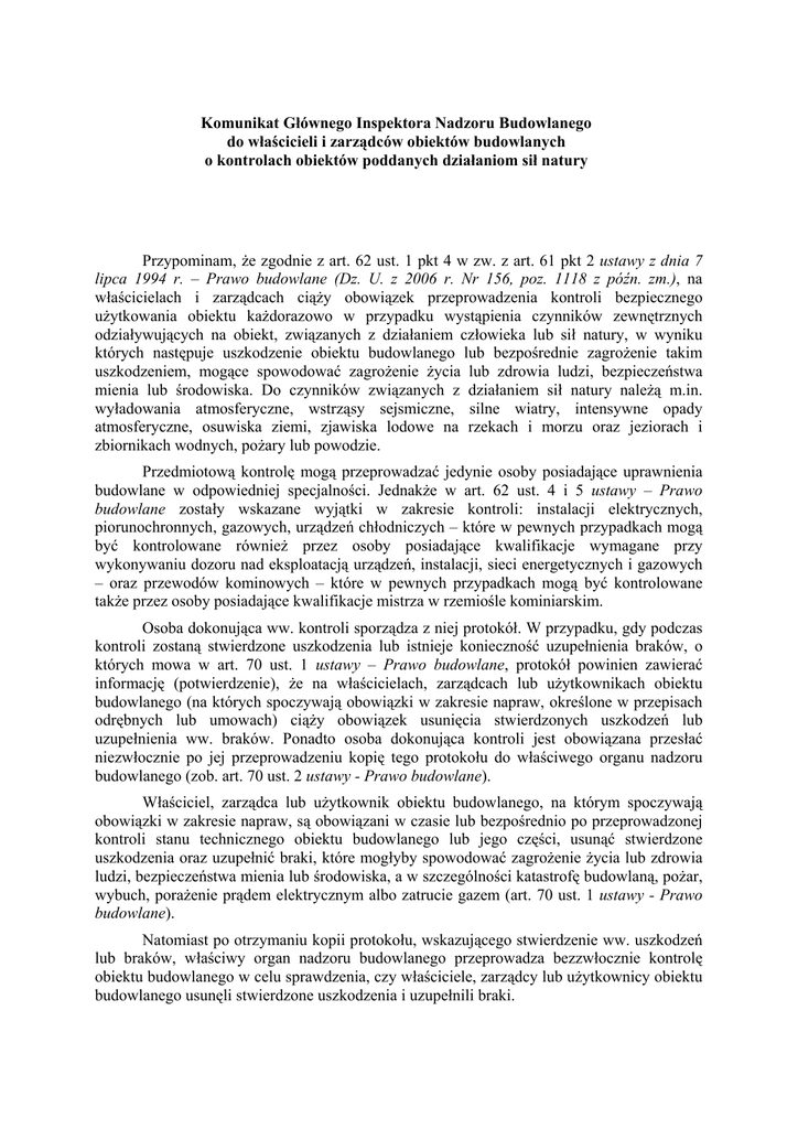 Komunikat Głównego Inspektora Nadzoru Budowlanego do właścicieli i zarządców obiektów budowlanych o kontrolach obiektów poddanych działaniom sił natury Przypominam, że zgodnie z art. 62 ust. 1 pkt 4 w zw. z art. 61 pkt 2 ustawy z dnia 7 lipca 1994 r. – Prawo budowlane (Dz. U. z 2006 r. Nr 156, poz. 1118 z późn. zm.), na właścicielach i zarządcach ciąży obowiązek przeprowadzenia kontroli bezpiecznego użytkowania obiektu każdorazowo w przypadku wystąpienia czynników zewnętrznych odziaływujących na obiekt, związanych z działaniem człowieka lub sił natury, w wyniku których następuje uszkodzenie obiektu budowlanego lub bezpośrednie zagrożenie takim uszkodzeniem, mogące spowodować zagrożenie życia lub zdrowia ludzi, bezpieczeństwa mienia lub środowiska. Do czynników związanych z działaniem sił natury należą m.in. wyładowania atmosferyczne, wstrząsy sejsmiczne, silne wiatry, intensywne opady atmosferyczne, osuwiska ziemi, zjawiska lodowe na rzekach i morzu oraz jeziorach i zbiornikach wodnych, pożary lub powodzie. Przedmiotową kontrolę mogą przeprowadzać jedynie osoby posiadające uprawnienia budowlane w odpowiedniej specjalności. Jednakże w art. 62 ust. 4 i 5 ustawy – Prawo budowlane zostały wskazane wyjątki w zakresie kontroli: instalacji elektrycznych, piorunochronnych, gazowych, urządzeń chłodniczych – które w pewnych przypadkach mogą być kontrolowane również przez osoby posiadające kwalifikacje wymagane przy wykonywaniu dozoru nad eksploatacją urządzeń, instalacji, sieci energetycznych i gazowych – oraz przewodów kominowych – które w pewnych przypadkach mogą być kontrolowane także przez osoby posiadające kwalifikacje mistrza w rzemiośle kominiarskim. Osoba dokonująca ww. kontroli sporządza z niej protokół. W przypadku, gdy podczas kontroli zostaną stwierdzone uszkodzenia lub istnieje konieczność uzupełnienia braków, o których mowa w art. 70 ust. 1 ustawy – Prawo budowlane, protokół powinien zawierać informację (potwierdzenie), że na właścicielach, zarządcach lub użytkownikach obiektu budowlanego (na których spoczywają obowiązki w zakresie napraw, określone w przepisach odrębnych lub umowach) ciąży obowiązek usunięcia stwierdzonych uszkodzeń lub uzupełnienia ww. braków. Ponadto osoba dokonująca kontroli jest obowiązana przesłać niezwłocznie po jej przeprowadzeniu kopię tego protokołu do właściwego organu nadzoru budowlanego (zob. art. 70 ust. 2 ustawy - Prawo budowlane). Właściciel, zarządca lub użytkownik obiektu budowlanego, na którym spoczywają obowiązki w zakresie napraw, są obowiązani w czasie lub bezpośrednio po przeprowadzonej kontroli stanu technicznego obiektu budowlanego lub jego części, usunąć stwierdzone uszkodzenia oraz uzupełnić braki, które mogłyby spowodować zagrożenie życia lub zdrowia ludzi, bezpieczeństwa mienia lub środowiska, a w szczególności katastrofę budowlaną, pożar, wybuch, porażenie prądem elektrycznym albo zatrucie gazem (art. 70 ust. 1 ustawy - Prawo budowlane). Natomiast po otrzymaniu kopii protokołu, wskazującego stwierdzenie ww. uszkodzeń lub braków, właściwy organ nadzoru budowlanego przeprowadza bezzwłocznie kontrolę obiektu budowlanego w celu sprawdzenia, czy właściciele, zarządcy lub użytkownicy obiektu budowlanego usunęli stwierdzone uszkodzenia i uzupełnili braki. Należy przy tym zaznaczyć, że przepisy karne przewidują sankcje za niezastosowanie się do obowiązku wynikającego z art. 70 ust. 1 ww. ustawy (zob. art. 92 ust. 1 pkt 2 ustawy Prawo budowlane), za utrzymanie obiektu budowlanego w nienależytym stanie technicznym (zob. art. 91a ustawy - Prawo budowlane), czy też za nieprzesłanie kopii protokołu, o którym mowa w art. 70 ust. 2 (zob. art. 93 pkt 9a ustawy - Prawo budowlane). Główny Inspektor Nadzoru Budowlanego Robert Dziwiński Warszawa, 1 września 2010 r.