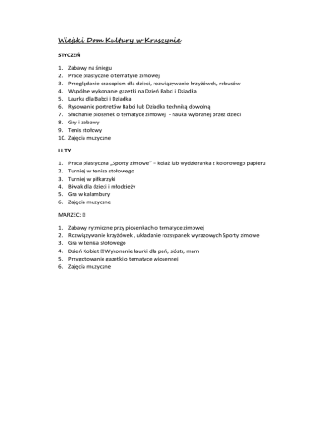 Wiejski Dom Kultury w Kruszynie STYCZEŃ 1. 2. 3. 4. 5. 6. 7. 8. 9. 10. Zabawy na śniegu Prace plastyczne o tematyce zimowej Przeglądanie czasopism dla dzieci, rozwiązywanie krzyżówek, rebusów Wspólne wykonanie gazetki na Dzień Babci i Dziadka Laurka dla Babci i Dziadka Rysowanie portretów Babci lub Dziadka techniką dowolną Słuchanie piosenek o tematyce zimowej - nauka wybranej przez dzieci Gry i zabawy Tenis stołowy Zajęcia muzyczne LUTY 1. 2. 3. 4. 5. 6. Praca plastyczna „Sporty zimowe” – kolaż lub wydzieranka z kolorowego papieru Turniej w tenisa stołowego Turniej w piłkarzyki Biwak dla dzieci i młodzieży Gra w kalambury Zajęcia muzyczne 1. 2. 3. 4. 5. 6. Zabawy rytmiczne przy piosenkach o tematyce zimowej Rozwiązywanie krzyżówek , układanie rozsypanek wyrazowych Sporty zimowe Gra w tenisa stołowego Przygotowanie gazetki o tematyce wiosennej Zajęcia muzyczne