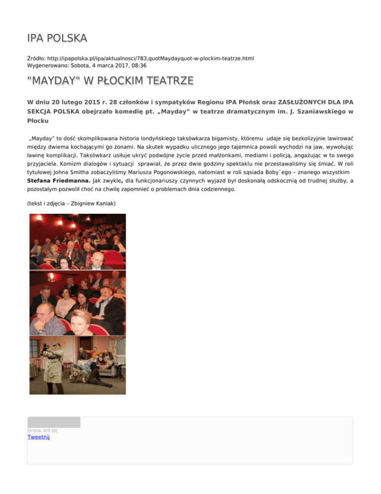 IPA POLSKA Źródło: http://ipapolska.pl/ipa/aktualnosci/783,quotMaydayquot-w-plockim-teatrze.html Wygenerowano: Sobota, 4 marca 2017, 08:36 "MAYDAY" W PŁOCKIM TEATRZE W dniu 20 lutego 2015 r. 28 członków i sympatyków Regionu IPA Płońsk oraz ZASŁUŻONYCH DLA IPA SEKCJA POLSKA obejrzało komedię pt. „Mayday” w teatrze dramatycznym im. J. Szaniawskiego w Płocku „Mayday” to dość skomplikowana historia londyńskiego taksówkarza bigamisty, któremu udaje się bezkolizyjnie lawirować między dwiema kochającymi go żonami. Na skutek wypadku ulicznego jego tajemnica powoli wychodzi na jaw, wywołując lawinę komplikacji. Taksówkarz usiłuje ukryć podwójne życie przed małżonkami, mediami i policją, angażując w to swego przyjaciela. Komizm dialogów i sytuacji sprawiał, że przez dwie godziny spektaklu nie przestawaliśmy się śmiać. W roli tytułowej Johna Smitha zobaczyliśmy Mariusza Pogonowskiego, natomiast w roli sąsiada Boby`ego – znanego wszystkim Stefana Friedmanna. Jak zwykle, dla funkcjonariuszy czynnych wyjazd był doskonałą odskocznią od trudnej służby, a pozostałym pozwolił choć na chwilę zapomnieć o problemach dnia codziennego. (tekst i zdjęcia – Zbigniew Kaniak) Ocena: 0/5 (0) Tweetnij