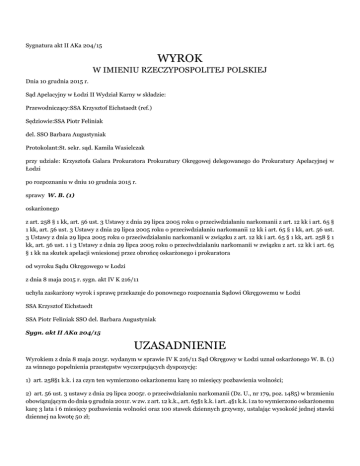 Sygnatura akt II AKa 204/15 WYROK W IMIENIU RZECZYPOSPOLITEJ POLSKIEJ Dnia 10 grudnia 2015 r. Sąd Apelacyjny w Łodzi II Wydział Karny w składzie: Przewodniczący:SSA Krzysztof Eichstaedt (ref.) Sędziowie:SSA Piotr Feliniak del. SSO Barbara Augustyniak Protokolant:St. sekr. sąd. Kamila Wasielczak przy udziale: Krzysztofa Galara Prokuratora Prokuratury Okręgowej delegowanego do Prokuratury Apelacyjnej w Łodzi po rozpoznaniu w dniu 10 grudnia 2015 r. sprawy W. B. (1) oskarżonego z art. 258 § 1 kk, art. 56 ust. 3 Ustawy z dnia 29 lipca 2005 roku o przeciwdziałaniu narkomanii z art. 12 kk i art. 65 § 1 kk, art. 56 ust. 3 Ustawy z dnia 29 lipca 2005 roku o przeciwdziałaniu narkomanii 12 kk i art. 65 § 1 kk, art. 56 ust. 3 Ustawy z dnia 29 lipca 2005 roku o przeciwdziałaniu narkomanii w związku z art. 12 kk i art. 65 § 1 kk, art. 258 § 1 kk, art. 56 ust. 1 i 3 Ustawy z dnia 29 lipca 2005 roku o przeciwdziałaniu narkomanii w związku z art. 12 kk i art. 65 § 1 kk na skutek apelacji wniesionej przez obrońcę oskarżonego i prokuratora od wyroku Sądu Okręgowego w Łodzi z dnia 8 maja 2015 r. sygn. akt IV K 216/11 uchyla zaskarżony wyrok i sprawę przekazuje do ponownego rozpoznania Sądowi Okręgowemu w Łodzi SSA Krzysztof Eichstaedt SSA Piotr Feliniak SSO del. Barbara Augustyniak Sygn. akt II AKa 204/15 UZASADNIENIE Wyrokiem z dnia 8 maja 2015r. wydanym w sprawie IV K 216/11 Sąd Okręgowy w Łodzi uznał oskarżonego W. B. (1) za winnego popełnienia przestępstw wyczerpujących dyspozycję: 1) art. 258§1 k.k. i za czyn ten wymierzono oskarżonemu karę 10 miesięcy pozbawienia wolności; 2) art. 56 ust. 3 ustawy z dnia 29 lipca 2005r. o przeciwdziałaniu narkomanii (Dz. U., nr 179, poz. 1485) w brzmieniu obowiązującym do dnia 9 grudnia 2011r. w zw. z art. 12 k.k., art. 65§1 k.k. i art. 4§1 k.k. i za to wymierzono oskarżonemu karę 3 lata i 6 miesięcy pozbawienia wolności oraz 100 stawek dziennych grzywny, ustalając wysokość jednej stawki dziennej na kwotę 50 zł; 3) art. 56 ust. 3 ustawy z dnia 29 lipca 2005r. o przeciwdziałaniu narkomanii (Dz. U., nr 179, poz. 1485) w brzmieniu obowiązującym do dnia 9 grudnia 2011r. w zw. z art. 12 k.k., art. 65§1 k.k. i art. 4§1 k.k. i za to wymierzono oskarżonemu karę 2 lata i 6 miesięcy pozbawienia wolności oraz 80 stawek dziennych grzywny, ustalając wysokość jednej stawki dziennej na kwotę 50 zł. Za pozostające w zbiegu realnym przestępstwa sąd meriti orzekł wobec oskarżonego karę łączną 4 lata i 6 miesięcy pozbawienia wolności oraz 150 stawek dziennych grzywny, ustalając wysokość jednej stawki dziennej na kwotę 50 zł. Apelacje od wyroku sądu I instancji w ustawowym terminie wnieśli prokurator oraz obrońca oskarżonego. Oskarżyciel publiczny zaskarżył wyrok sąd meriti w całości na niekorzyść oskarżonego, podnosząc zarzut błędu w ustaleniach faktycznych, wnosił o uchylenie zaskarżonego wyroku i przekazanie sprawy do ponownego rozpoznania sądowi I instancji (zobacz szerzej zarzut i wniosek apelacyjny k. 1496). Obrońca oskarżonego także zaskarżył przedmiotowy wyrok w całości, podnosząc liczne zarzuty naruszenia prawa procesowego, zarzut błędu w ustaleniach faktycznych oraz zarzut rażącej niewspółmierności kary. Obrońca oskarżonego formułując liczne wnioski apelacyjne w podstawowym wniosku wnosił przede wszystkim o uchylenie wyroku i przekazanie niniejszej sprawy do ponownego rozpoznania sądowi meriti (zobacz szerzej zarzuty i wnioski apelacyjne k. 1503-1506). Sąd Apelacyjny zważył, co następuje. Wniesione apelacje skutkować musiały wydaniem orzeczenia kasatoryjnego, a to z uwagi na liczne uchybienia proceduralne, które w efekcie mogły mieć wpływ na treść wydanego wyroku. Rację ma obrońca oskarżonego wskazując w pisemnym środku odwoławczym na brak dokładnych ustaleń faktycznych. Brak bowiem w pisemnych motywach wyroku wyraźnego ustalenia, z którego wynikałoby, iż oskarżony W. B. (1) działał w zorganizowanej grupie przestępczej, mimo iż zostało przypisane mu w zaskarżonym wyroku popełnienie przestępstwa wyczerpującego dyspozycję art. 258§1 k.k. Stanowi to nie tylko naruszenie przepisu art. 424§1 k.p.k., ale sprawia iż istnieje sprzeczność pomiędzy ustaleniami sądu, które jednoznacznie nie wskazują na działanie oskarżonego w zorganizowanej grupie przestępczej, a treścią wyroku, w którym przypisano oskarżonemu popełnienie przestępstwa z art. 258§1 k.k. Odnosząc się do kwestii związanej z popełniłem przestępstwa z art. 258§1 k.k., w pierwszej kolejności odnotować należy, iż kodeks karny przewiduje odpowiedzialność za samo branie udziału w zorganizowanej grupie albo związku mających na celu popełnienie przestępstwa lub przestępstwa skarbowego. Znamienne jest jednak to, iż przepisy ustawy nie zawierają definicji legalnej pojęcia „zorganizowana grupa” oraz „związek mający na celu popełnianie przestępstw”, pozostawiając tą kwestię do rozstrzygnięcia orzecznictwu. Dokonując wykładni językowej terminu zorganizowana grupa przestępcza warto zwrócić uwagę, iż zgodnie ze słownikiem języka polskiego pod pojęciem terminu „zorganizować” rozumie się ułożenie czegoś w pewne formy, podporządkowanie regułom, normom, wprowadzić do czegoś ład, organizację, natomiast poprzez określenie „zostać zorganizowanym” rozumie się ujęcie czegoś w pewne formy, podporządkowane pewnym regułom (M. Szymczak, Słownik języka polskiego PWN, Warszawa 1996r., tom III, s. 987). W literaturze oraz orzecznictwie podkreśla się, iż zorganizowana grupa przestępcza jest ugrupowaniem, co najmniej trzech osób, mającym na celu popełnienie przestępstwa lub przestępstw, które nie musi posiadać trwałej, rozwiniętej struktury oraz długofalowego programu działania jak związek przestępczy, jednakże charakteryzuje się elementami zorganizowania, w tym określonym podzia